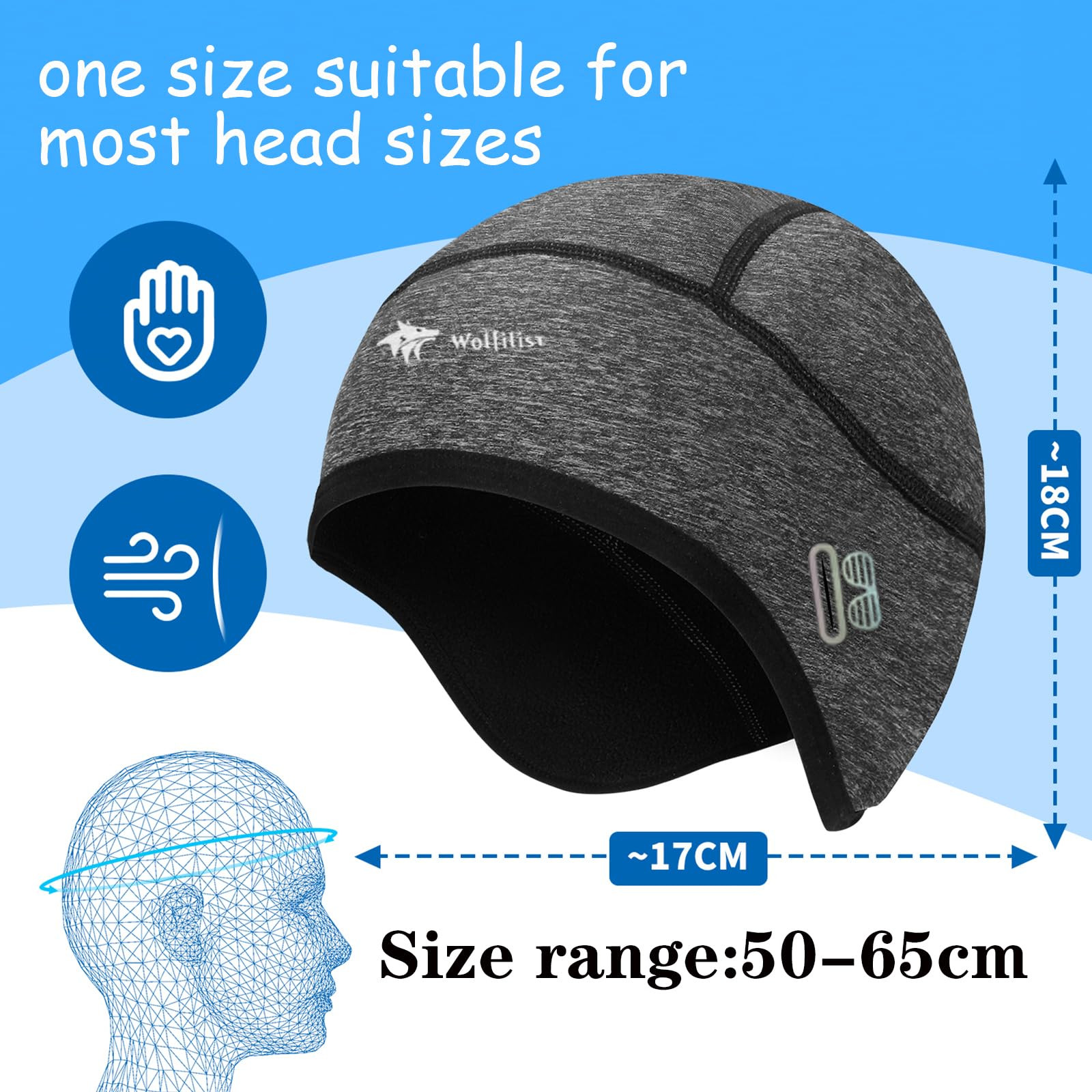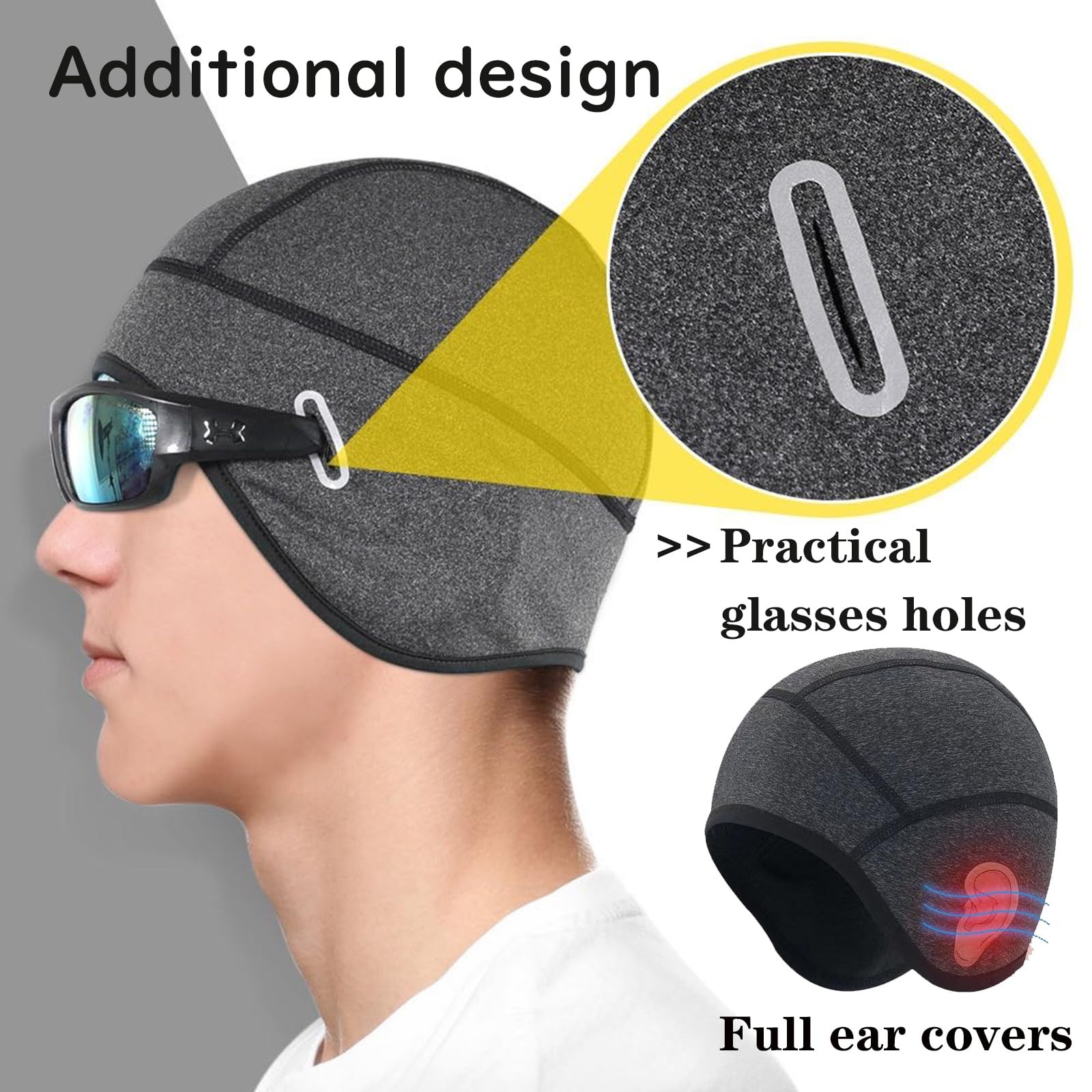 Skull Cap Helmet Liner for Men Women — One size cycling cap with excellent elasticity, suitable for adults to wear under US hat size 8 ; Fleece skull cap beanie for ski, running, cycling or just need to keep warm Thermal Fleece Winter Cycling Hat — Lined with thermal polar fleece which is a blend of polyester & spandex microfiber, keeps your head and ear warm and cozy under helmet in cold days Sweat Wicking Hard Hat Liner — Warm skull cap lined with soft fleece can be absorbent while retaining heat with the right thickness that is not too tight to make you feel uncomfortable under helmet Water-Resistant & Windproof Ski Hat — The smooth and durable out layer will block the wind and snow, can be a must-have for ski, motorcycle, snowboarding ; lightweight and breathable skull cap beanie that can boost your performance Perfect Match with Glasses and Helmet — Skull cap with glasses holes and reflective logo, flexible wear with glasses, ski goggles ; High-cut front and side down ear covers to fit perfectly with helmet, which is better than usual beanie