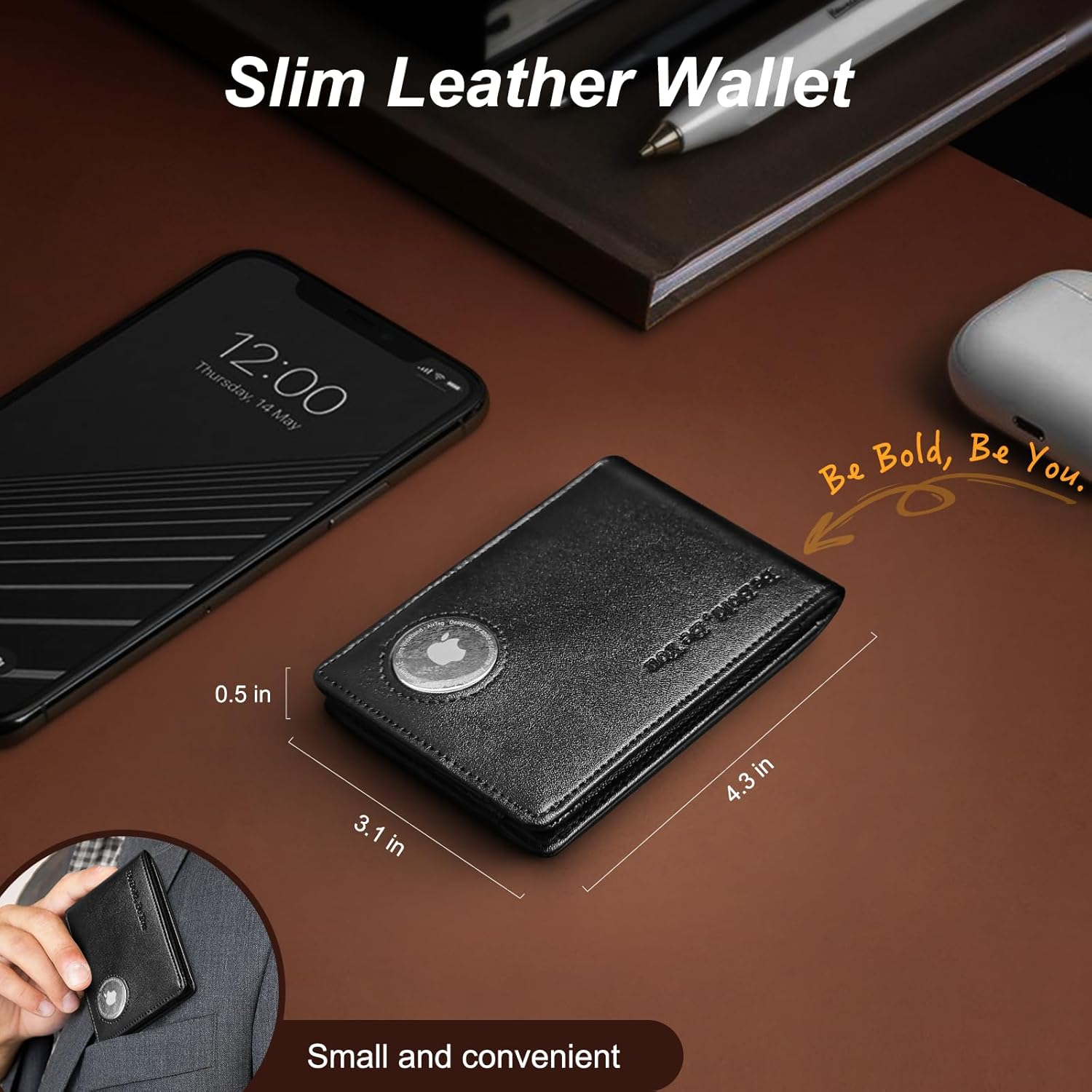 Genuine Leather Mens Wallet: Our wallet is crafted from high-quality genuine leather, exuding an exquisite and durable feel. The soft leather not only offers a superb touch but also grows more beautiful with time. This mens slim wallet, in classic black, exudes an air of sophistication. It suits various gifting occasions and can complement different fashion styles. Minimalist Wallet Stylish Design: Younglds' bifold men's leather wallet is slim and fashionable, featuring a minimalist front pocket design. It easily fits into your front or back pocket, providing ample space without feeling bulky. It can hold up to 9 cards and cash, along with an independent zippered coin pocket, adding practicality to your daily carry. It's a lightweight and practical companion for your outings. RFID Blocking & Anti-Loss Wallet: This AirTag wallet utilizes advanced RFID shielding technology to protect your cards from unauthorized scanning, ensuring the safety of your personal information. Our innovative design also includes an AirTag slot, making it easy to track your wallet using Apple's advanced tracking technology, offering you peace of mind (Note: AirTag is not included in the shipment). Empowering Motto: The front of the folding wallet bears an inspiring message, "Be Bold, Be You," encouraging you to embrace your unique style, let our wallet be an extension of your confidence. This wallet is more than just a stylish accessory,carry it proudly, always remembering to be bold and unapologetically yourself, it's a special gift for the special person. The Perfect Gift For Him: Are you looking for a thoughtful gift for him? Unbox the complete experience, which includes a handwritten greeting card and a decorative bow, adding an extra touch of elegance. This AirTag wallet is suitable for birthdays, anniversaries, graduation,various holidays, or any special occasion. It's also perfect for celebrating and customizing your personalized wishes, leaving a lasting impression, It's the ultimate gift. Product Description Looking for the perfect gift for him? Our men's wallet is a good ideal ! 1) Crafted with genuine leather and attention to detail, our slim wallet is a symbol of quality and style. 2) It comes with a beautifully designed blank card for you to write your heartfelt message. 3) The charming butterfly bow adds an elegant touch to the gift package. 4) Customize your message to make this gift even more special. 5) Elevate your gift-giving with our elegant wallet and thoughtful presentation. 6) Perfect for any occasion: birthdays, anniversaries, graduations,father's day, thanksgiving, christmas and more. Our product doesn't just offer a wallet,it presents a thoughtful and complete gift package, so you can pen your personalized wishes and heartfelt messages.a delightful addition to make your gift even more special. Chest Pocket This unique design offers easy access and keeps your essentials within reach on your chest or abdomen. Inner Lining Pocket For formal occasions or suits, the inner lining pocket is a discreet and stylish option for your minimalist wallet. It's perfect for carrying essential cards while maintaining a sleek appearance. Front Pocket Wallet The front pants pocket is the ideal spot for your minimalist wallet. Its slim design allows it to comfortably fit in this pocket, giving you quick and easy access whenever needed.You can also carry it in the back pants pocket. RFID Blocking Wallet RFID is a technology that uses radio signals to identify bank cards and obtain personal information and related data within short distances. Added anti-theft lining can shield these radio waves, protecting your privacy, preventing data leakage, and ensuring credit card security. Wallet with Airtag Holder Our mens wallet includes a dedicated AIRTAG pocket, allowing you to easily locate it and ensuring your peace of mind during your travels. (Please note: AIRTAG is not included with your purchase) Complete Gifting Package Perfect Men's Wallet * 1 Blank greeting card * 1 Greeting card envelope * 1 Pre-tied decorative bow * 1 Embrace Your Unique Style with 'Be Bold, Be You' Our 'Be Bold, Be You' wallet isn't just a sleek accessory; it's a statement. This phrase encapsulates the spirit of individuality, encouraging you to express your unique style with confidence. It's a reminder that being true to yourself and your choices is the boldest and most beautiful thing you can do.