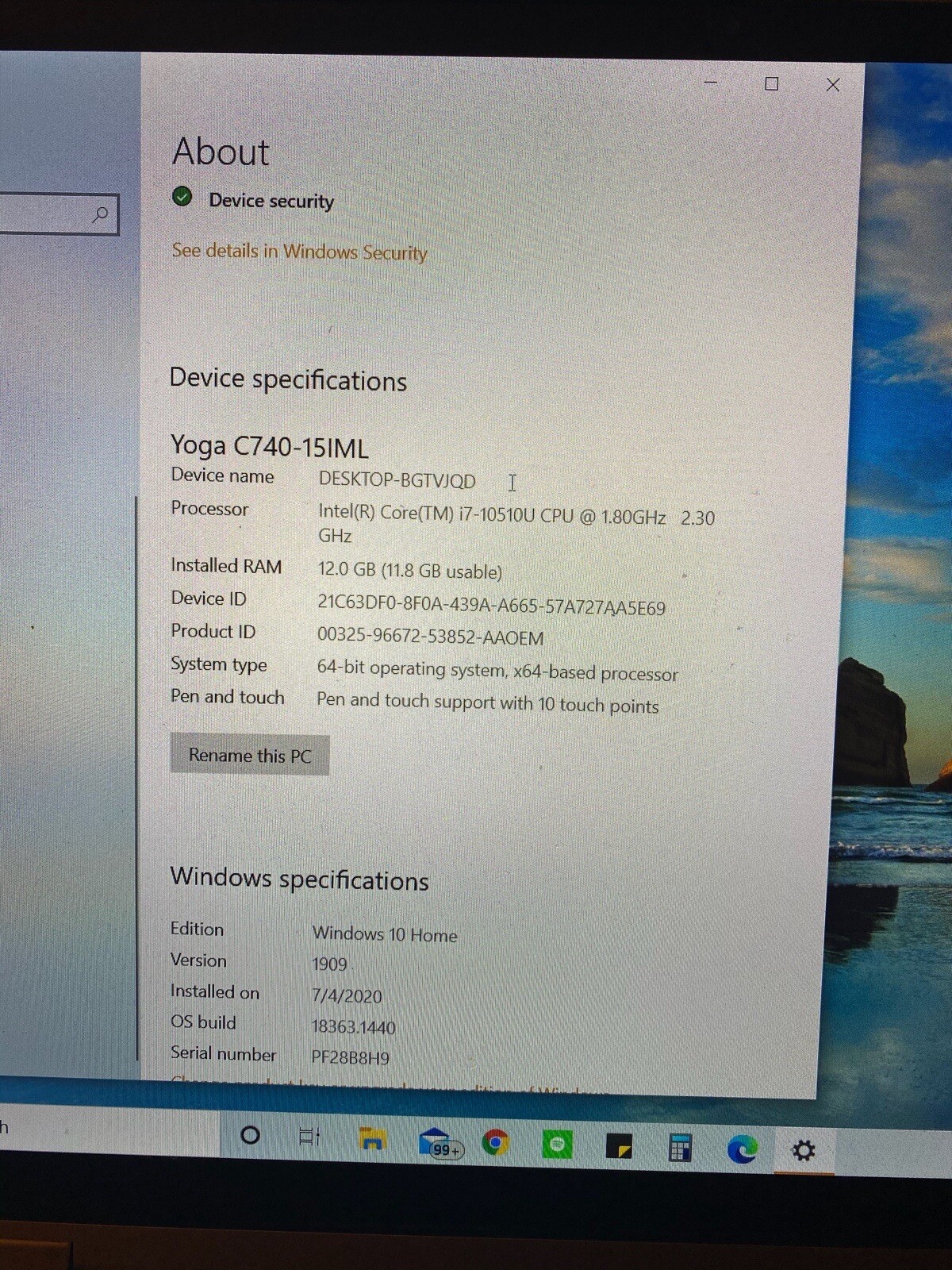 Lenovo Yoga C740 2k 1 touchscreen laptop. 15.6” screen. Intel core i7. 12GB RAM. 512GB SSD