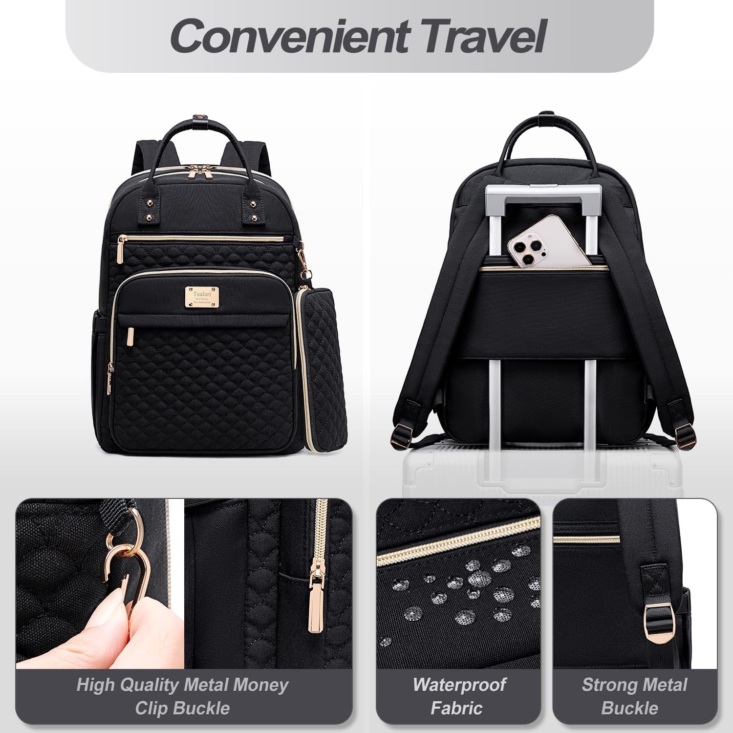 1 【Fashion Laptop Backpack&Wallet】 The laptop backpack with wallet set, made of water resistant, scratch-resistant and tear-resistant nylon fabric. High quality custom striped cotton lining, exquisite gold-plated zippers, smooth and durable. Backpack size: 12"L x 8"W x 17"H, wallet size: 4.5"L x 9"H, Backpack capacity: 30L, Weight 2 lbs, easy to carry, making it convenient for daily use 【Large Capacity Travel Backpack】 Laptop backpack total 5 compartments and 16 pockets: 2 large main compartments,1 separate laptop compartment fits 15.6 inch laptop,1 iPad compartment and 1 wet and dry separation compartment, to hold the laptop, iPad, phones, charger, folder, water bottle, umbrella,napkin,magazines, clothes, pens, wallets, and more, ample pockets keep your travel items perfectly placed 【Multi-Functional Computer Backpack for Work】 The backpack is designed with a separate laptop foam cotton protective compartment,The wet and dry separation pocket on the front can hold wet towels and cosmetics.The anti-theft pocket on the back makes your passport, wallet, mobile phone and other valuables safer without worrying about being stolen.The back luggage strap allows you to easily secure the backpack to the trolley case, making your work travel easier and more enjoyable 【Multi-Purpose Water Resistant Backpack】 This women’s backpack can be used in all scenarios, perfect for work, business, college, travel, travel by plane, daily use and outdoor activities. Can be used as a work backpack, college backpack, casual backpack, travel backpack, airplane travel backpack, teacher backpack and nurse backpack 【Perfect Design&High-Quality College Backpack】 The appearance of this women's laptop backpack is made of delicate quilting design, the outer fabric is made of high-end water resistant nylon material, with striped cotton lining. You can always trust that it's stylish and perfect, handles are reinforced with rivets, and every stress point of the backpack is reinforced and sewn for absolute durability. It is the best choice for gift giving