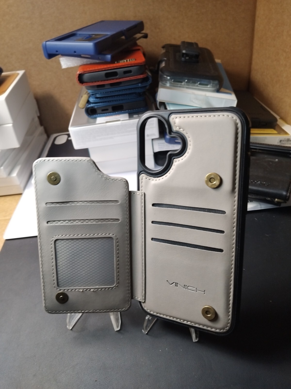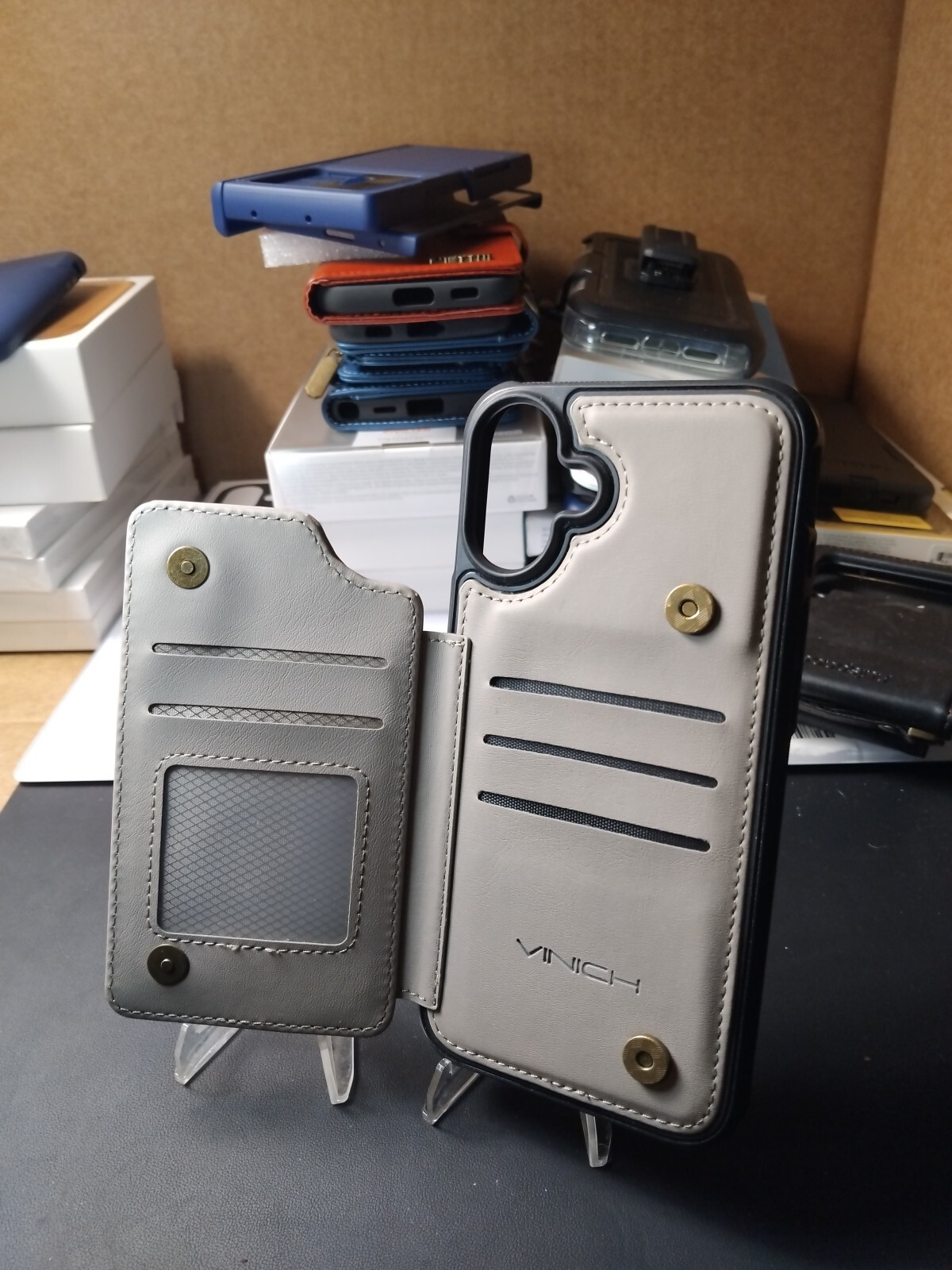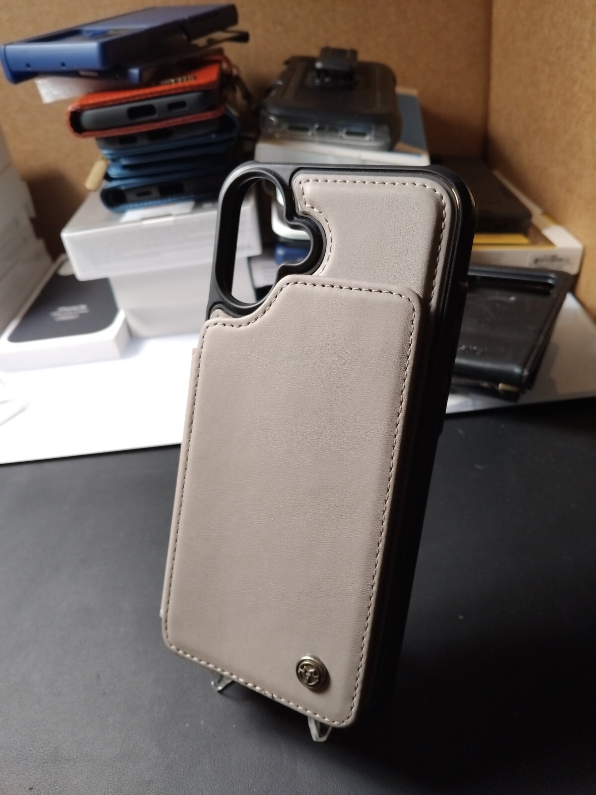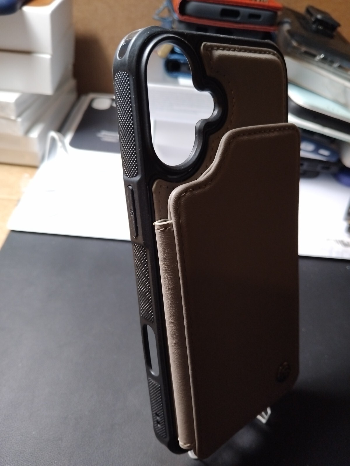 This is a brown leather wallet case designed for the iPhone 16 Plus. It includes a card holder and is shockproof. The case is slim and plain in design, with a hard case included for protection. It is compatible with Qi wireless charging and features a holder for added convenience.