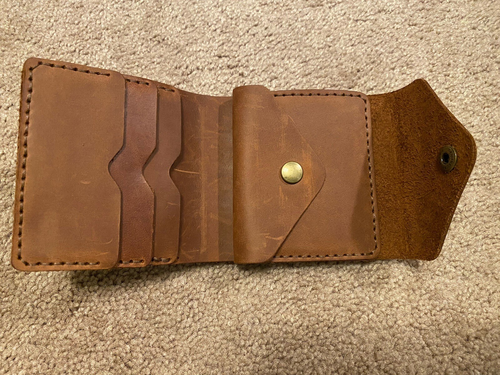 This wallet is a fantastic blend of style and function! The cognac brown leather is rich and durable, with a soft yet sturdy feel. The slim trifold design keeps it compact, while the button closure adds security. Love the four card slots, cash section, and handy coin pouch—perfect for keeping everything organized. Ideal for anyone who wants a minimalist yet practical leather wallet. Very pleased with the quality!