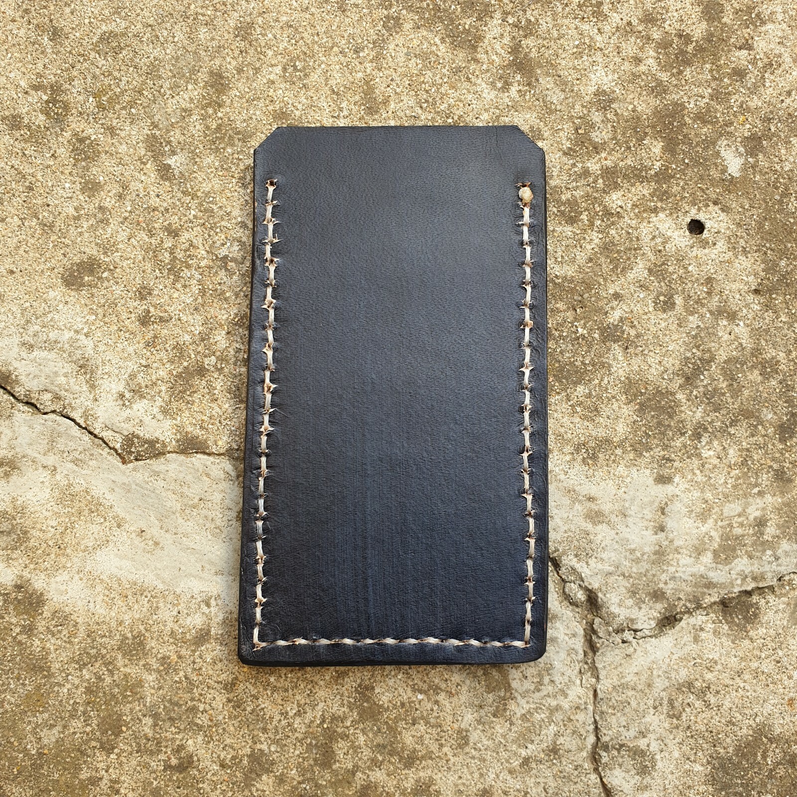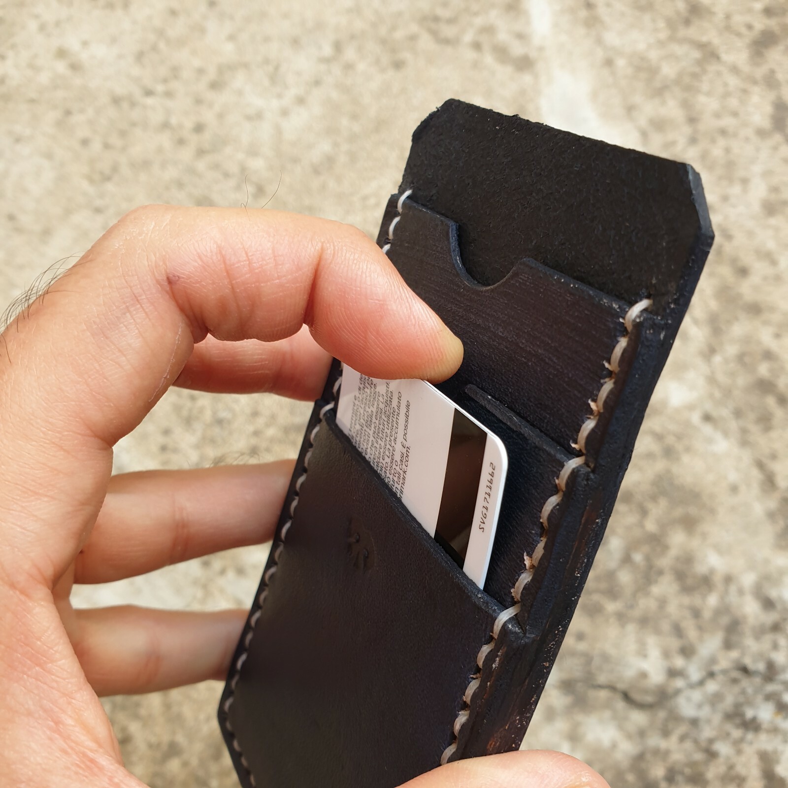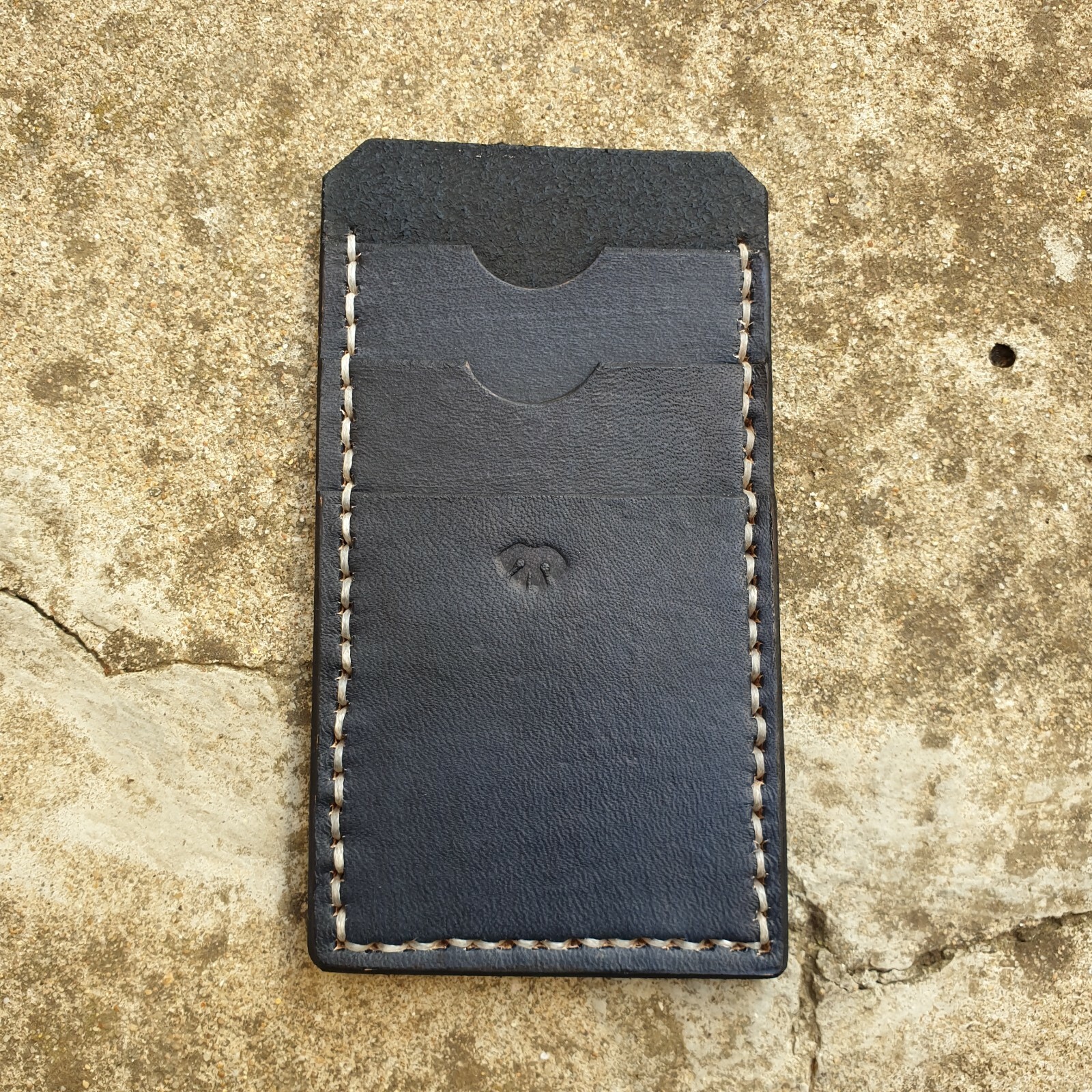 Leather Card Holder. Totally handmade, blue dye and white stitch. The semicircular cuts helps to remove the cards. Very thin, is unnoticeable in the pocket. Made from a model I've made for myself years ago that i use still today, is very resistant and durable