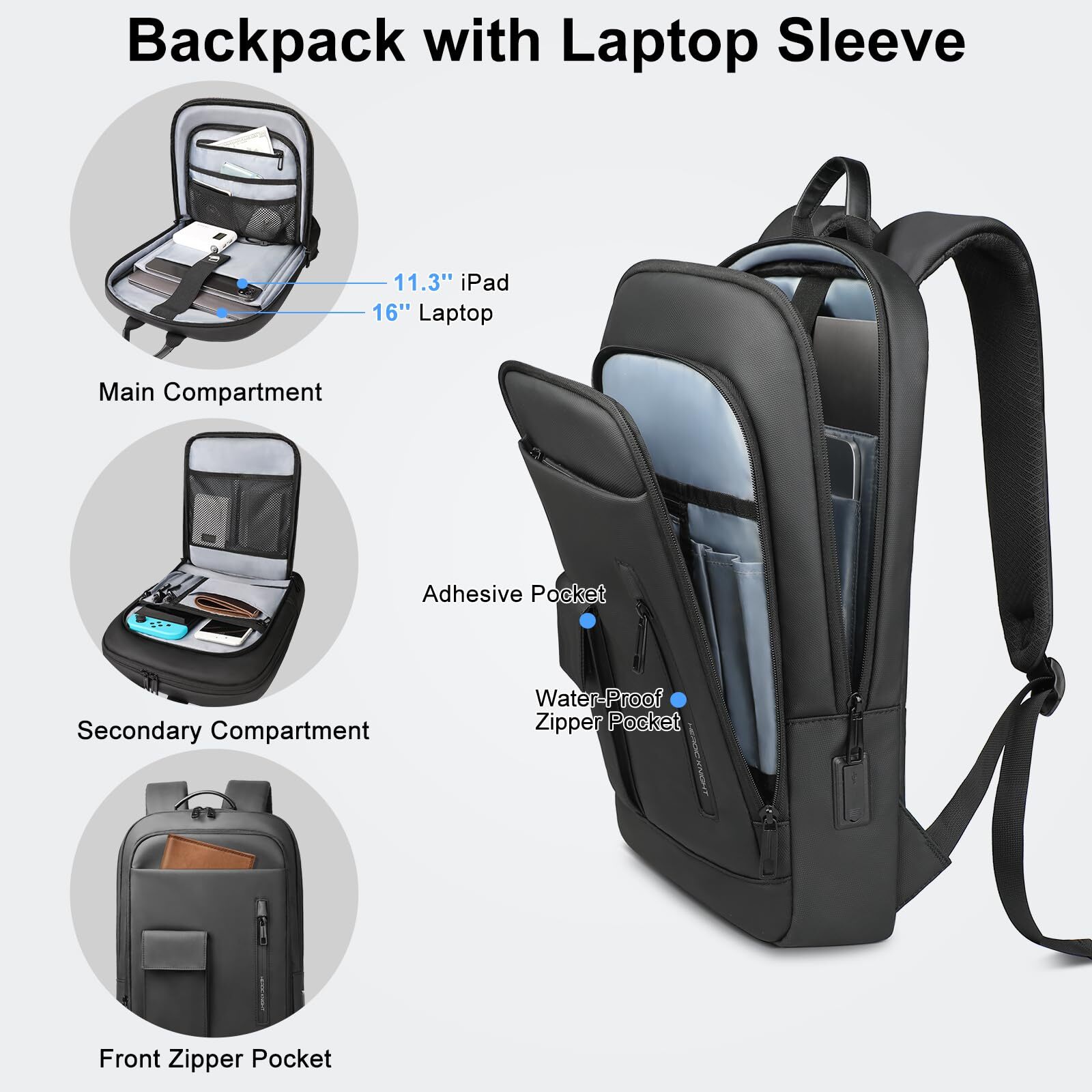 Original & Human Design by the brand - The Slim Laptop Backpack is a new backpack for men and women. The laptop backpack for men is 16.5 * 11.8 * 3 Inch, suitable for a 16 Inch Laptop and 11.3 Inch iPad, which is a small and thin backpack, but perfect for daily, office, and business use. Slim & Light-weight & Large Capacity - The ultralight laptop backpacks are made with lightweight materials, only 1.45 LB, Volumen: 8 L. the simple backpack reducing overall weight and making long-term carrying more comfortable. The computer backpack for men is flexible and suitable for short trips, daily commuting, and outdoor activities such as hiking and cycling. USB Charging Port - The business backpack for men has built in USB charger outside and built in charging cable inside the book bag, you can charge your phone (also can be charged inside) conveniently without opening up the adult backpack. Detachable Cable inside convenient for cleaning the commuter backpack and Inside Side Pocket is design for prevent your Power Bank moving around and same space. Durable & Comfortable - Despite being lightweight, our backpack with laptop sleeve for men women are carefully designed and crafted, maintaining a certain level of durability and load-bearing capacity to meet daily needs. Stylish and versatile design of charger backpack is suitable for various occasions such as daily commuting, work,college or leisure travel. Easy to Organize - This laptop backpack for men has various practical compartments and pockets: main pocket*1, front pocket*1, padded sleeve for laptop *2, mesh pocket *4,normal pocket*3, zipper pocket*3, pocket for pen*3, card pocket*1. The durable backpack for men can provide roomy space for your laptop(fits up to 15.6"), iPad, folder, pens, books, purse, tablet, power bank, ect. Keeping your items organized and easy to find. Multi-use - The Slim Laptop Backpack can be used as backpack laptop bag for men, casual daypack backpacks, anti theft travel backpack, black backpack with charger, backpack with pockets and compartments, best waterproof backpack, small lightweight backpack, utility backpack for men, fashion backpack for men, compact laptop backpack, organized backpack,rugged laptop backpack, carryon backpack which is a perfect gift for family, husband, parents, colleagues, boyfriend..etc.