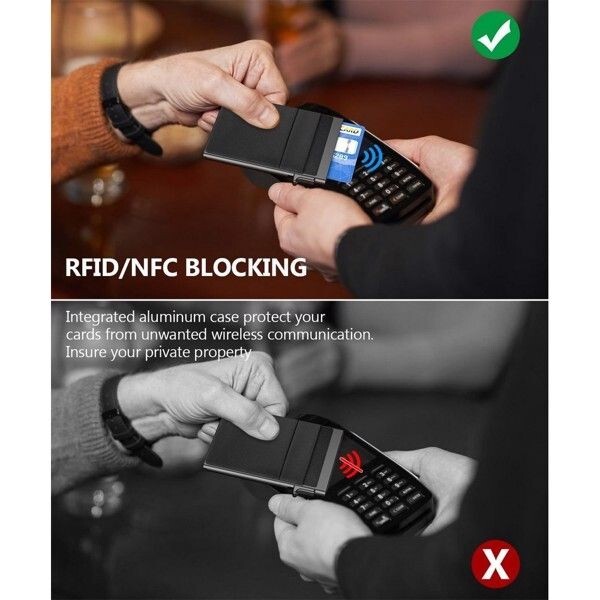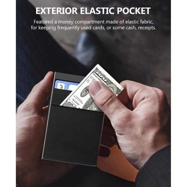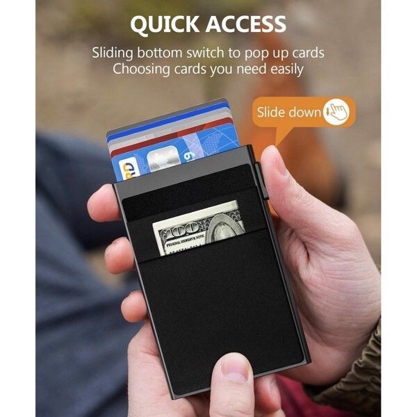 Details 1. Slim and Minimalist Design Our Credit Card Holder is designed with a slim and minimalist profile, making it easy to carry in your pocket without adding bulk. It's the perfect choice for men who prefer a sleek and stylish wallet. 2. Money Pocket In addition to holding up to 5 cards, this wallet also features a money pocket, allowing you to keep your cash and cards organized in one place. 3. Pop Up Feature The pop up design makes it easy to access your cards quickly and conveniently. With a simple push, your cards will spring up for easy selection. 4. RFID Blocking Protect your personal information from RFID skimming with our built-in RFID blocking technology. Keep your cards and identity safe from electronic theft. 5. High-Quality Materials Crafted from high-quality materials, this credit card holder is built to last. It's durable, stylish, and will provide you with years of reliable use.