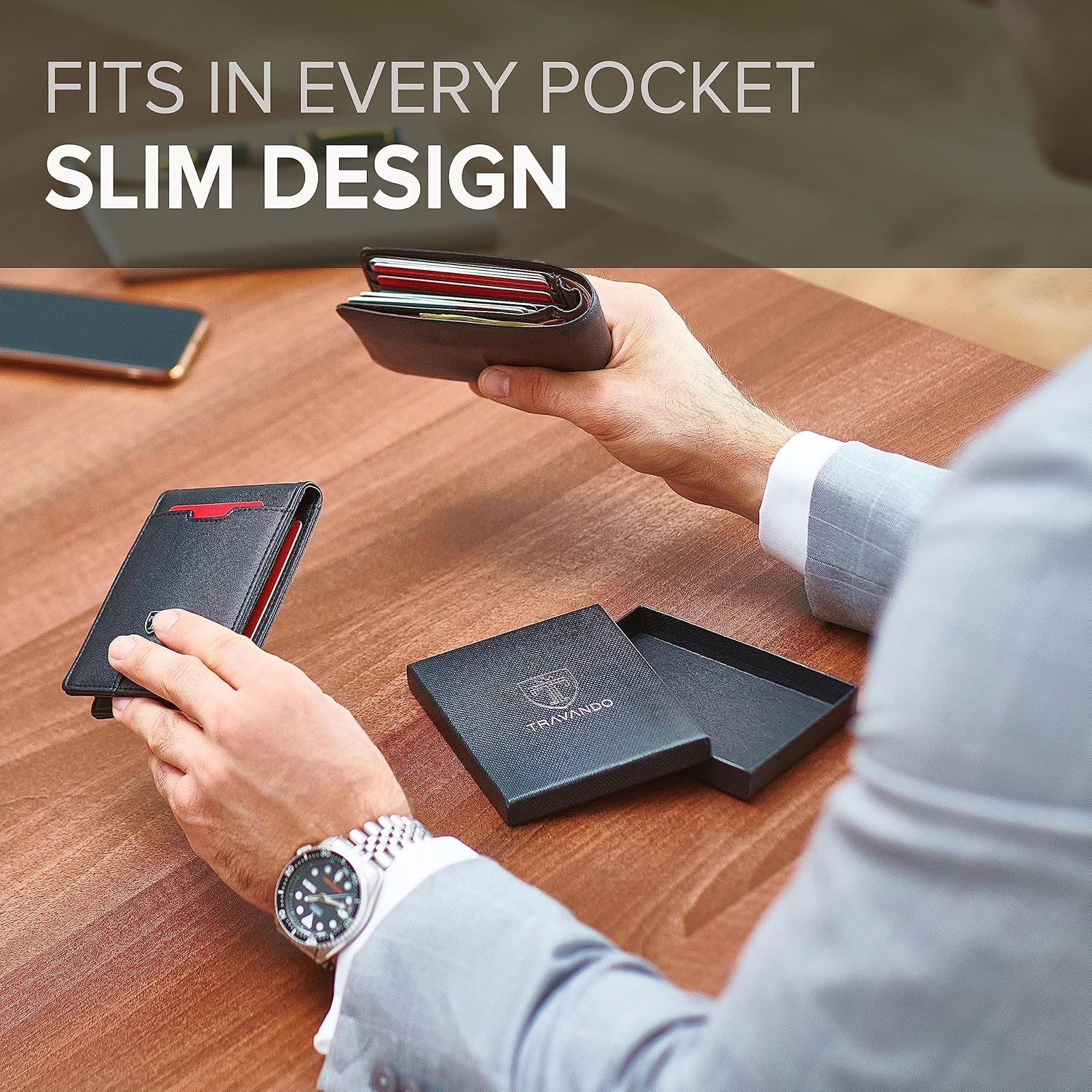 Store New Arrivals Add to Favorite View Feedback Contact Money Clip Wallet RIO - Mens Wallets Slim Front Pocket RFID Blocking Card Holder Minimalist Mini Bifold Gift Box Description Department mens Color Black & Blue Material Type Leather Product Description Bring a breath of fresh air to your accessory collection! With the modern TRAVANDO wallet model ”RIO” The slim wallet RIO presents itself in a modern way with the right amount of card slots and an integrated stainless steel money clip. The classy design is emphasized by the metal emblem A high-quality accessory that captivates with its clear graphic line Product details: 7 Card slots Stainless-steel money clip RFID-protection for all cards Classy metal emblem Dimensions: 4.7" in x 3.0" in x 0.7" in (closed and empty) Weight: 2.4 oz (empty weight) Material: Premium faux leather Quality you can feel TRAVANDO wallets are made from carefully selected, quality-tested materials that are assembled with the utmost precision for long-lasting durability Trim dimensions This elegant, slim wallet is designed to fit perfectly in any trouser pocket without bulging Industry-tested security All of our wallets are tested by an independent German quality control institute (TÜV Saarland)on20.08.2018. Our wallets block the most commonly used 13.56 MHz band and protect against data theft by RFID and NFC scanners Intelligently designed functionality Thanks to the clever layout of card slots and money clips, the wallet offers enough space for all your needs, yet is slim and won’t bulge your pocket Gift idea The wallet comes in luxurious gift packaging to make it the perfect present. The box can be re-purposed as an elegant storage container for jewelry TRAVANDO is one-of-a-kind TRAVANDO is the original fashion label for money clip wallets. We believe that wallets do so much more than just hold money. They are a statement and show the world what we are made of. Our products epitomize our constant striving for progress ABOUT US We offer the best prices around on high quality products. Our E-store includes media such as books, movies, music and games while offering electronics, toys, sporting apparel, clothing, tools, general home, garden items and more. SHIPPING We are always working hard to ensure your package arrives as soon as possible. Please understand that some factors like weather, high postal traffic, and the performance of shipping companies are outside of our control. We offer free shipping to the lower 48 states and ship within 2 business days of payment, usually sooner. We do not accept P.O. Boxes. Please provide a physical address. For shipping outside of the continental USA, we only use eBay's Global Shipping Program.The item is shipped to KY and then sent to the rest of the world. International customers are responsible for all duties and taxes. Continue to check out in order to calculate costs for shipping the item to your country. Messages regarding eBay's Global Shipping Program MUST be directed at eBay EXCLUSIVELY. RETURNS We offer a 30-Day Return Policy on items which you are not completely satisfied with. You have the option for a full-refund or an exchange of the item. No returns are available on items shipped outside of the USA. PAYMENT We accept PayPal. CONTACT US This page content is yet to come Please ad us to your favorite seller and visit again later Thank You CUSTOMER SATISFACTION We try our very best to make sure every customer is completely satisfied. If there's a problem, message us! We're happy to help. WE ACCEPT Copyright © 2021 AutoDS. | All Rights Reserved