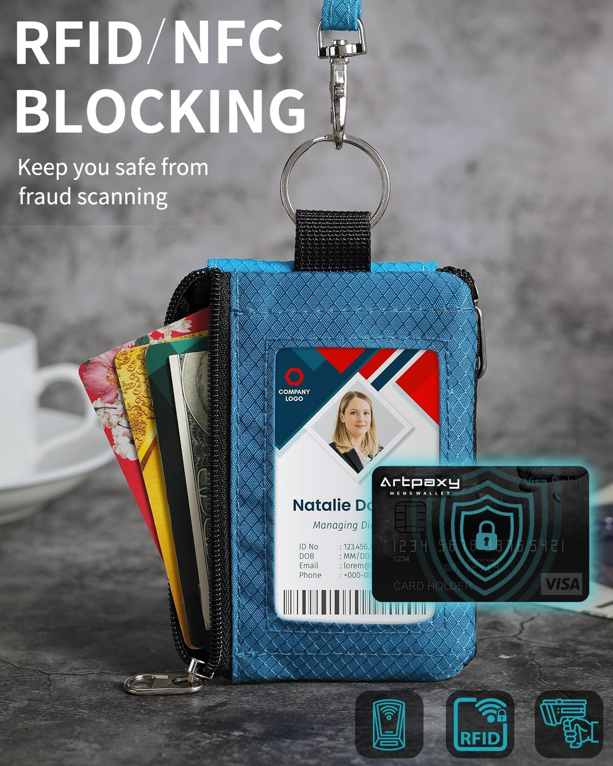 Everyday Wallet - Take the Artpaxy Keychain Wallet with you to work, shopping or traveling. It comes with 2 lanyards of different lengths, and can also be used as a neck wallet or wristlet wallet. Even without the lanyard, this simple wallet fits perfectly in your pocket or bag. Compact Structure, Huge Space - Made of durable waterproof nylon, lightweight and soft. wallet size 4.72'' x 3.15'', long lanyard size 17.32'', short lanyard size 6.3'', metal buckle size 1.56''. With 2 zippered compartments and 1 ID window to keep cards, cash and more safe and secure, it's easy to organize all your essentials. RFID-Blocking - The wallet contains RFID-Blocking metal fabric, which mainly blocks for credit card theft, mobile phone 5G signal, WiFi, etc. (Due to different frequencies, RFID-Blocking does not include car keys, access cards, etc.) The outside pockets and ID window of the wallet do not contain RFID-Blocking fabric, protecting your credit card and ID information while not affecting your daily life. Outstanding Gift Idea - brighten someone's day! Stylish and practical wallet for men and women of all ages. Give as a gift to your kids, partner, family, friends. Also suitable as a gift for birthdays, Christmas and other various holidays! Thoughtful Service - All Artpaxy products are high quality. If you are not satisfied with your purchase, please let us know and we will resolve the issue asap. Product Description 1. Zipper pockets contain RFID-Blocking metal fabric to keep your credit card and information safe. 2. RFID-Blocking fabric is not included on the surface of wallet. 3. The RFID-Blocking range does not include certain car keys, access cards, etc. due to the different signal bands that are blocked. Water Resistant Nylon Made of durable water resistant nylon, lightweight and soft. Package includes: 1*Wallet, 2*Lanyards Compact Design Complete with 2 different length lanyards, it can be used as a neck wallet or a wrist wallet. And this minimalist wallet fits in your pocket too. RFID Blocking RFID wallets block unauthorized device scans, protecting your private information and credit cards. Holds up to 15 cards 1 x ID window 1 x Button pocket 2 x Zipper pocket
