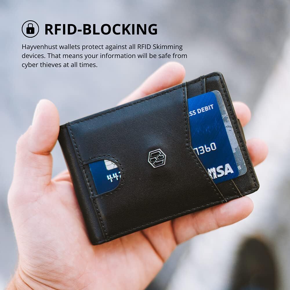 Hayvenhurst Minimalist Slim Wallet For Men - RFID Blocking Credit Card Holder - Leather Billfold Wallet with Metal Money Clip, ID Window & Front Card Slot | Billfold (Black, Billfold) Item Description STYLE AND TEXTURE - Jet black leather billfold wallet gives a beautiful texture and elegant look that counts to your personality and style. The cuts and patterned clean stitches add to the beauty. RELIANCE AND DURABILITY - The leather gives long life to your wallet, and the best quality stitches make it even more potent and hold it together. The ends are fine and curved. MULTIPLE POCKETS AND DIVIDERS - This slim male wallet has multiple dividers that help you manage your stuff quickly, and it is not complex and easy to utilize. It contains an ID window, a front card slot, and a metal money clip. POCKET FRIENDLY AND STANDARD SIZE - This wallet for men has a standard and comfortable size, which makes it handy, and its slim structure does not take that much room. › See more product details Payment Fast and Free shipping Shipping safe payment via eBay . Return 30 Day's returns
