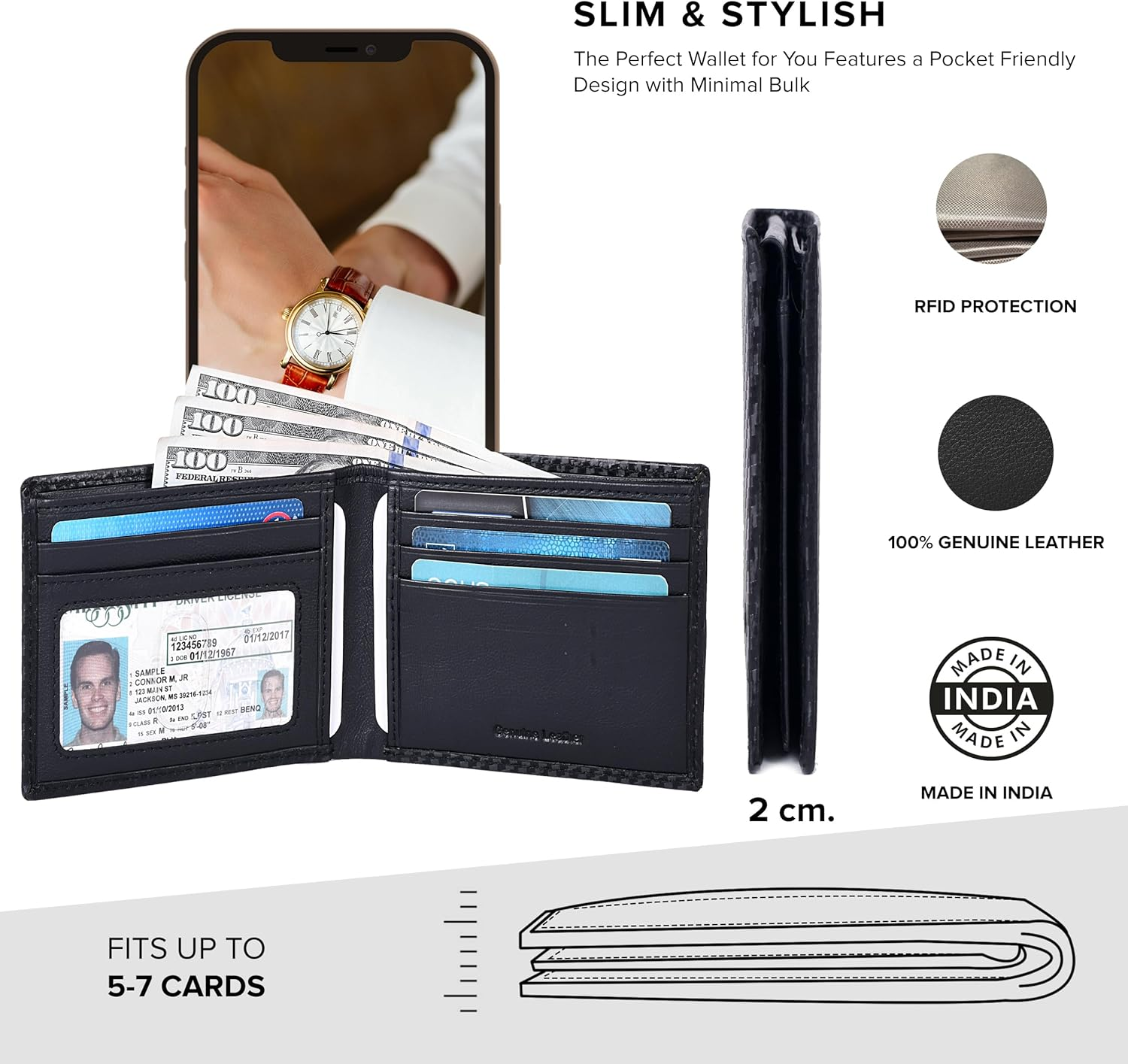 Store New Arrivals Add to Favorite View Feedback Contact Slim Leather Wallet for Men - RFID Blocking Slim Minimalist Front Pocket - Thin & Stylish with ID Window, Gift for Men Description Item model number CFH 19 Department Men Product Dimensions 2 x 2 x 1 inches; 1.41 ounces Color Small,01Black Carbon Fibre Manufacturer Ahmed tannery Pvt Ltd Product Description ABOUT US Our store reflects our family's ethos: dedication to quality, passion for unique items, and a customer-centric approach. Our mission is simple—to provide you with excellent products and an enjoyable shopping experience. Welcome to our family! We provide fast shipment and excellent customer service. We sell good quality and low priced items. If you have any questions before or after purchasing, please do not hesitate to reach out to us through eBay’s messaging system. Business Hours 8:30AM to 5:30PM PST Monday to Friday SHIPPING We are always working hard to ensure your package arrives as soon as possible. Please understand that some factors like weather, high postal traffic, and the performance of shipping companies are outside of our control. Shipment processing time orders are processed within 3 business days. Orders are not shipped or delivered on weekends or holidays. Shipping charges for your order will be calculated and displayed at checkout. RETURNS We currently do accept returns for opened or damaged items. For all other return inquiries, please contact us to issue an RMA number. We are committed to resolving any issues and providing a satisfactory shopping experience. CUSTOMER SATISFACTION We try our very best to make sure every customer is completely satisfied. If there's a problem, message us! We're happy to help. WE ACCEPT