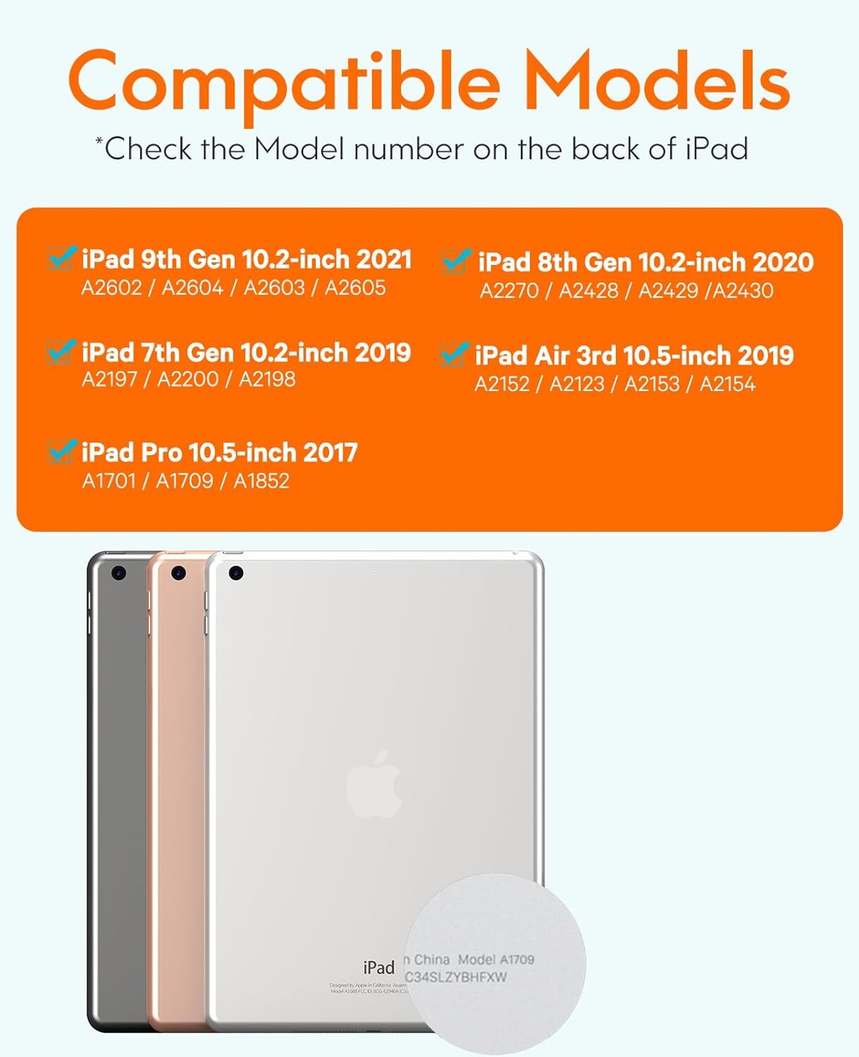 Product Details Product Dimensions: 10.24 x 7.48 x 0.98 inches Manufacturer: CHESONA Item model number: iPad 9th Gen/iPad 8th Gen/iPad 7th Gen IPAD 9TH/8TH/7TH GENERATION KEYBOARD CASE】 Design for iPad 10.2 9th Gen 2021 (Model Number: A2603, A2604, A2605)/8th Gen 2020 (Model Number: A2270, A2428, A2429)/7th Gen 2019 (Model Number: A2197, A2200, A2198). Not for iPad Pro 10.5 2017/ iPad Air 3 Gen 10.5 2019 and other iPad models. Please check the model number starting with "A" on the back of your iPad before purchasing. 【BACKLIGHT COLORS FUNCTION】 The backlit keyboard provides 7 different colors to choose from(Blue / Red / Yellow / White / Purple / Cyan / Green). Also allows for 3 levels of brightness. It is nice to use the keyboard in the dark or any low light setting. The backlit will automatically off after a while of non-activity, won’t drain the battery. 【DETACHABLE KEYBOARD & GOOD TYPING EXPERIENCE】 Durable magnetic case with a small footprint detachable keyboard that can use your iPad as a laptop. It is able to create a much more ergonomic set up by putting the keyboard at the ideal typing position. The keys are not too cramped and easy to type on. Make composing documents and emails much easier and more efficient. 【MULTIPLE ANGLES & PENCIL HOLDER】 Multiple viewing angles can be achieved by adjusting the position of the keyboard. The three anti-slip grooves at the bottom of the case offer three different screen angles when the keyboard detached. The case has a built-in pencil holder for the Apple Pen, and also has a small hole for the cap of the Pen. No worry about misplacing. 【PRECISE CUTOUTS & SOLID PROTECTION】 All cut-outs for the volume button, camera and charger etc are aligned perfectly. Offers access to all ports. The inner material is also very soft and does not scratch the iPad, keeps your iPad very secure without adding bulk. Offer protection when carry it in your bag and protect your iPad from any kind of unexpected occurrence.
