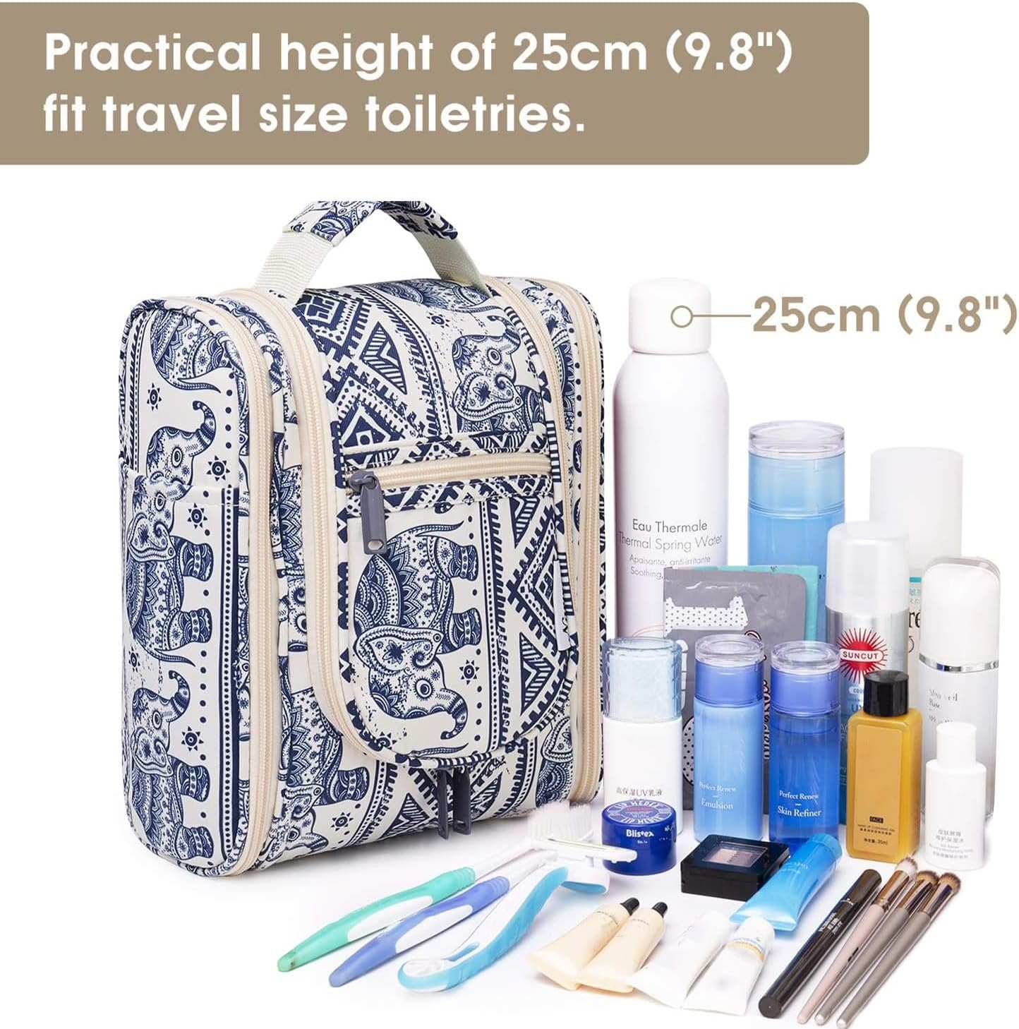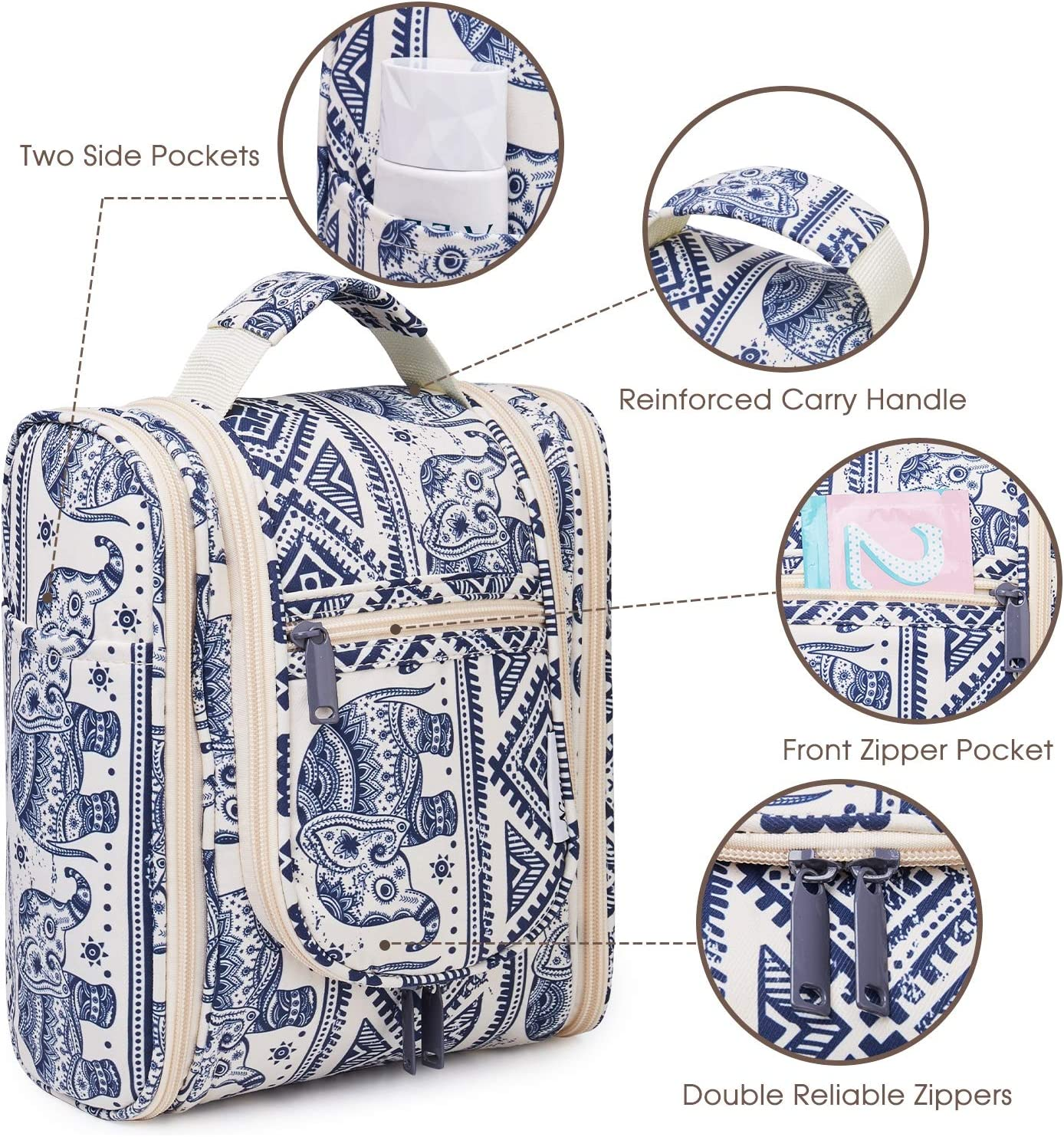 PRACTICAL 25cm TALL - The main compartment has a practical height of 25cm (9.12") which could easily fit travel-size shampoo & conditioner, lotion, face wash, toothpaste, toothbrushes, hair brush and daily makeups. Medium size is suitable for overnight or short trips MULTIPLE STORAGE COMPARTMENTS - Large main compartment with 8 mesh pockets, 4 zipper pockets (3 internal, 1 external) keep items organized and in place well, 6 open sides with several organized pockets for more storage, easy to grab exactly what you need NOT BULKY DESIGN - It is medium size with large capacity yet compact design, weighing only 9.8 ounces. Pack it flat design makes it not to take up too much room in your suitcase DETAILS ORIENTED - Buit-in large metal hook allows hanging the toiletry case from towel rack, coat hook or whereever is available, making your toiletries and cosmetics displayed well for easy access, saving bathroom counter space as well. Water-resistent and durable fabric protects your gear from spills. Soft fabric and reliable zippers. Wide opening and rectangle shape makes it easy to stand on its own VERSATILE - Compact, sturdy, portable, lightweight, which makes it a good for business trips, travel, gym, camping, home use and more Product Description 1 Important Notes 2 Cater to Different Needs Roomy Main Compartment Featured with several mesh pockets and has a practical height of 25cm/9.12" (M) & 25.5cm/10" (L) Front Mesh Pocket Offer separated storage for small items. 1 Main Compartment 2 Front Mesh Pocket 3 Two Side Compartments Reliable Metal Hook Make it easy to hang the toiletry kit on the towel rack, coat hook or anywhere available. Mesh Pocket Breathable mesh pocket for items stained with water. Visible PVC Pocket Great for frequently used items for easy-access. 1 Convenient Hanging Design 2 Metal Hook 3 Upper Mesh Pocket 4 PVC Pocket Front Zipper Pocket Great for frequently used items for easy-access. Water-resistant Easy to clean and protect your gear from spills. Reliable Zippers With smooth reliable zippers, no need to worry any rip or breaking during trips. Sturdy Handle Convenient carry handles make it easy to grab and go. Hanging Toiletry Bag (M) Pick Your Toiletry Bag 7.5x9.8x4.5 Dimensions (in) 11x10.2x5 Hanging Metal Hook Dry Wet Separation Brush Slots Grab Handle Travel-size Bottles Upright Storage Travel-size Bottles 7.5x9.8x4.5 Dimensions (in) 9.8x6.3x5 Hanging Metal Hook Dry Wet Separation Brush Slots Grab Handle Travel-size Bottles Upright Storage Travel-size Bottles Hanging Toiletry Bag Toiletry Bag