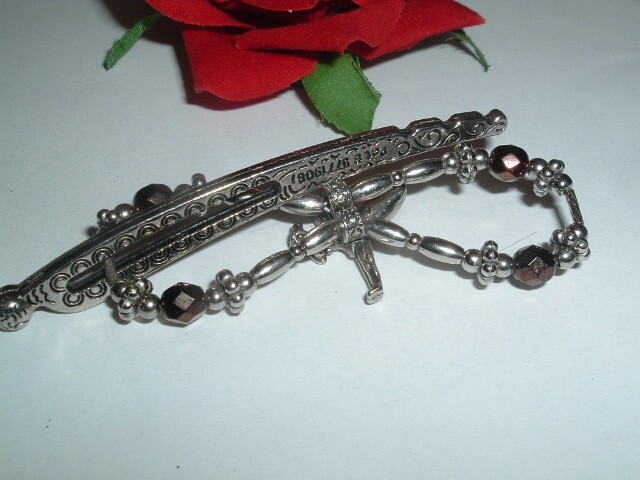 A small Lilla Rose silvertone hair clip with Tinkerbell and her amber glass wings framed in metallic brown and silver beads. Measures 2.5" wide with a 3" long pin back. Never worn, condition is excellent and perfect for spring. A wonderful gift for a little girl (or a big one).