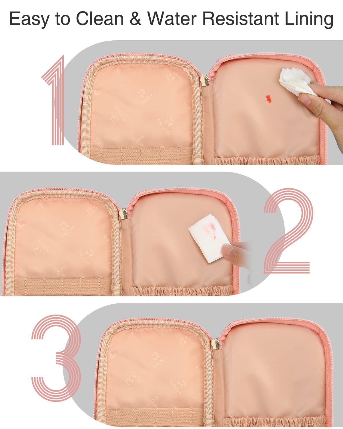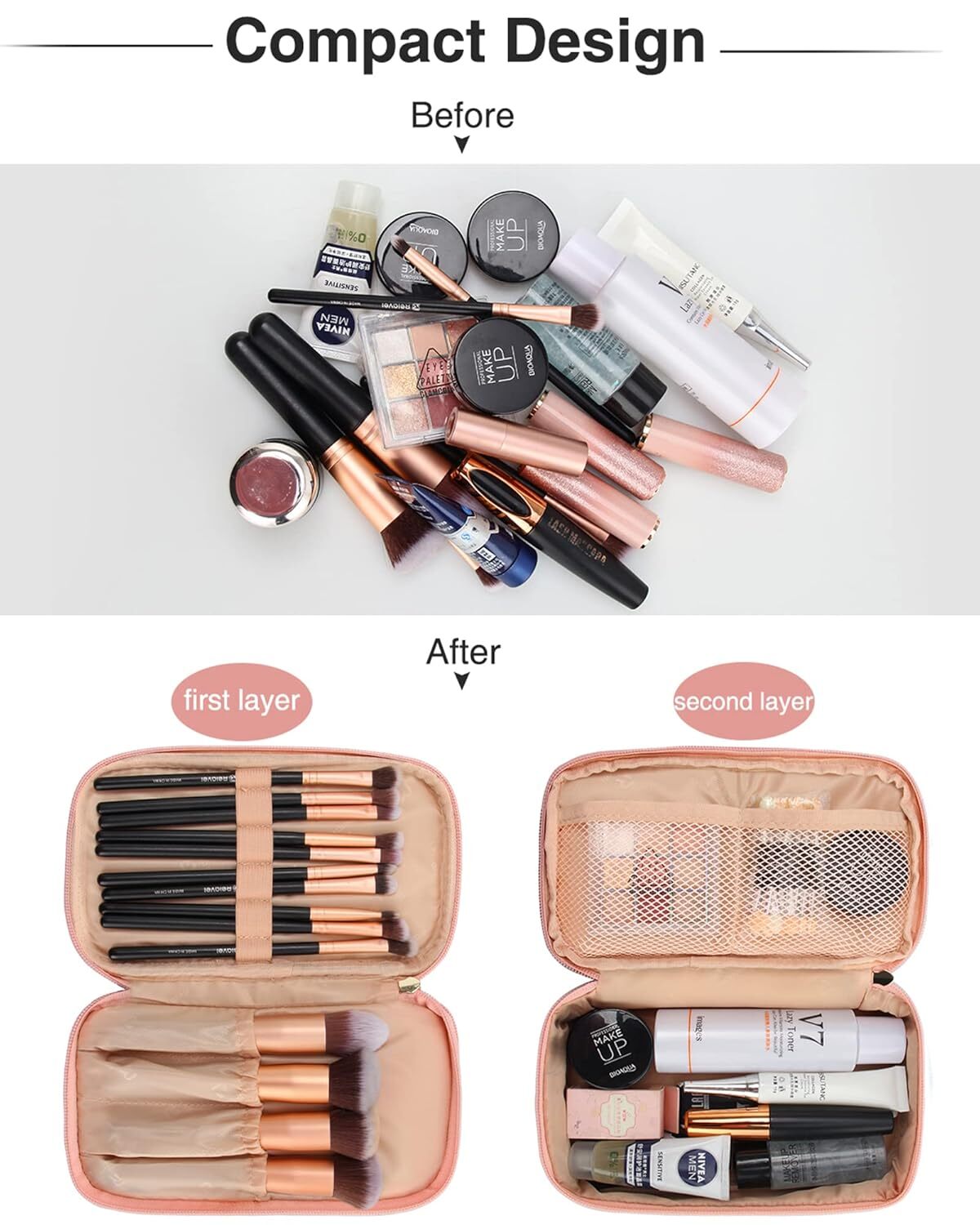 Relavel Makeup Bag, Small Travel Cosmetic Bag for Women, Portable 2 Layer Makeup Brushes Holder Bag, Toiletry Bag, Compact Cosmetic Case Organizer for Christmas, Pink Item Description 【Premium Material Cosmetic Bag】This makeup bag is made of high quality PU leather material which is durable, waterproof, scratch-resistant, easy to clean (Note: Cosmetic Accessories Not included) 【Double Layer Organizer Bag】Multiple compartment for different requests of storage. Cosmetic zipper bag keep your toiletry accessories safe and easy to access them and use them quickly and more convenient 【Unique Separate Compartments】There are 6 small slots and 3 bigh holders on the upper layer that offer you to carry daily makeup brushes or eye shadow brushes, eyeliners, eyebrow pencils etc 【Perfect Travel Makeup Bag】Portable and Lightweight design, with waterproof, shockproof, anti-wear and spill-proof interiors. You can bring your cosmetics to anywhere It is a wonderful gift Idea to your daughter, wife, girlfriend, friend for Birthday, Mother's Day or Christmas › See more product details The outer material of the cosmetic brush bag is a waterproof fabric, which can protect the cosmetics inside. The inner lining is nylon, which is more wear-resistant. The SBS metal zipper can make the switch smoother. The double-layer design allows more space for cosmetics, lipstick, eye shadow, makeup brush, sunscreen, nail polish, etc. in the makeup brush bag. The upper design can store makeup brushes separately. There are four makeup brush slots on the upper layer that offer you to carry daily makeup brushes, and six elastic slots can hold eye shadow brushes, eyeliners, eyebrow pencils, etc. The bottom of the upper and lower layers use specially designed waterproof lining, which can be easy to clean when getting cosmetic stains. The cosmetic brush bag is relatively small, so you can easily put it in your backpack or suitcase. It is very suitable for short trips. It can also be carried by hand, which is safe and convenient. Package Includes: 1*Small Makeup Bag(Cosmetic are not included) The new cosmetic brush pack may have a pungent smell, but it is definitely not dangerous and is not a toxic gas, so please leave it for a few days before the smell dissipates before use. Payment Fast and Free Shipping Shipping safe payment via eBay . Return 30 Day's returns