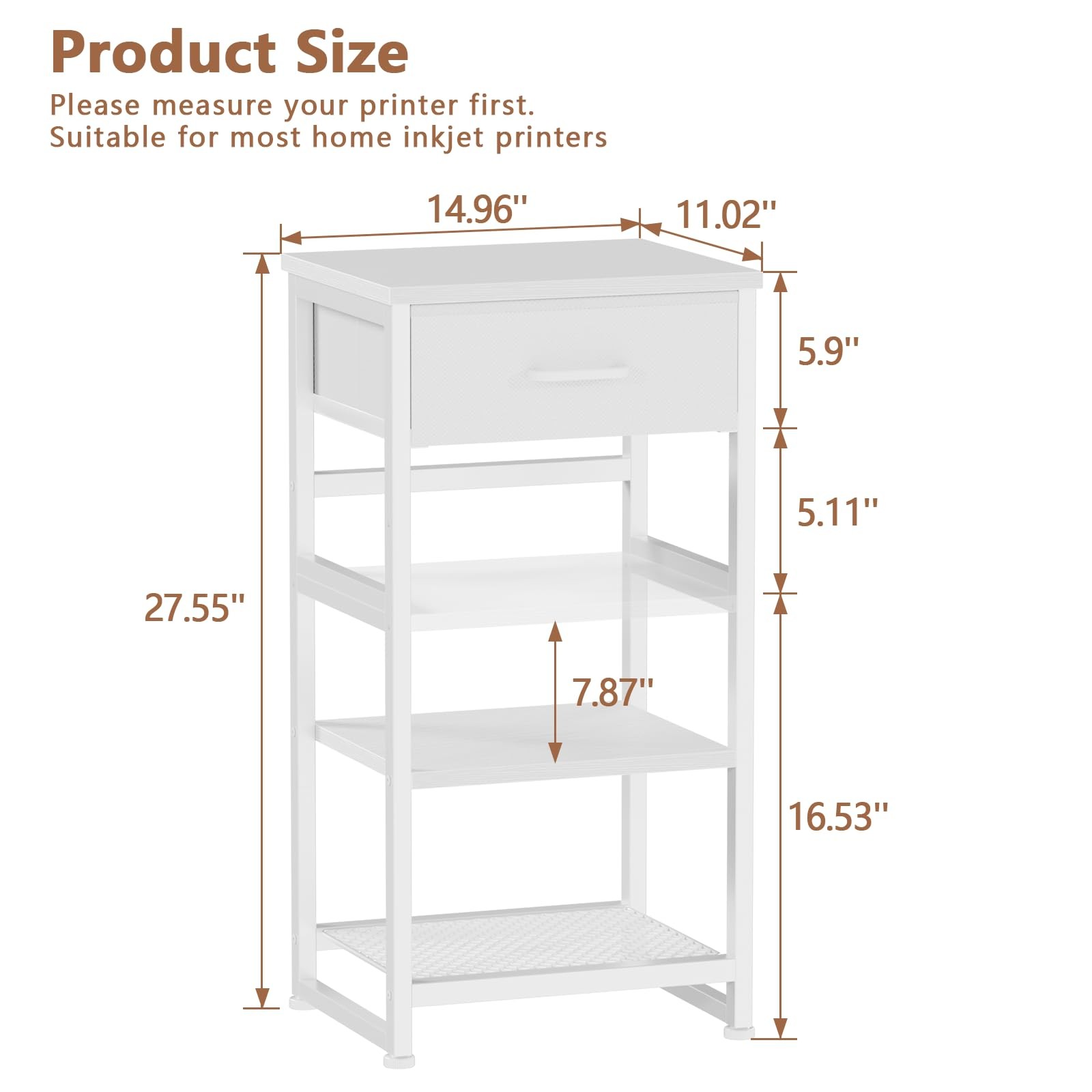 Printer Stand with Small Storage Drawer, All in One Under Desk Mobile Printer Table and Desktop with Storage Shelves, 3 Tiers Industrial Rolling Printer Cart with Wheels for Home Office, White 【3-Tier White Printer Table】Modern white printer stand spacious desktop can accommodate printers of various sizes, providing more storage space in your study and office! (Size:14.96"D x 11.02 "W x 27.55 "H) You can keep books, folders, printing paper, etc. on the open storage shelf. And the drawer stores staplers, pens and other small office supplies. This desk side printer table with storage function keeps your office supplies tidy and can improve work efficiency 【Sturdy & Stable】The small printer stand made with drawer is made of high-quality metal and upgraded fabric drawers to ensure stability and durability, it won't tilt easily. Its quality material ensures long-term use 【Easy to Move】Four 360° swivel casters (two with brakes) enable easy movement and secure locking of the home rolling printer cart. The wheels will not make noise or scratch the floor when moving. Four extra adjustable feet are provided for installation as required 【Upgraded Adjustable Shelf】The small printer desk holder have an adjustable shelf,You can adjust the height of the board to store different height products.The small nightstand also blends the advantages of private and open storage/display to suit your place 【Multiple USE Options】The 3-Tiers printer stand with storage can be used as an under desk printer stand in a home office, bedside table, sofa side table, nightstand, end table, storage shelf,living room,bedroom, etc. It's a great item for organizing. Its simple style suits any decor and remains timeless 【Easy Assembly & Great Service】We provide a clear assembly manual. Accessories are digitally - tagged for simple setup.You can find an assembly video on the product page for additional guidance. Please feel free to reach out to us for any problems, our efficient customer service team will answer your questions within 24 hours