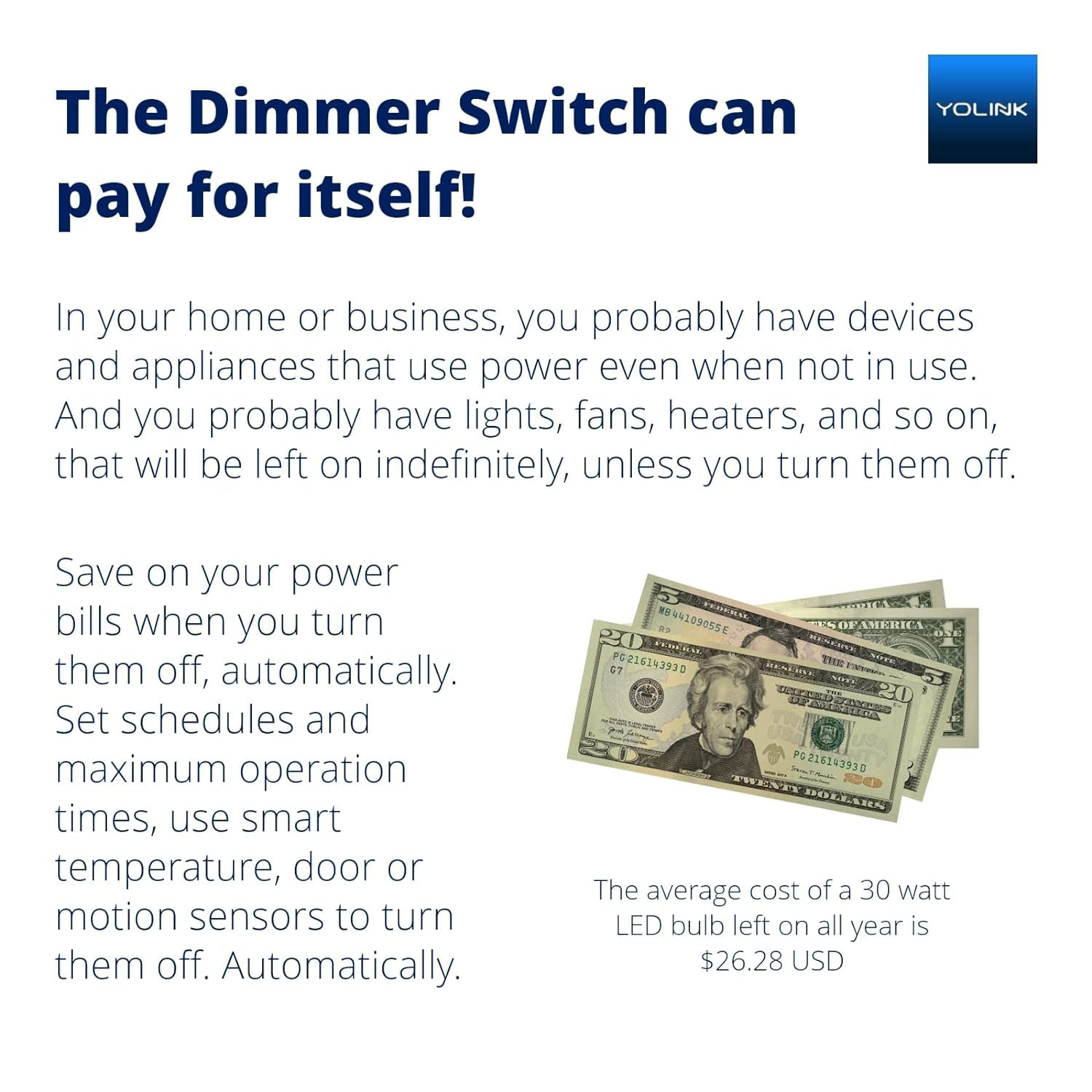 ADD SMART LIGHT DIMMING to your YoLink system! Control and adjust your light brightness from the app, on motion detection (motion sensor not included), doors opening, and on schedules. ADD SAFETY, SECURITY, CONVENIENCE & SAVINGS when you replace your non-smart switches. Turn on lights automatically, hands-free, when you enter a room. Turn them off automatically if the room is empty (YoLink motion sensor not included) REQUIREMENTS: a neutral wire is required, and for full functionality the switch must wirelessly connect to one of our Hubs. An Android phone running version 4.4 or newer, or an Apple phone iOS version 9 or newer is required. WORKS WITH dimmable LED, incandescent, CFL/fluorescent, and halogen bulbs/lights, which can be mixed & matched on the same circuit. 3-WAY operation requires using our Control-D2D device-to-device pairing method between two YoLink Dimmer Switches, which is explained in the user guide. The switch is not compatible with 3-way wiring style, the traveler wire must be abandoned or reused to provide a hot, neutral, ground, and at least one switch leg at each switch. Product Description 1 Introduction 2 Dimensions 3 Long-Range Connectivity 4 Smart Integration 5 Hub Required 1 Installation Step 1 2 Installation Step 2 3 Installation Step 3 4 Installation Step 4 5 Installation Step 5 1 Remote Control & Monitor 2 Dual Button Control 3 Customizable Schedules 4 Precise Timer Functions 5 Automations 1 Overheat Protection 2 Device-to-Device Control 3 Long-Lasting Battery Life 4 Durable Design 1 Low-Power Lighting System 2 Automate Small Appliances 3 Manage Ventilation Fans 4 Enhance Security Lighting 5 Small-Scale Automation 1 App Push 2 Email Notification 3 SMS Notification 4 Device Action 5 Phone Call 1 Expert Support Available 2 Online Resources 3 Raedius Platform