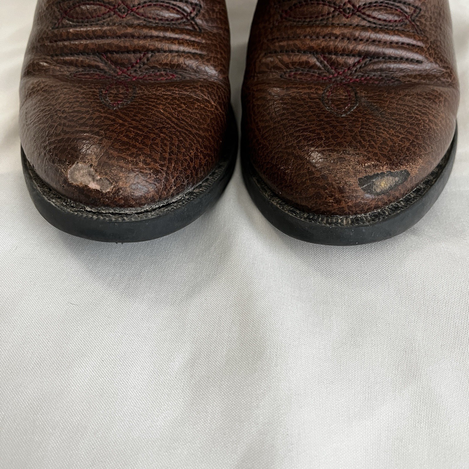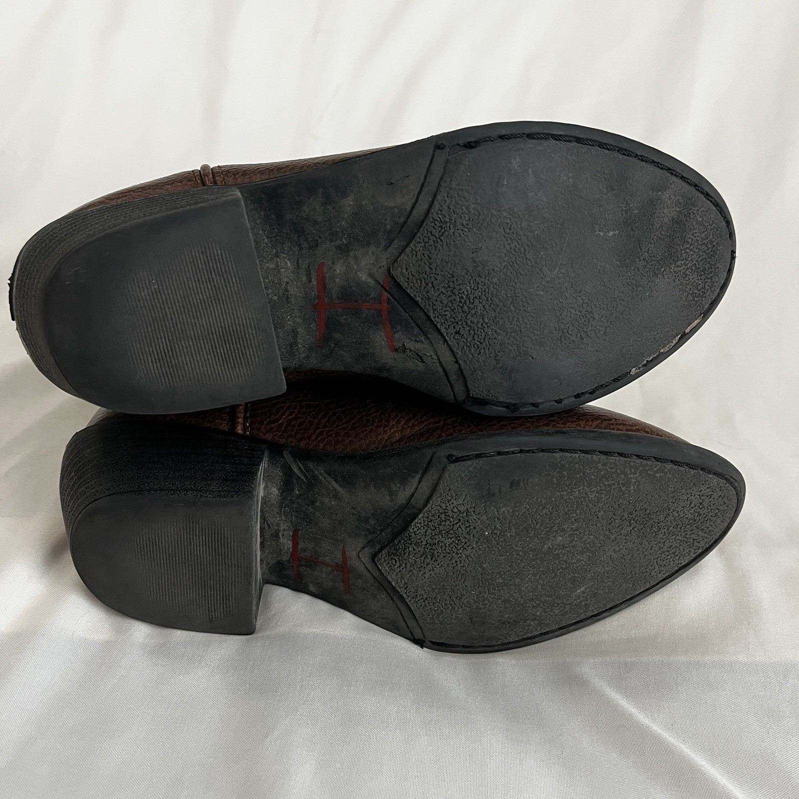 These Smoky Mountain Western Boots in brown faux leather with horse embroidery are perfect for young kids. The pointed toe and low block heel make them comfortable and stylish for everyday wear. The pull-on closure add convenience and ease of use, while the rubber outsole provides durability. With a western cowboy theme and horse pattern, these boots are sure to be a hit with anyone who loves the wild west. Visible wear on heels, toes have rub marks, wear at pull on and creases from use. Please see photos for details.