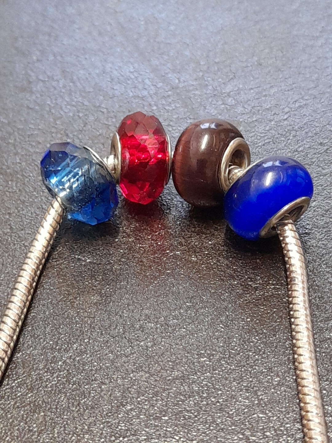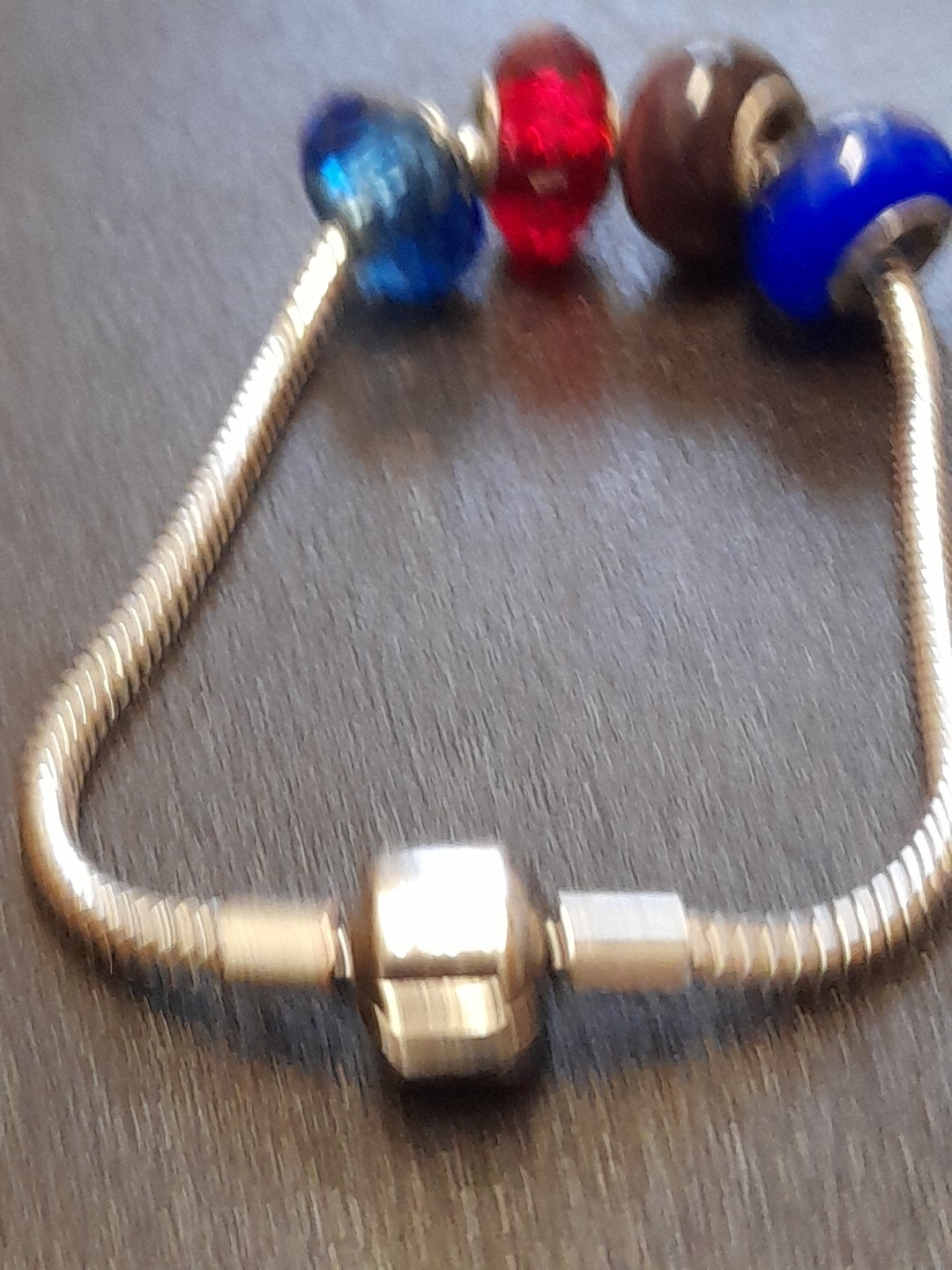 THIS IS NOT A PANDORA BRACELET. A pandora style snake bracelet with a barrel clasp and 4 charms. The bracelet measures 19cm in length and weighs 20 grams. The charms are a mix of coloured and faceted styles perfect for adding genuine pandora charms. Please see all images before purchase.