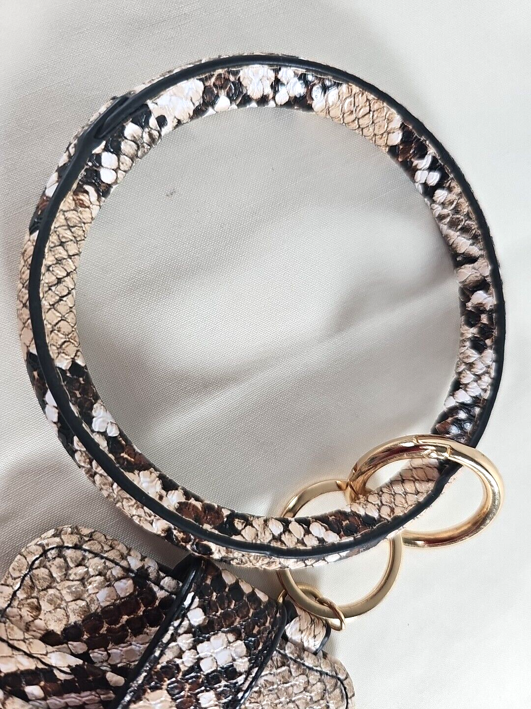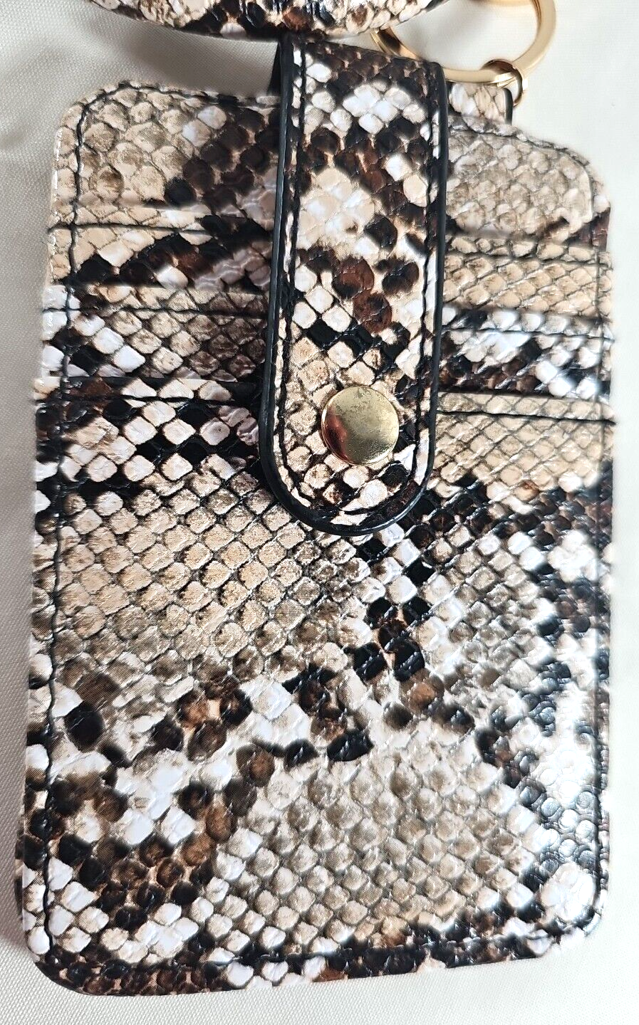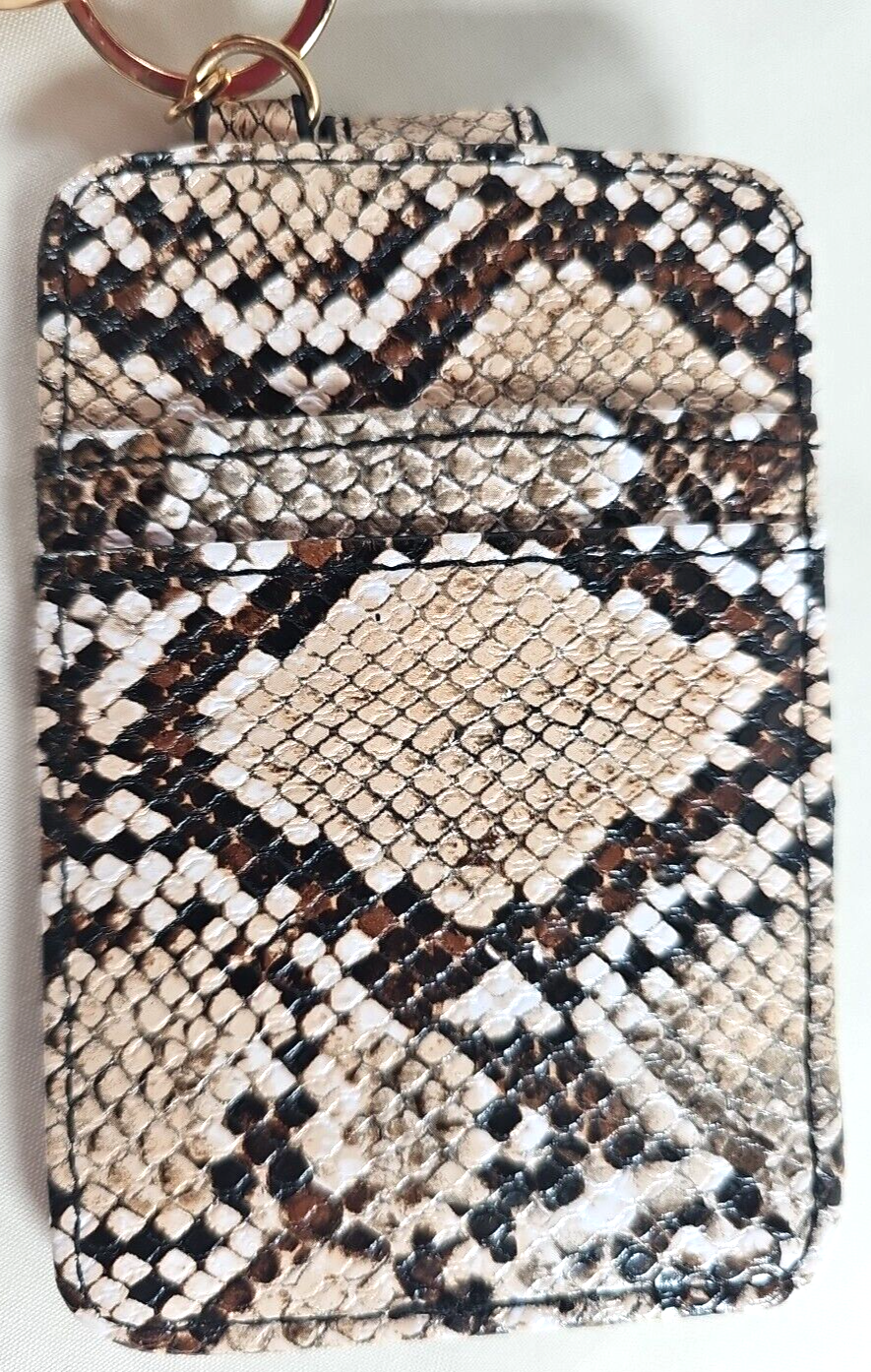 Bangle Wristlet Wallet Keychain Credit Card, ID Holder, Faux Snakeskin in brand new condition. Wallet measures 4 1/2" x 3" and bracelet measures 4" diameter. Wallet has slots for five cards with a snap for security. Wallet detaches from wrist bracelet. Weight 3 oz.