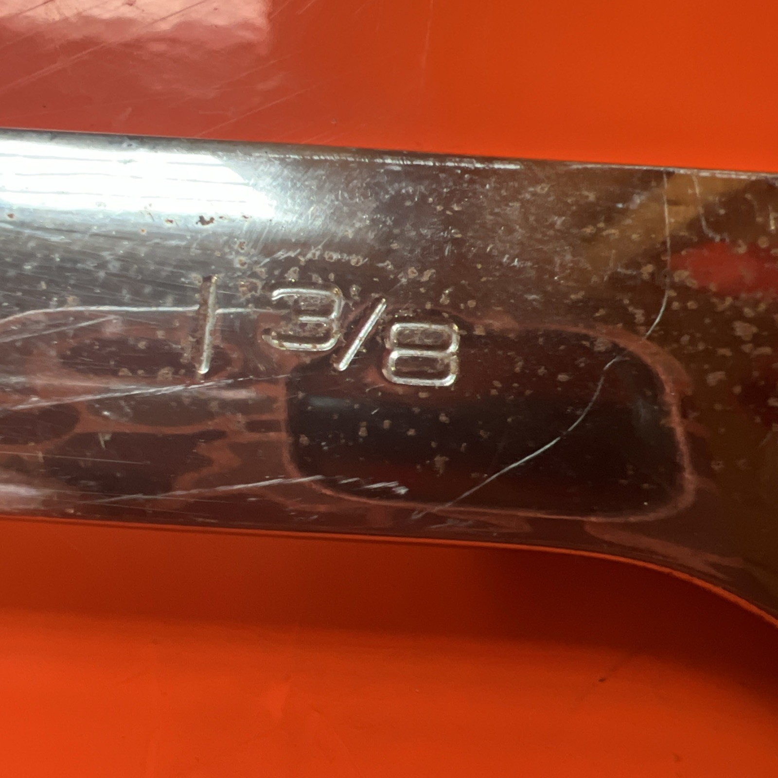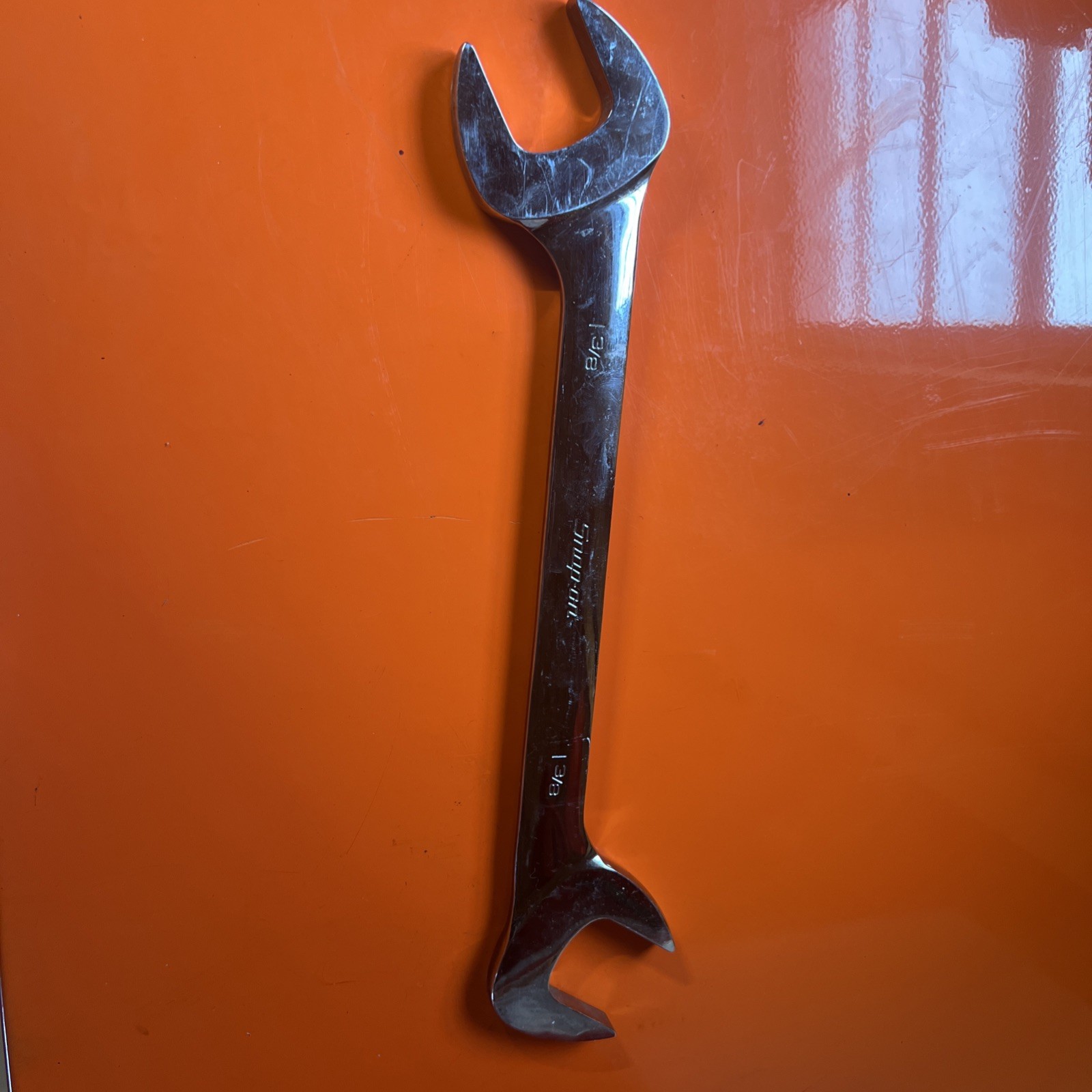 The Snap-On SAE 1 3/8” 4 Way Angle Open End Wrench VS44B is a high-quality hand tool designed for automotive use. Made by the trusted brand Snap-on, this single item wrench features a specialty drive type and a size of 1-3/8 inches. The open-end design provides a versatile grip for fastening and loosening nuts and bolts. With no warranty, this durable tool is a reliable addition to any mechanic's toolbox, offering precision and efficiency for various automotive repair and maintenance tasks. slight scratches and surface rust as seen in photos but in good working condition
