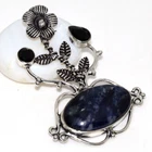 Sodalite Black Onyx 925 Silver Plated Flower Leaf Gemstone Pendant 2.2" JW