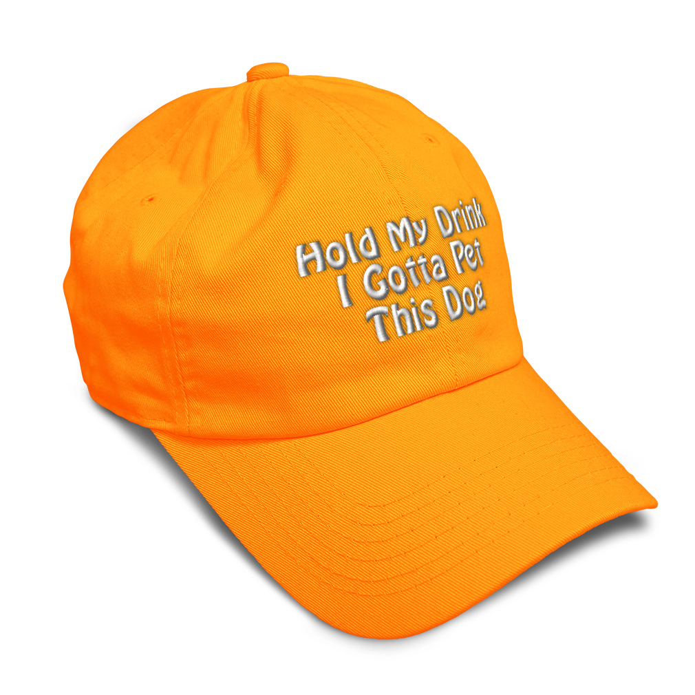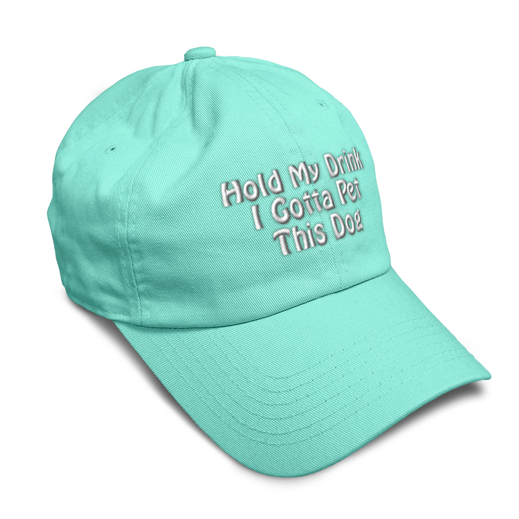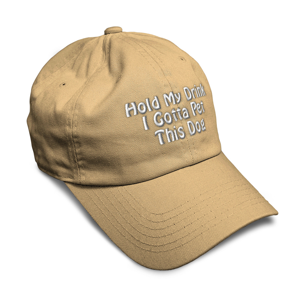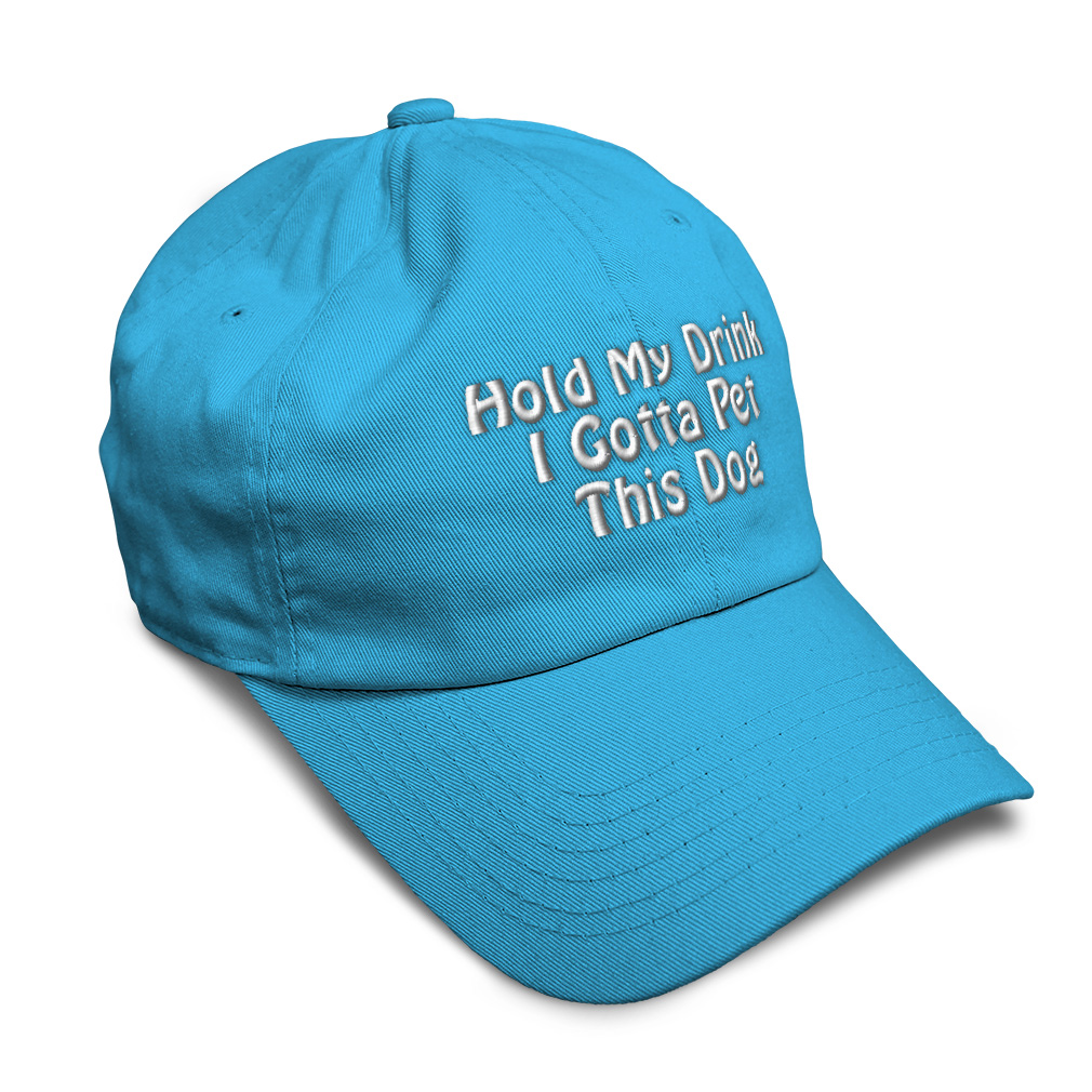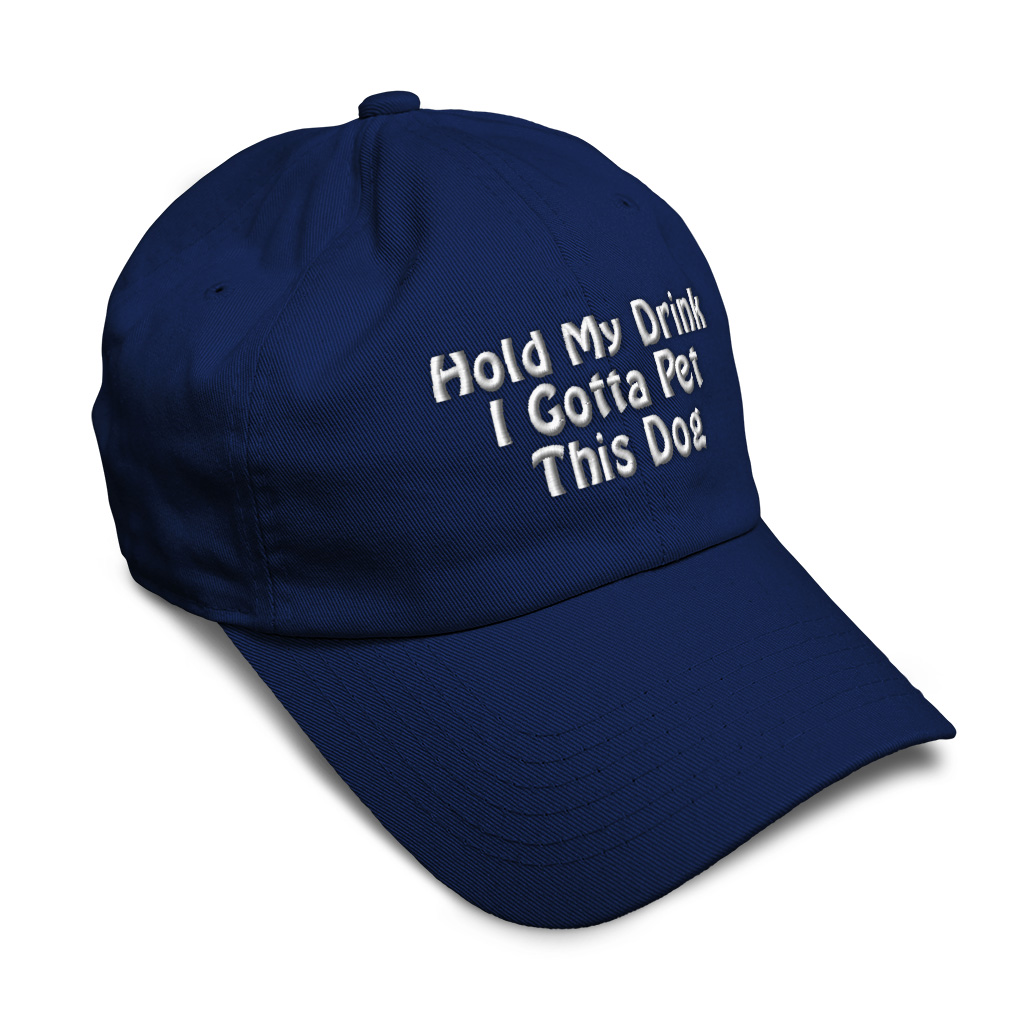 Custom Unisex Unstructured 100% Cotton Baseball Cap for Men & Women Classic never goes out of style! Our baseball caps will come everywhere with you and will take your outfit to the next level. Our caps are available in more than 20 colors, so we are sure you'll find the perfect one. GREAT GIFTS IDEA: Unforgettable and unique, our golf hats men and women are the perfect gift for birthdays, anniversaries, Christmas, Father’s Day, Mother’s Day or any other celebrations. Perfect for someone who is looking for Dog hat, Pet hat for women, Friend dad hat for women, Ally baseball cap, Partner mens hat Love womens hat, Care gifts for wife, Protect women baseball caps, Loyal hats for men, Mate dad hat, Dog gifts for men, Pet gifts for women, Friend gifts for dad, Ally apparel, Partner shirt. These men hats and baseball hats for women are suitable for exercise such as running or working out, casual outings to go to the beach, to work, to the club, to the mall or an everyday wear. You can make this mom hat or dad hat one of a kind with our custom option with thousands of designs available to you. Simply add your personalized text and choose among various fonts and colors! Our embroidery will continue to look great after many years, it is carefully made in our lab in Tampa, Florida. The design's text reads: hold my drink i gotta pet this dog. BEST CLASSIC SOFT BASEBALL HAT! ** Long-Lasting Materials: Add a classic touch to your outfit with our 100% cotton 6 panels low-profile unstructured baseball hat that provides maximum comfort. Fits men and women! ** METAL BUCKLE CLOSURE: Our hats for women and men feature a solid metal buckle closure in the back letting you easily adjust the size for a perfect fit. ** PRE-CURVED BILL: Our mens hats and womens hats feature a well-made pre-curved bill to protect you from the sun and prevent dazzle. You can now play your favorite sport without being bothered by the sun! ** ANTI-SWEAT BAND: Stay fresh and dry with our golf hat featuring an anti-sweat band. Exercise and play your favorite sports without having sweat running consistently into your eyes anymore! **AMERICAN CUSTOM EMBROIDERY: We take proud on being an American company and we bring you the best of custom and personalized embroidery. Simply select the color of your sun hat, and then customize it with your own text and words. Choose among a wide range of fonts and colors! PAYMENT TERMS