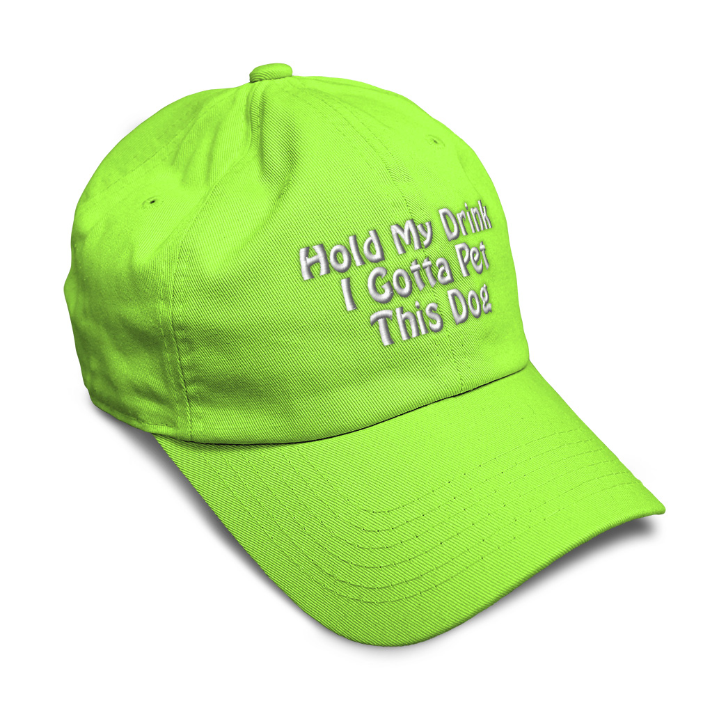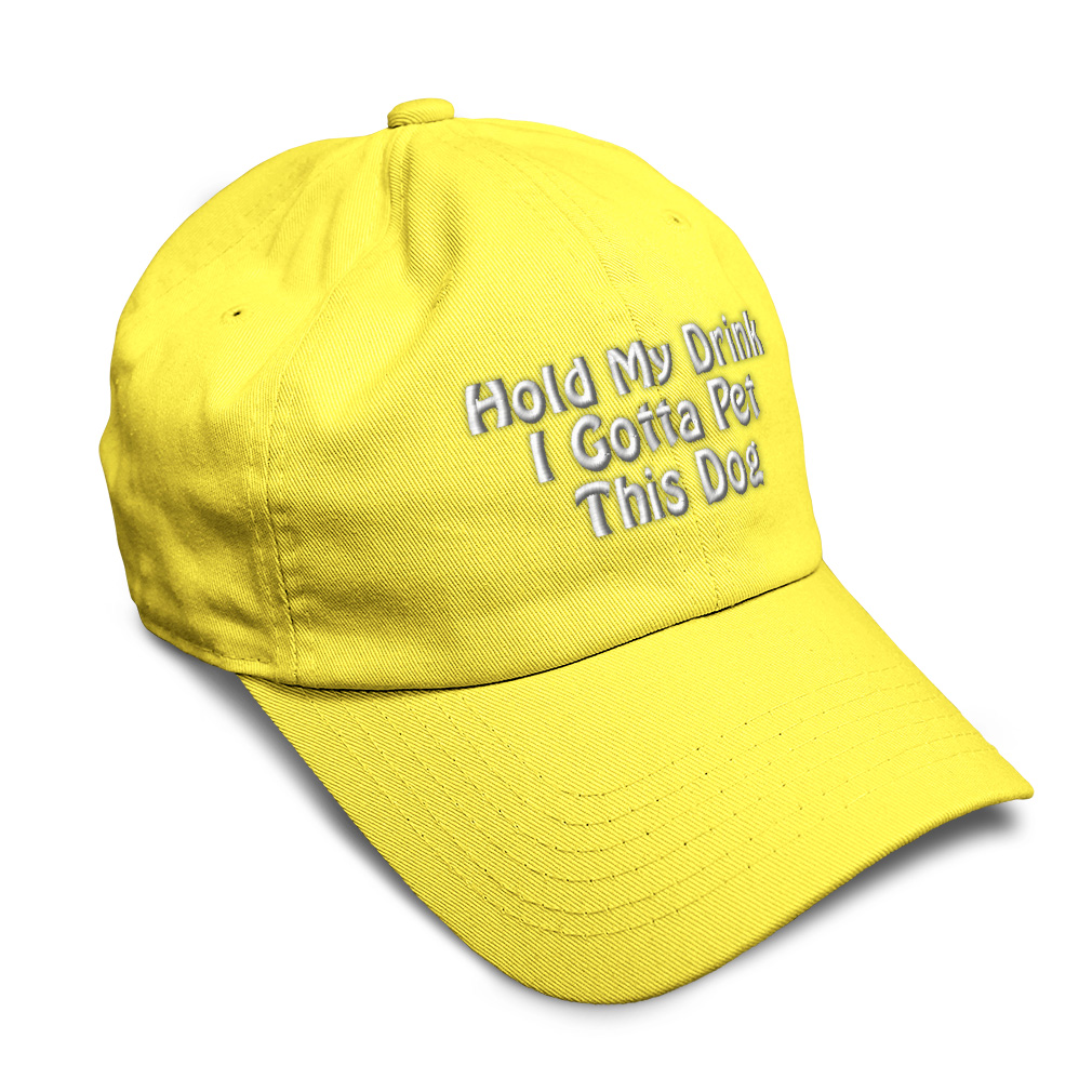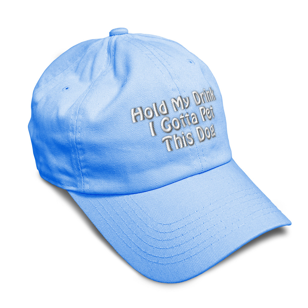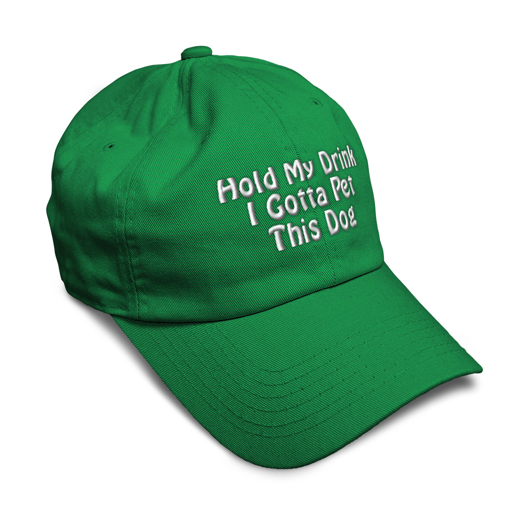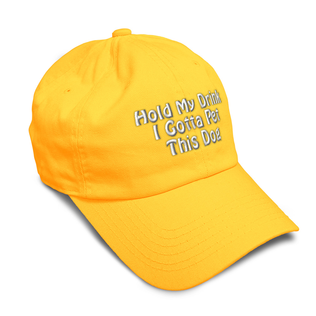 Custom Unisex Unstructured 100% Cotton Baseball Cap for Men & Women Classic never goes out of style! Our baseball caps will come everywhere with you and will take your outfit to the next level. Our caps are available in more than 20 colors, so we are sure you'll find the perfect one. GREAT GIFTS IDEA: Unforgettable and unique, our golf hats men and women are the perfect gift for birthdays, anniversaries, Christmas, Father’s Day, Mother’s Day or any other celebrations. Perfect for someone who is looking for Dog hat, Pet hat for women, Friend dad hat for women, Ally baseball cap, Partner mens hat Love womens hat, Care gifts for wife, Protect women baseball caps, Loyal hats for men, Mate dad hat, Dog gifts for men, Pet gifts for women, Friend gifts for dad, Ally apparel, Partner shirt. These men hats and baseball hats for women are suitable for exercise such as running or working out, casual outings to go to the beach, to work, to the club, to the mall or an everyday wear. You can make this mom hat or dad hat one of a kind with our custom option with thousands of designs available to you. Simply add your personalized text and choose among various fonts and colors! Our embroidery will continue to look great after many years, it is carefully made in our lab in Tampa, Florida. The design's text reads: hold my drink i gotta pet this dog. BEST CLASSIC SOFT BASEBALL HAT! ** Long-Lasting Materials: Add a classic touch to your outfit with our 100% cotton 6 panels low-profile unstructured baseball hat that provides maximum comfort. Fits men and women! ** METAL BUCKLE CLOSURE: Our hats for women and men feature a solid metal buckle closure in the back letting you easily adjust the size for a perfect fit. ** PRE-CURVED BILL: Our mens hats and womens hats feature a well-made pre-curved bill to protect you from the sun and prevent dazzle. You can now play your favorite sport without being bothered by the sun! ** ANTI-SWEAT BAND: Stay fresh and dry with our golf hat featuring an anti-sweat band. Exercise and play your favorite sports without having sweat running consistently into your eyes anymore! **AMERICAN CUSTOM EMBROIDERY: We take proud on being an American company and we bring you the best of custom and personalized embroidery. Simply select the color of your sun hat, and then customize it with your own text and words. Choose among a wide range of fonts and colors! PAYMENT TERMS