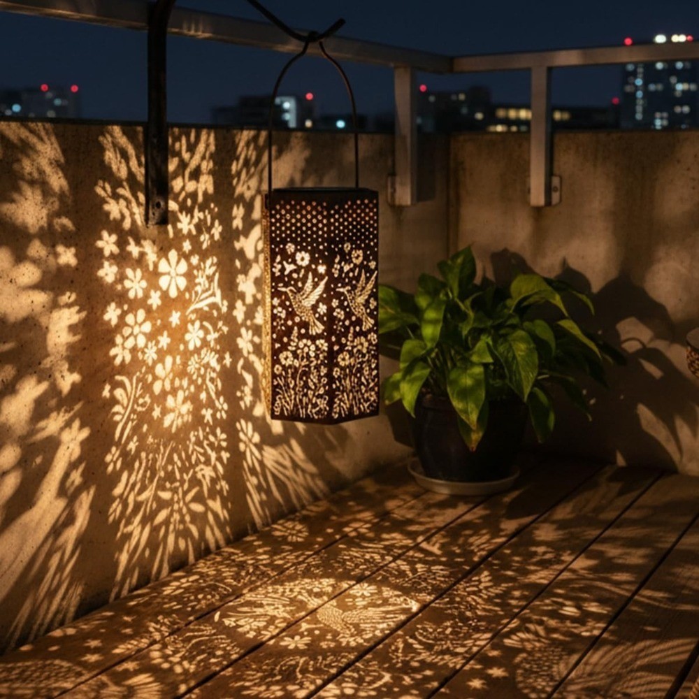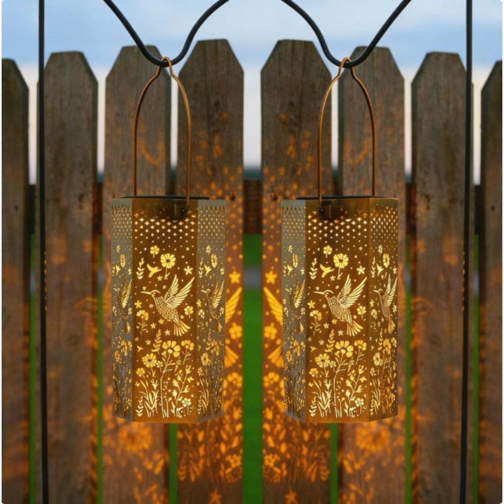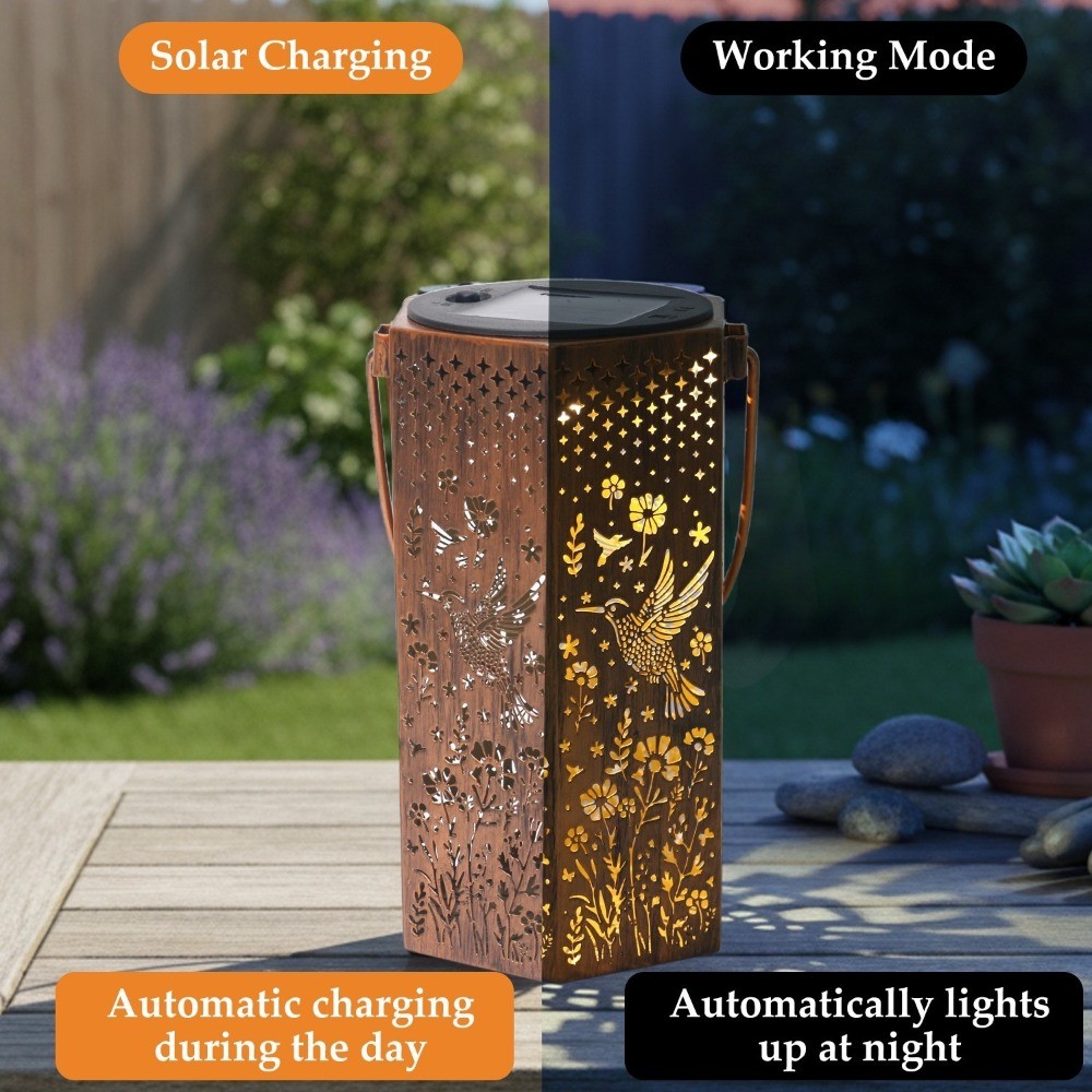 Description: Retro Design : Lanterns project Hummingbird and petal patterns at night , casting warm light to create a cozy ambiance . Featuring hollow out and vintage design with bronze tones , it exudes artistic accent and serves as decorative piece even during daytime use Solar Powered : Built in solar panels automatically charge during daylight and illuminate at night , eliminating the need for wiring , plugs , or electricity bills . Simply hang or place in sunlight to enjoy energy efficient lighting Waterproof : IP65 rated to withstand rain and snow . The metal body features a rust resistant painted finish , suitable for all climates . A 6+ hour charge provides 6 to 8 hours of continuous lighting Wide Applications : Hang from trees or corridors , or place on desks and patios . Ideal for gardens and indoor/outdoor decor . Great for parties , weddings , camping , and more , the butterfly style design adds delightful surprises to any space Unique Present : Symbolizing new beginnings , luck , and hope , this uniquely designed Hummingbird theme lantern makes an ideal present for holidays , housewarmings , and special occasions Detailed description: Product Name: Hummingbird Style Solar Lantern Composition: Iron Battery Model: AA Nickel Metal Hydride (Included) Battery Capacity: 600mAh (Included) Parts List: 1/2 x Solar Lantern Lights