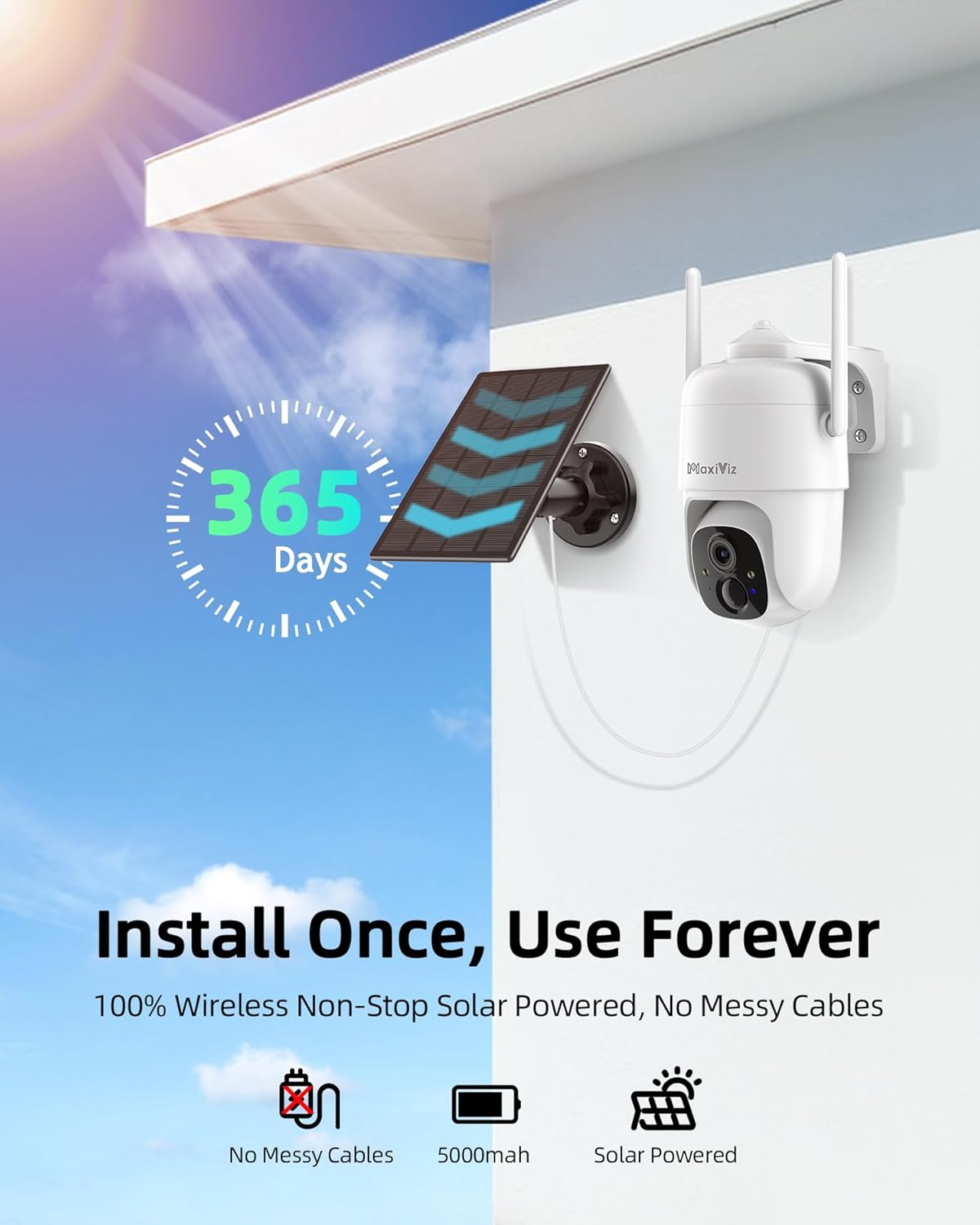 【100% WIRELESS & EASY INSTALLATION】 MaxiViz Outdoor Solar Security Camera is equipped with a high-capacity battery, up to 23% solar energy conversion rate can provide a 365-day uninterrupted power supply for the camera, freeing you from frequent battery charging hassles. Easy to install, no need to worry about messy wiring and power outlets. Installed once, use forever. 【2K RESOLUTION & COLOR NIGHT VISION】This wireless outdoor camera is equipped with 2K resolution, which is 1.5 times sharper than a 1080p security camera, allowing you to see clearly day and night. With two floodlights, the MaxiViz outside camera's extraordinary color night vision adds a touch of brilliance to every dark night and comprehensively improves the night vision effect. 【360° VIEW & PIR MOTION DETECTION】MaxiViz PTZ outdoor camera wireless supports 355° horizontal and 90° vertical rotation, along with 4X Digital Zoom, capturing every corner of your home via the VicoHome App. This solar security camera supports human motion detection and can reduce false alarms by up to 90%. When the camera detects motion, it will emit a dazzling light and send you a message in time to remind you what happened, you also can turn on the alarm sound to repel the intruder. 【IP66 WEATHERPROOF & MULTIFUNCTION】Our wireless security camera outdoor is made of polymer polyester material, verified by high and low temperature and waterproof tests, which can withstand all kinds of bad weather and guard your home 24/7. In addition, the camera has a two-way call function, so you can talk directly to the person under the camera. Share it with your family and view multiple cameras at the same time to keep an eye on important people or events. 【LOCAL/CLOUD STORAGE & DATA SECURE】Lifetime 3-day recurring cloud event recording ensures that the camera records all the moments that matter to you. Plus, you can also choose to store the video on an SD card (up to 128GB) with no hidden fee. Our cloud security certifications meet the highest standards, providing privacy protection for your valuable data! No one could access the data without your permission. Product Description 1 Non-Stop Solar Powered 2 Full Color Night Vision 3 Two-Way Audio 4 IP66 Weatherproof 1 Lights and Sound Alarms 2 Customized Activity Zone 3 Mult-Camera in One App 4 Intelligent APP Setting Explore More VicoHome Camera Add to Cart Add to Cart Add to Cart Add to Cart Add to Cart Customer Reviews 4.4 out of 5 stars 464 4.3 out of 5 stars 2,416 4.2 out of 5 stars 77 4.2 out of 5 stars 77 4.3 out of 5 stars 39 4.5 out of 5 stars 7 4.3 out of 5 stars 2,416 Price $109.99 $ 109 . 99 $49.99 $ 49 . 99 $34.99 $ 34 . 99 $33.99 $ 33 . 99 — — $34.99 $ 34 . 99 Resolution 2K 2K 2K 2K 1080P 1080P 2K Audio Two Way Audio Two Way Audio Two Way Audio Two Way Audio Two Way Audio Two Way Audio Two Way Audio Power Supply Solar Power Solar Power Adapter Power Adapter Power Solar Power Solar Power Battery Power Wi-Fi 2.4GHz Only 2.4GHz Only 2.4GHz Only 2.4GHz Only 2.4GHz Only 2.4GHz Only 2.4GHz Only Application VicoHome VicoHome VicoHome VicoHome VicoHome VicoHome VicoHome Flashlight Alarm ✔ ✔ ✔ ✔ ✔ ✔ ✔ Audible Alarm ✔ ✔ ✔ ✔ ✔ ✔ ✔ Activity Zone ✔ ✔ ✔ ✔ ✔ ✔ ✔ Free Cloud Storage ✔ ✔ ✔ ✔ ✔ ✔ ✔ 24/7 Recording No, Motion & Live Recording No, Motion & Live Recording Yes, Use SD Card Yes, Use SD Card No, Motion & Live Recording No, Motion & Live Recording No, Motion & Live Recording