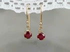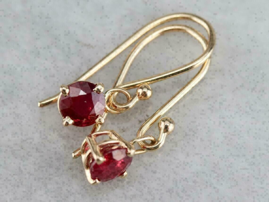 Crafted with elegance, these Solid 14k Yellow Gold Earrings feature a 2-carat round-cut natural red ruby that exudes a rich hue. The gems are set in a prong setting, ensuring they are secure and showcased to their fullest potential. The earrings are designed as dangle/drop style, hanging gracefully from the lobes and fastened with a secure Leverback closure. Each earring is a testament to craftsmanship, with every detail meticulously engraved and each stone carefully selected for its AAA clarity grade. These earrings are a versatile choice for various occasions, from birthdays to weddings. They are also customizable to suit personal preferences. GDGL certified, these earrings come with a seller warranty, assuring their quality and authenticity.