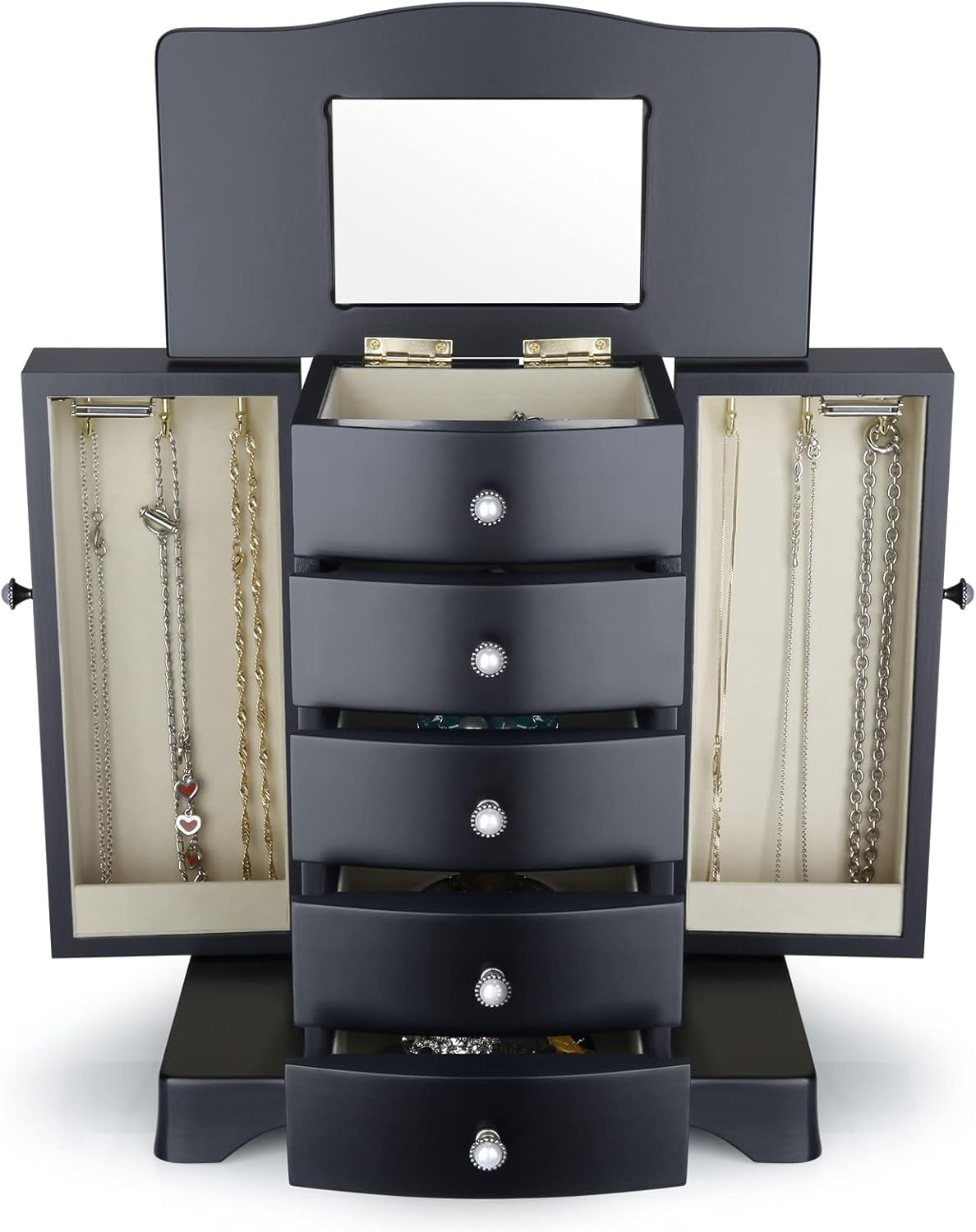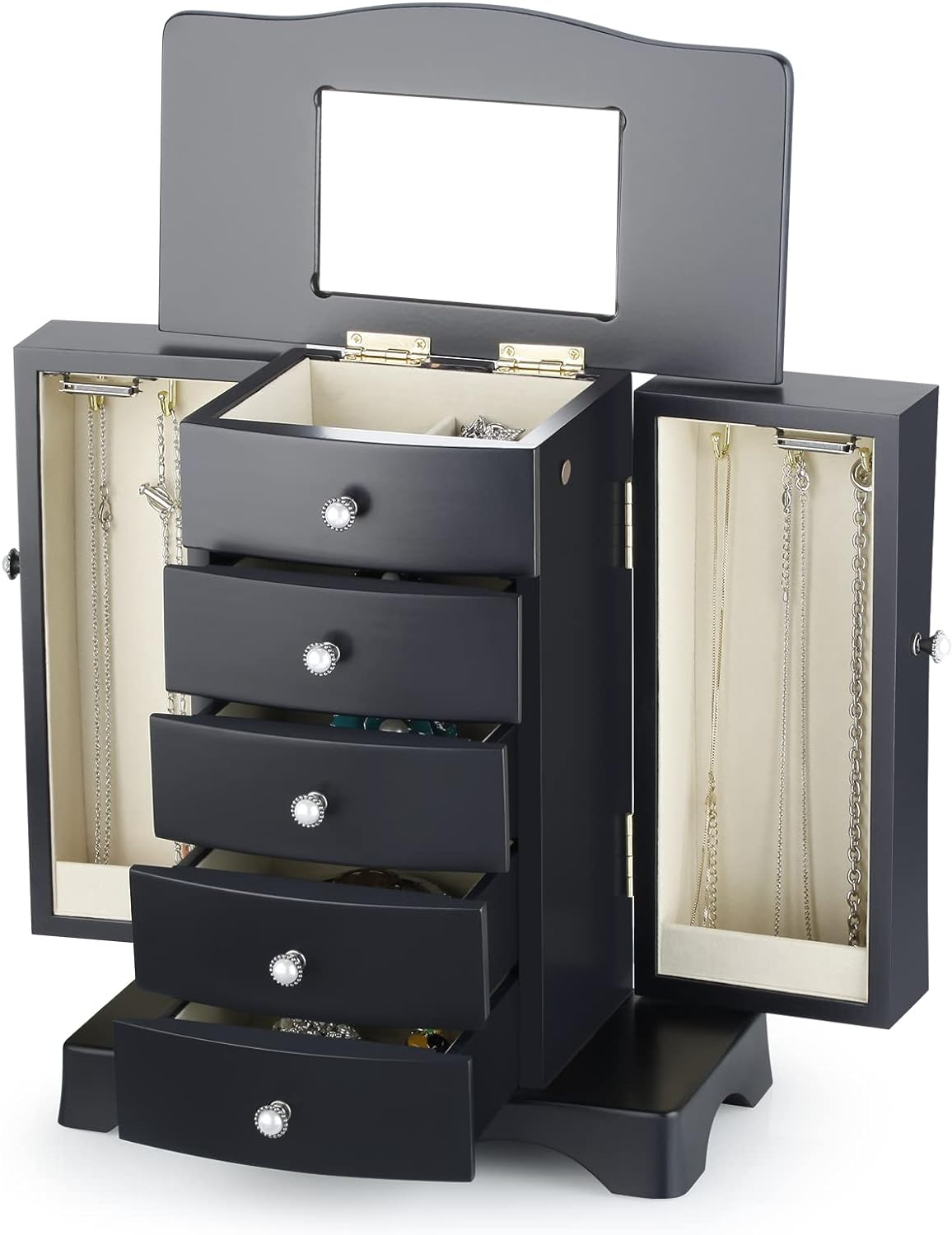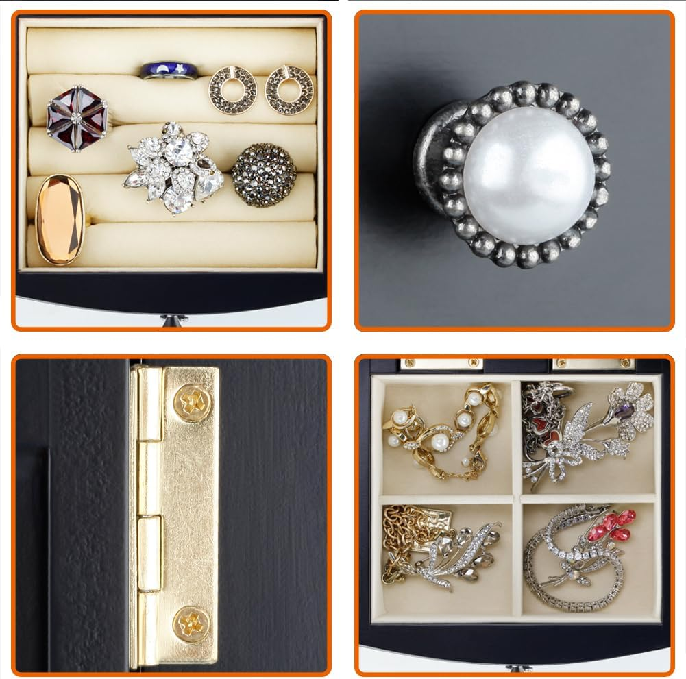 Store New Arrivals Add to Favorite View Feedback Contact Jewelry Box - Made of Solid Wood with Tower Style 4 Drawers Organizer and 2 Separated Open Doors on 2 Sides and Large Mirror Black Description Style Tower Number of Items 4 Country of Origin China Warranty Type Manufacturer Jewelry Storage Type Jewelry Case Number of Compartments 3 Batteries required No Special Feature Solid Wood, Mirror Product Dimensions 10.25"D x 10.25"W x 11.75"H Material Wood Number of Drawers 4 Finish Type Painted Closure Type Magnetic Item Weight 5.58 pounds Occasion Mother's Day, Christmas, New Year, Wedding, Birthday Target Audience Women, Men, Girls Mounting Type Freestanding Color Black Inner Material Velvet Shape Rectangular Recommended Uses For Product Necklace, Bracelet, Ring, Watch, Earring, Bangle Finish types Painted Number of pieces 1 THE ROUND RICH HIGH-GRADE JEWELRY BOX:High-end natural hardwood structure, Anti-Tarnishing velvet lining, exquisite hardware decoration, harmonious color match, highlighting taste and nobility. Packaged in a beautiful GIFT BOX, a gift that women will not refuse! External design:Soft fan-shaped top, Double necklace doors and beautiful pearled door handles and drawer handles provide timeless style and ingenious convenience. 5-Storey tower and large storage space with separate open doors on both sides. Three large drawers and a custom ring drawer, this multi-functional jewellery box is not only exquisite, but also luxurious. Internal Multifunctional Design:4 removable square drawer on the middle, large space storage (It can store necklaces, bracelets, earrings, earpins, hairpins, watches, rings and other jewellery accessories). Large cosmetic mirrors are fitted on top, making it easier to choose jewelry to match your own clothes; 6 Necklace hooks on the top of the doors hung both sides of the open storage space, which can hang a variety of jewlery, and multilayer velvet ring storage device in the bottom drawer. Size:Jewellery box 10.25" x 5.5 " x 11.75" (L*W*H); Drawer Internal Space 4.3" x 3.55"x 1.65" (L*W*H); Mirror Size: 3.2" x 4.8". We provide 24-hour customer service online. If you are not satisfied, you can get a refund within 30 days. Good customer service and product stable quality are always our highest requirements for ourselves. Product Description Solid wooden Jewelry Box Cabinet three-dimensional design, selected materials and fine workmanship create a fashionable look adding decor to your home. Wedding gifts, birthday gifts, this is your best choice! Environmental-protection material,add elegance to this jewlery case, durable. Moisture and corrosion resistant. Velvet liner is moisture and corrosion resistant and offers a clean storage environment for jewelry. Exquisite and removable storage drawers. There are three exquisite hooks on the left and right sides. Hardware accessories of sturdy and durable The velvet ring slot is set in the drawer, which will be better than the vertical ring slot to prevent the rings falling off from the slot. ABOUT US We offer the best prices around on high quality products. Our E-store includes media such as books, movies, music and games while offering electronics, toys, sporting apparel, clothing, tools, general home, garden items and more. SHIPPING We are always working hard to ensure your package arrives as soon as possible. Please understand that some factors like weather, high postal traffic, and the performance of shipping companies are outside of our control. We offer free shipping to the lower 48 states and ship within 2 business days of payment, usually sooner. We do not accept P.O. Boxes. Please provide a physical address. For shipping outside of the continental USA, we only use eBay's Global Shipping Program.The item is shipped to KY and then sent to the rest of the world. International customers are responsible for all duties and taxes. Continue to check out in order to calculate costs for shipping the item to your country. Messages regarding eBay's Global Shipping Program MUST be directed at eBay EXCLUSIVELY. RETURNS We offer a 30-Day Return Policy on items which you are not completely satisfied with. You have the option for a full-refund or an exchange of the item. No returns are available on items shipped outside of the USA. PAYMENT We accept PayPal. CONTACT US This page content is yet to come Please ad us to your favorite seller and visit again later Thank You CUSTOMER SATISFACTION We try our very best to make sure every customer is completely satisfied. If there's a problem, message us! We're happy to help.