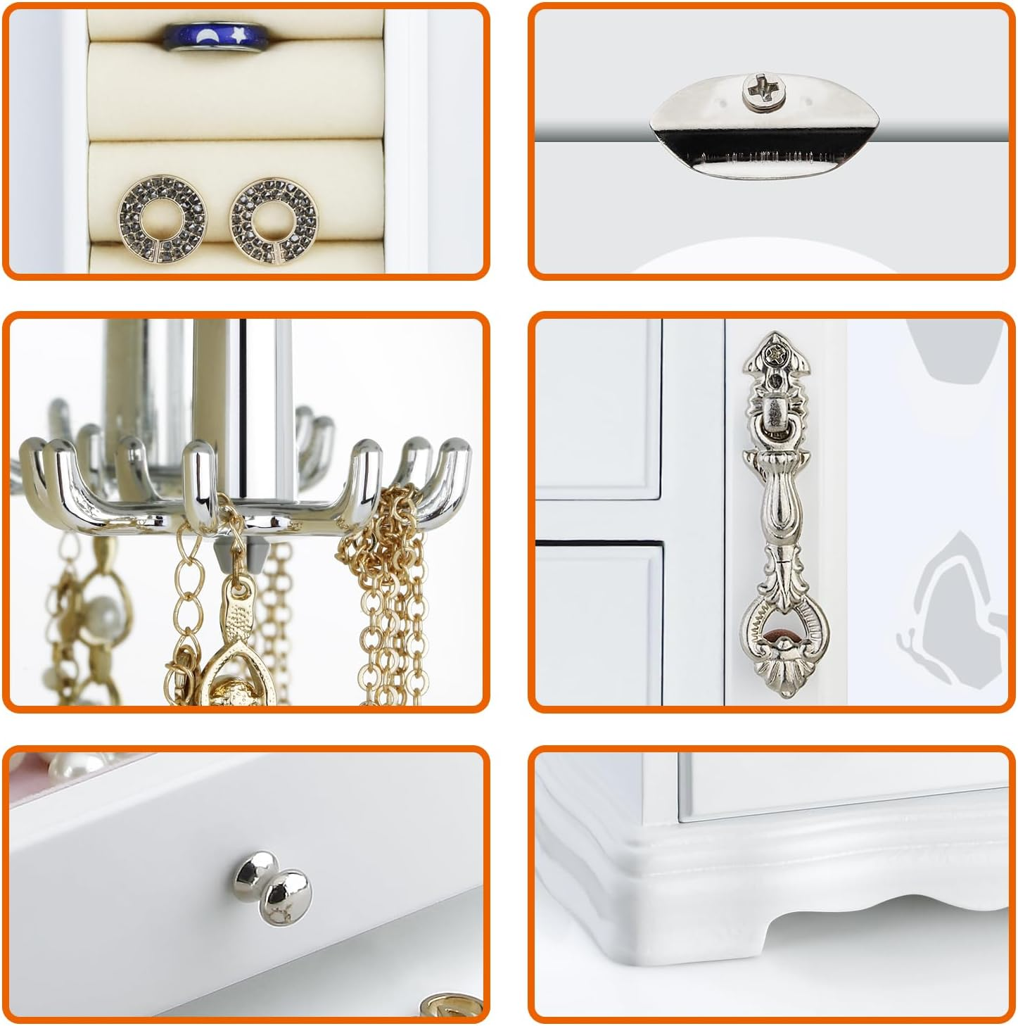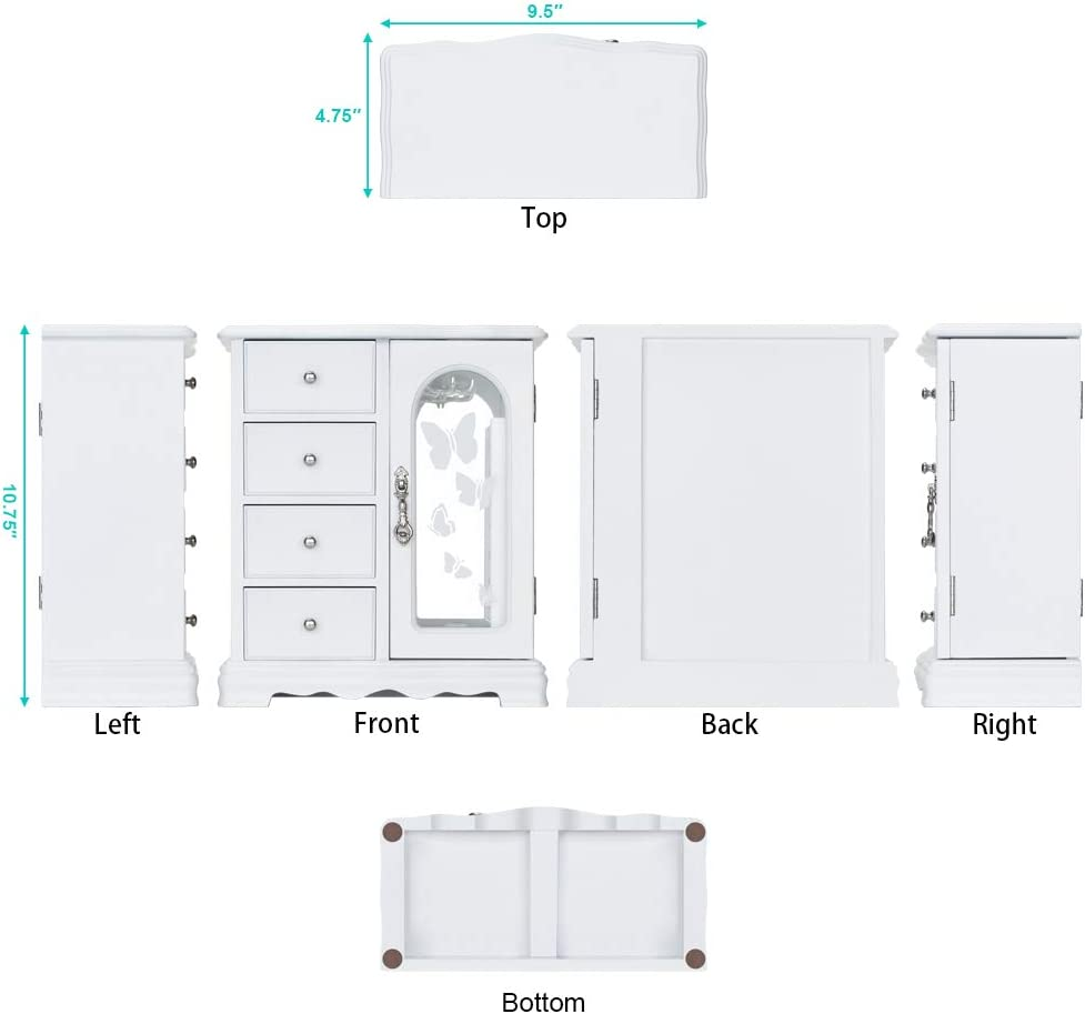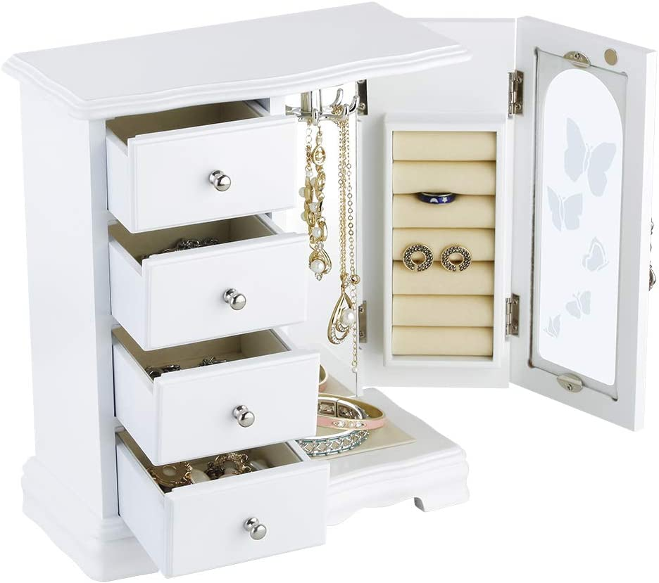 Store New Arrivals Add to Favorite View Feedback Contact Jewelry Box Made of Solid Wood with 4 Drawers Organizer and Built-In Necklace Carousel and Large Mirror White Description Item model number RR-ZQ-0001 Style Fashion White Number of Items 1 Closure Type Not relevant for this product Batteries Included? No Batteries Required? No Number of Compartments 1 Special Feature Removable Product Dimensions 4.75"D x 9.5"W x 10.75"H Material Wood Number of Drawers 4 Is Discontinued By Manufacturer No Item Package Quantity 1 Item Weight 4.3 pounds Finish Painted Occasion Wedding, Birthday Special Features Removable Target Audience Women Part Number RR Mounting Type Freestanding Color White Finish Type Painted Inner Material Velvet Shape Rectangular Recommended Uses For Product Necklace, Bracelet, Ring, Watch, Earring Size 9.3 x 4.75 x 10.75 in Number Of Pieces 1 💝THE ROUND RICH HIGH-GRADE JEWELRY BOX:High-end natural hardwood structure, Anti-Tarnishing velvet lining, exquisite hardware decoration, harmonious color match, highlighting taste and nobility. Packaged in a beautiful GIFT BOX, a gift that women will not refuse! 💝External design:The top and bottom adopt the unique design style of wavy shape, 4-Drawers storage, each drawer has a silver handle. It looks beautiful and easy to open or close the drawer. 360 degree fully open butterfly pattern revolving glass door, adsorption of magnets when closed. The appearance is smooth, clean, comfortable and beautiful. 💝Internal Multifunctional Design:Removable square drawer on the left, large space storage (It can store necklaces, bracelets, earrings, earpins, hairpins, watches, rings and other jewellery accessories). The right side is equipped with stereo lenses, making it easier to choose jewelry to match your own clothes; The top is equipped with necklace carousel horse, which can hang a variety of jewelry; and a multi-layer velvet ring storage device. 💝Size:Jewellery box 9.5" x 4.75" x 10.75" (L*W*H); Drawer Internal Space 3.2" x 3.2"x 1.8" (L*W*H); Mirror Size: 3.5" x 9.25". 💝This elaborate jewelry box will protect all your accessories from scratches and offers a clean storage environment for jewelry. Product Description RR ROUND RICH DESIGN High-end and fashionable wooden jewelry boxes Product Description Cabinet three-dimensional design, Selected materials and fine workmanship create a fashionable look adding decor to your home. Wedding gifts, birthday gifts, this is your best choice! Environmental-Protection material, add elegance to this jewlery case, durable. Moisture and corrosion resistant. Velvet liner is moisture and corrosion resistant and offers a clean storage environment for jewelry. Wooden Jewelry box Material: Wood. Surface Cover Material: Environmentally paint, glass. Care and cleaning: Wipe clean, put in shade, dry, ventilated. Color: White Weight: 4.3 pounds Dimensions: 9.5" x 4.75" x 10.75" (L*W*H) 4-Drawers internal size: 3.2" x 3.2"x 1.8" (L*W*H) Placement position: Shading Exquisite and removable storage drawers. 8-claws Necklace hook capable of rolling and rotating freely. Classic and elegant bronze door handle Multi layer velvet ring slots Dimensions 9.3 x 4.75 x 10.75 inches 10.25 x 5.5 x 11.75 inches 9 x 4.7 x 9.3 inches 9.25L x 4.75W x 10.75H inches 11.63L x 5.5W x 12.13H inches 13.5L x 5W x 13.2H inches Dimensions 9.3 x 4.75 x 10.75 inches 10.25 x 5.5 x 11.75 inches 9 x 4.7 x 9.3 inches 9.25L x 4.75W x 10.75H inches 11.63L x 5.5W x 12.13H inches 13.5L x 5W x 13.2H inches Item Dimensions 9.3 x 4.75 x 10.75 inches 10.25 x 5.5 x 11.75 inches 10 x 6.4 x 6 inches 9.25L x 4.75W x 10.75H inches 11.63L x 5.5W x 12.13H inches 13.5L x 5W x 13.2H inches ABOUT US We offer the best prices around on high quality products. Our E-store includes media such as books, movies, music and games while offering electronics, toys, sporting apparel, clothing, tools, general home, garden items and more. SHIPPING We are always working hard to ensure your package arrives as soon as possible. Please understand that some factors like weather, high postal traffic, and the performance of shipping companies are outside of our control. We offer free shipping to the lower 48 states and ship within 2 business days of payment, usually sooner. We do not accept P.O. Boxes. Please provide a physical address. RETURNS We offer a 30-Day Return Policy on items which you are not completely satisfied with. You have the option for a full-refund or an exchange of the item. No returns are available on items shipped outside of the USA. PAYMENT We accept PayPal. CONTACT US This page content is yet to come Please ad us to your favorite seller and visit again later Thank You CUSTOMER SATISFACTION We try our very best to make sure every customer is completely satisfied. If there's a problem, message us! We're happy to help.