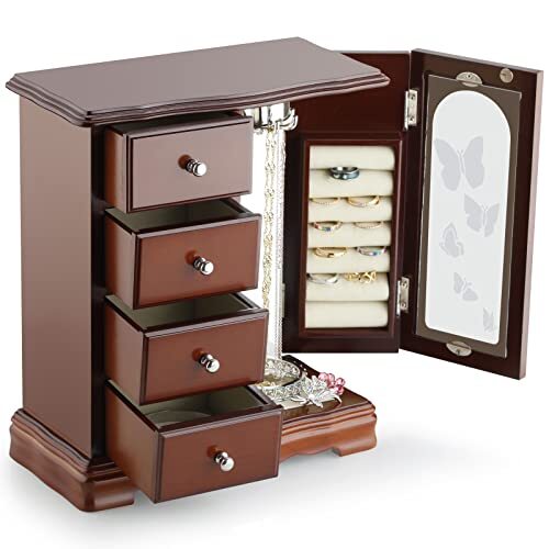 Menu 1. We require immediate payment. 2. We currently accept payment via eBay managed payments only. 3. Once payment is cleared, we will dispatch your shipment within 1-3 business days. Please refer to the "Shipping" tab for more information regarding shipping speed to your destination. Jewelry Box - Made of Solid Wood with 4 Drawers Organizer and Built-in Necklace Carousel and Large Mirror Brown Product description ?THE ROUND RICH HIGH-GRADE JEWELRY BOX:High-end natural hardwood structure, Anti-Tarnishing velvet lining, exquisite hardware decoration, harmonious color match, highlighting taste and nobility. Packaged in a beautiful GIFT BOX, a gift that women will not refuse! ?External design:The top and bottom adopt the unique design style of wavy shape, 4-Drawers storage, each drawer has a silver handle. It looks beautiful and easy to open or close the drawer. 360 degree fully open butterfly pattern revolving glass door, adsorption of magnets when closed. The appearance is smooth, clean, comfortable and beautiful. ?Internal Multifunctional Design:Removable square drawer on the left, large space storage (It can store necklaces, bracelets, earrings, earpins, hairpins, watches, rings and other jewellery accessories). The right side is equipped with stereo lenses, making it easier to choose jewelry to match your own clothes; The top is equipped with necklace carousel horse, which can hang a variety of jewelry; and a multi-layer velvet ring storage device. ?Size:Jewellery box 9.5" x 4.75" x 10.75" (L*W*H); Drawer Internal Space 3.2" x 3.2"x 1.8" (L*W*H); Mirror Size: 3.5" x 9.25". ?This elaborate jewelry box will protect all your accessories from scratches and offers a clean storage environment for jewelry. PLEASE MESSAGE US IF YOU HAVE ANY OTHER QUESTIONS, AND MANY THANKS FOR READING ALL OF THIS. Copyright ©#. All Rights Reserved.