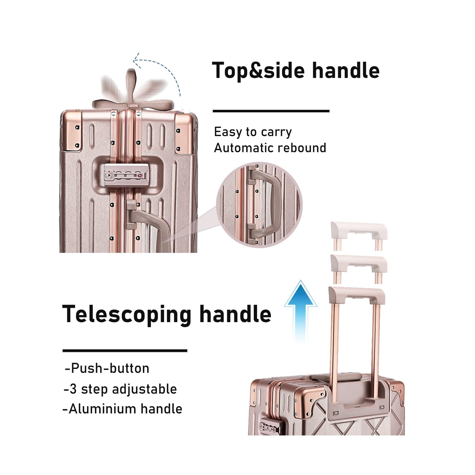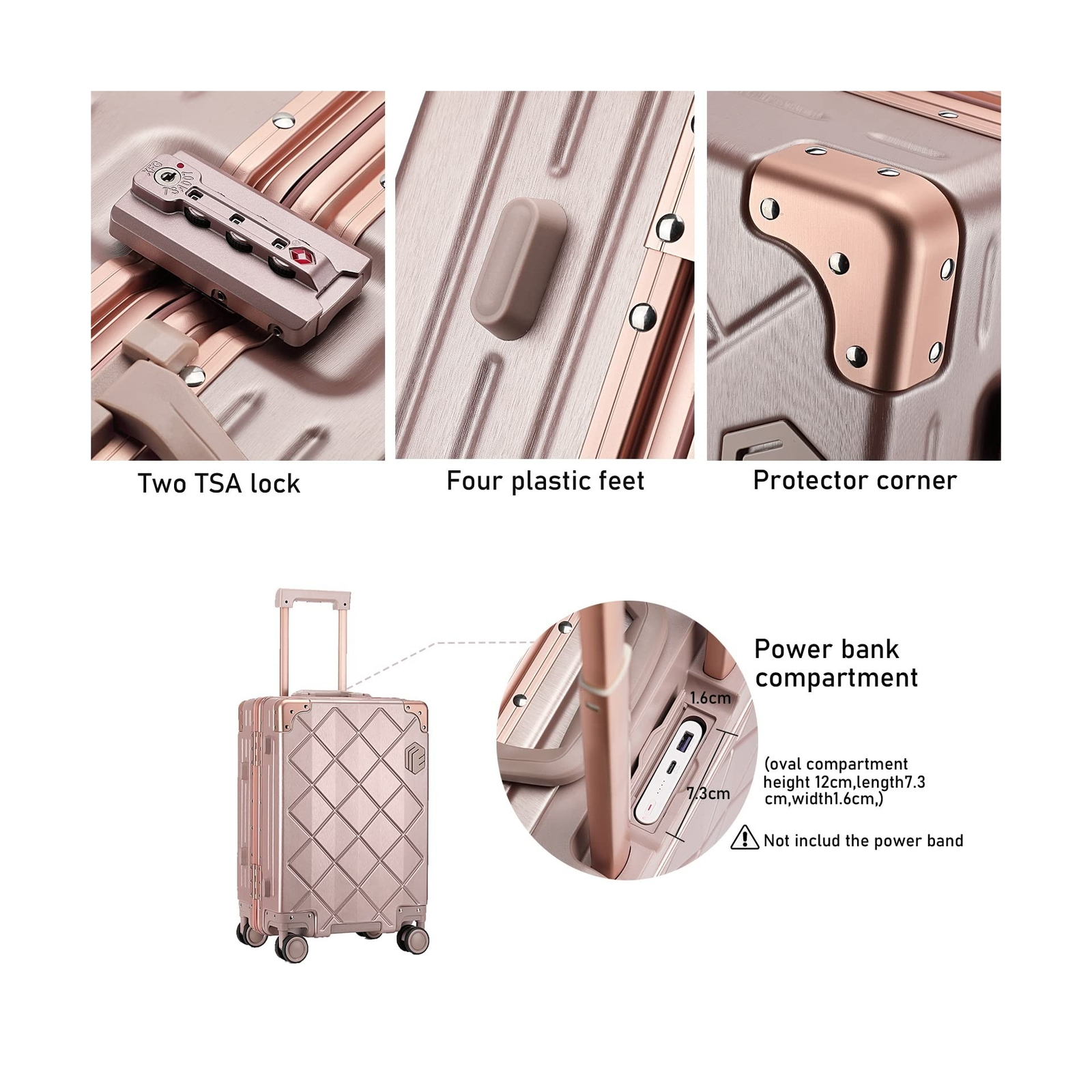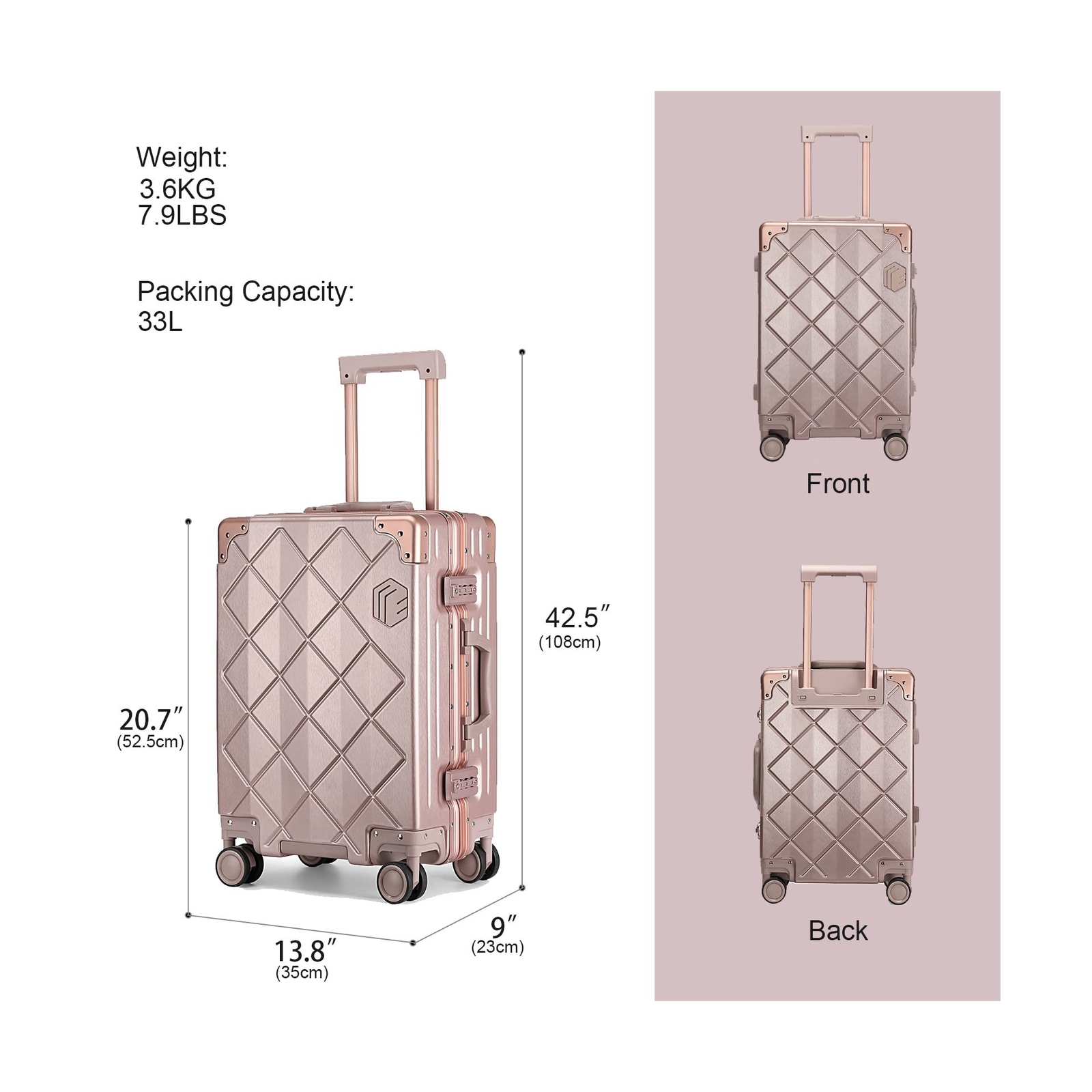Somago Carry On Luggage with Spinner Wheels 20in Lightweight Suitcase Built in TSA Aluminum Frame PC Hardside Rolling Suitcases Travel Case (Rose Gold) Description Features: Durable and High-end MaterialMade of 100% NEW PC materials, providing anti-scratch technology and outstanding durability. We offer a 5-YEAR GUARANTEE replacement service covering all manufacturing defects Dimensions13.8 x 9 x 20.7 inches (LxWxH, including wheels and short carrying handle), It features 4 double spinner wheels ensure smooth-rolling mobility in any direction. Hardside spinner carry on luggage idea for work travel, vacations, weekend getaways, or back to school. TSA Lock & Aluminum Alloy Lock TSA customs lock easy pass most countries custom check, providing you with more security when travel. This suitcase adopt aluminum frame closure instead of the traditional zipper closure. more fashionable and convenient. Unlike other luggage zippers, aluminum alloy locks are more convenient to open and close with just push down. Multi-functional Carry On Luggage Especially designed removable inner storage bag, you can remove or install as you see fit, makes your luggage organised, improve space utilization. YKK ZipperThis spinner travel trolley case equipped with YKK zipper that used in most entry luxury brand hard shell suitcase. It uses 5 strands thread to protect the rubber teeth from deformation and lifting, 3 times stronger than normal zipper.(Ordinary zippers only use 2 strands thread). Product Details: Product Dimensions: 20.67 x 13.78 x 9.06 inches Item Weight: 8.03 pounds Department: Unisex Manufacturer: Somago Item model number: Somago-2023 Capacity: 33 Liters Item Weight: 3.65 Kilograms Capacity Total: 33 Liters Shipping Most orders will be shipped within 1 business days once we receive your payment. Except on weekend or public holidays. A shipping notification will be emailed to you once your order has been shipped. International shipping via eBay Global Shipping Program. No shipping to AK, HI, PR, APO/FPO, US Protectorates and PO Box. Payment We Accept Payment Via PayPal and All Major Credit Cards. Return We stand behind our products. Items can be returned for exchange or full refund within 30 days from the date you receive your merchandise. Return shipping is the responsibility of buyer unless the return is a result of our mistake (i.e., your receive the wrong item). We will pay for shipping replacement back to you if an exchange of the same product is requested. Contact us If you have any questions please contact us. We respond within 1 business day or less.