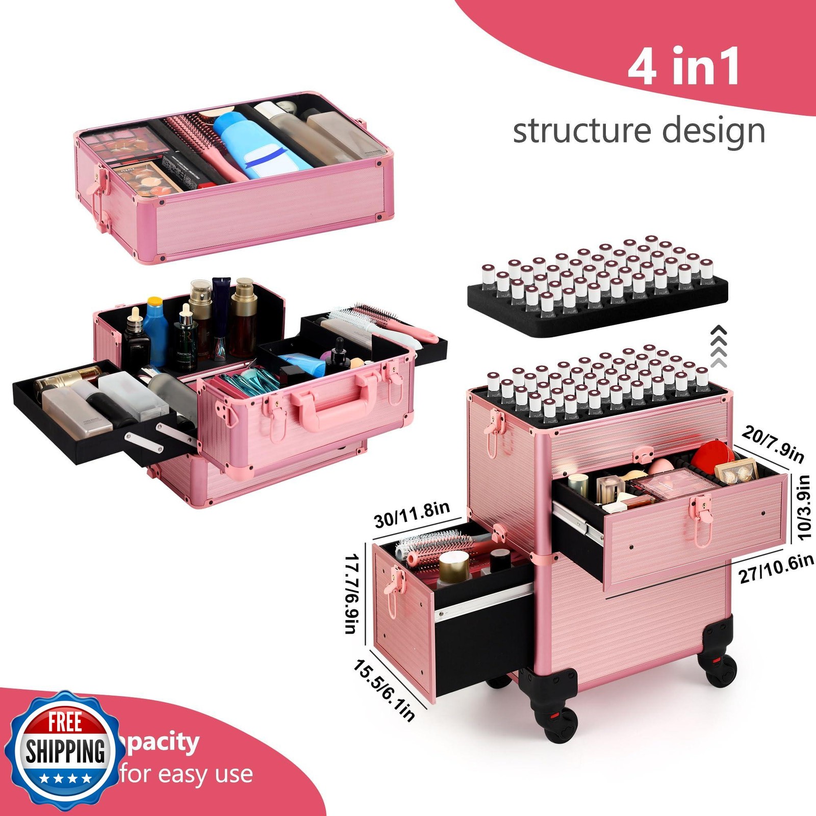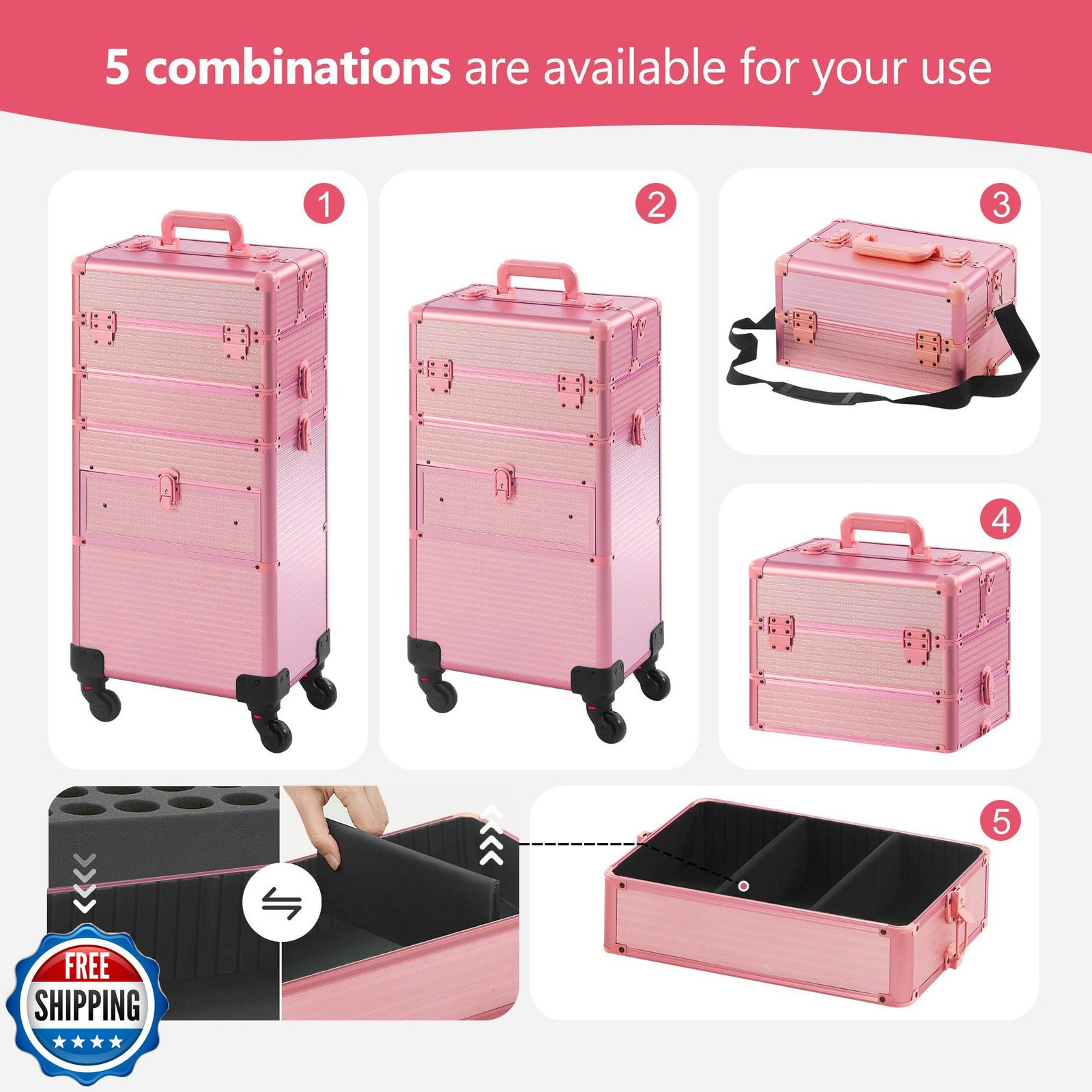 Somduy Rolling Makeup Case with Drawer, Makeup Train Case, 4 in 1Cosmetology Case on Wheels, Christmas Gift, Large Makeup Case Organizers, Profesional Cosmetic Case for Salon Barber, Light pink Features 【Versatile 5-in-1 Makeup Travel Case:】This makeup train case is a true chameleon, offering you the flexibility to customize it to your exact needs. With 4 detachable compartments, you can easily create the perfect setup. Use the top compartment as a portable makeup box, and remove the middle and bottom compartments as needed. 【Drawer Design:】For convenient use, the bottom layer is designed with two drawers, eliminating the need to open and close the tray repeatedly. The middle tray is equipped with nail polish tray, which can be chosen as needed. When removed, it can be used as a separate tray for other items. 【Safety and Portability:】The makeup case organizer is secured with two locks on each layer, ensuring the safety of items with handles on the top. The telescopic handle is adjustable, meeting the needs of individuals of varying heights. The first layer of the case comes with a shoulder strap for separate use. 【Detachable Swivel Wheels:】The wheels can be removed as needed to keep them static. They can rotate 360°and lock 【Multi-scene Use:】 Easy to carry around and save effort, perfect for professional makeup artists, manicurists, hair stylists, beauticians, manicurists, tattoo artists or people who have a mountain of makeup. Shipping Free & Fast Shipping: We offer free shipping to most of the USA with a normal delivery time of 3-7 days. However, due to the current situation, additional delivery time (up to 3 weeks) may be required for some items. Alternative Carriers: We may use alternative carriers (e.g., USPS, FedEx, UPS) to ensure your package arrives safely and on time. Due to the use of multiple carriers, we are unable to provide a tracking number automatically. Handling Time: Orders are processed and shipped within 1-2 business days of receiving cleared payment. Shipping Restrictions: Shipping to Alaska, Hawaii, Puerto Rico, Guam, and other US territories may incur shipping charges or delivery restrictions. Please contact us before ordering, or your order can be refunded/cancelled. State Restrictions: Certain items may not be shipped to California due to state regulations. Contact for Tracking Updates: If you require tracking updates or have any concerns about the delivery of your order, please feel free to contact us, and we will be happy to assist you. Return Policy 30-Day Hassle-Free Returns: If you are not completely satisfied with your purchase, you can return the item for free within 30 days of receiving it for a full refund or exchange. Easy Return Process: Contact us, and we will provide you with a prepaid return shipping label and detailed instructions. No Restocking Fee: There are no restocking fees for returns. However, the buyer is responsible for return shipping costs if the return is not due to a seller"s error. Refund Processing: Refunds will be processed within 1 business day of receiving the returned item in its original condition. Feedback Your feedback is extremely important to us. We strive to provide the best products and customer service possible. If you are satisfied with your purchase, please take a moment to leave us a positive review. If you have any concerns or issues with your order, please contact us before leaving negative feedback. We are committed to resolving any problems and ensuring your satisfaction. Contact Us If you have any questions or concerns, please feel free to reach out to our customer support team. You can contact us through the eBay messaging system. We are available Monday to Friday, 9:00 am to 5:00 pm EST, and we will do our best to respond to your inquiry within 24 hours. Thank you for supporting our small family business!