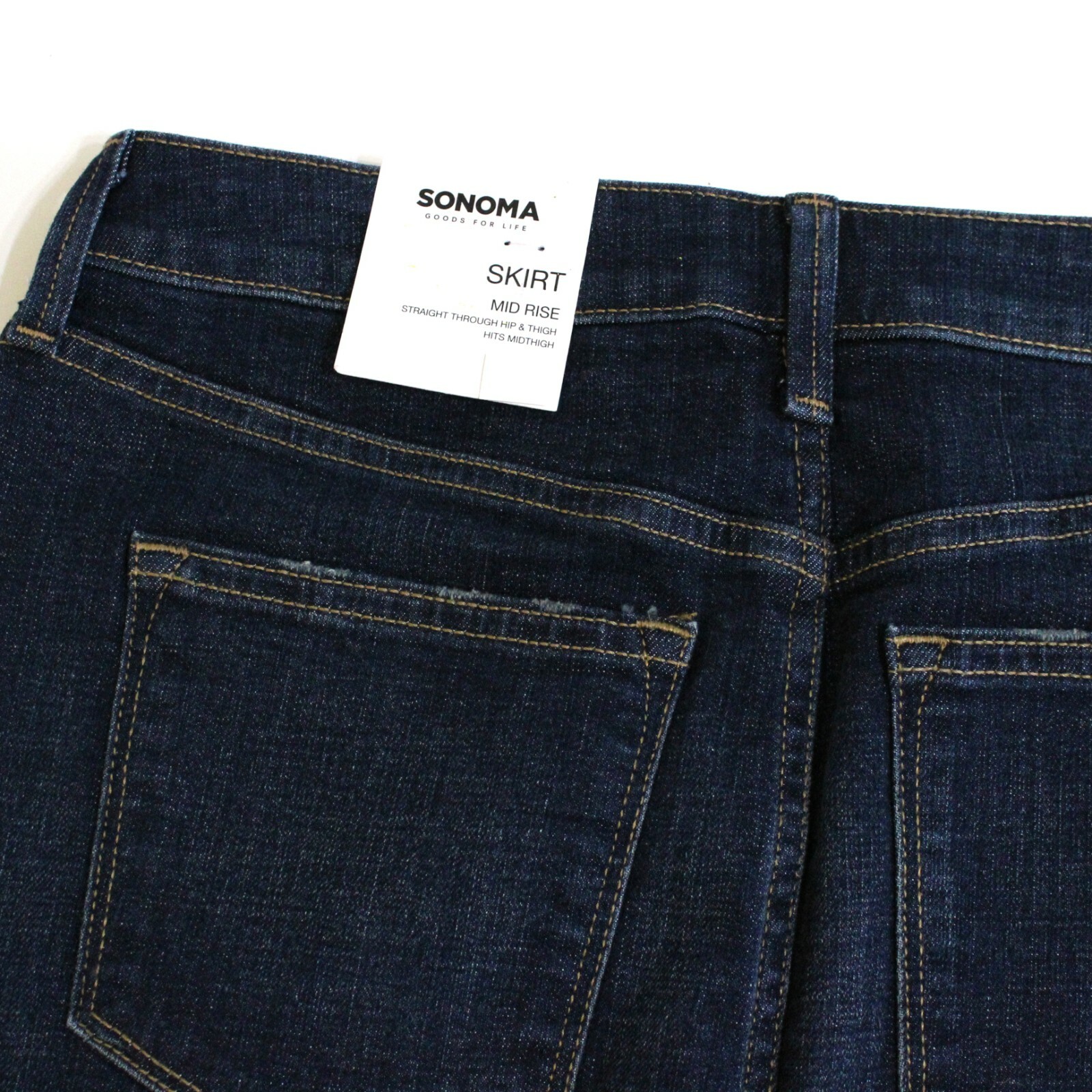 New with Tags Sonoma Denim Blue Jean Skirt Labeled Medium Wash (I personally feel this is closer to a dark wash rather than medium) Mid Rise Straight Through Hip & Thigh Short Above Knee - Hits Mid Thigh 78% Cotton/20% Polyester/2% Spandex Machine Wash Women's Size 4 Regular The waist measurement is approximately 15 inches across, laying flat. The length taken from the back of the skirt to the bottom hem is approximately 19 3/4 inches.