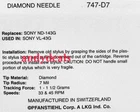 TURNTABLE STYLUS NEEDLE for Sony ND-143G ND143G VL-43 VL43 PS-LX330 747-D7, PHONOGRAPH TURNTABLE NEEDLE for Sony ND-143G ND143G VL-43 VL43 PS-LX330 747-D7 Model Pfanstiehl 747-D7 Description Brand New (factory box) Generic replacement stylus Diamond .7 mil conical tip needle 1.8 grams tracking Speeds: 16, 33 & 45 RPM REPLACES needles listed below NEEDLE S EVG PM2979D SONY ND-143G ND143G CARTRIDGES SONY VL-43G VL-43G MODELS SONY ALLIANCE30 ALLIANCE30MKII ALLIANCE33 ALLIANCE 33MKII ALLIANCE40 ALLIANCE40R ALLIANCE55 ALLIANCE 55MKII COMPACT33 DIMENSION V11 DIMENSION VIIW FH-3 FH3 FH-3MKII FH3MKII FH-7 FH7 FH-7MKII FH7MKII L3TV10 PRECISE-V33 PRECISEV33 PRECISE-V33R PRECISEV33R PRECISE-V33W PRECISEV33W PS-LX1 PSLX1 PS-LX10 PSLX10 PS-LX20 PSLX20 PS-LX30 PSLX30 PS-LX330 PSLX330 PS-LX330P PSLX330P PS-LX10 PSLX10 PS-Q7 PSQ7 PS-Q3 PSQ3 PS-Q3A PSQ3A PS-Q7 PSQ7 PS-Q7 PSQ7 SU-V2 SUV2 SU-V2B SUV2B SU-V4 SUV4 SU-V4B SUV4B TC-78 MKII TC78 MKII