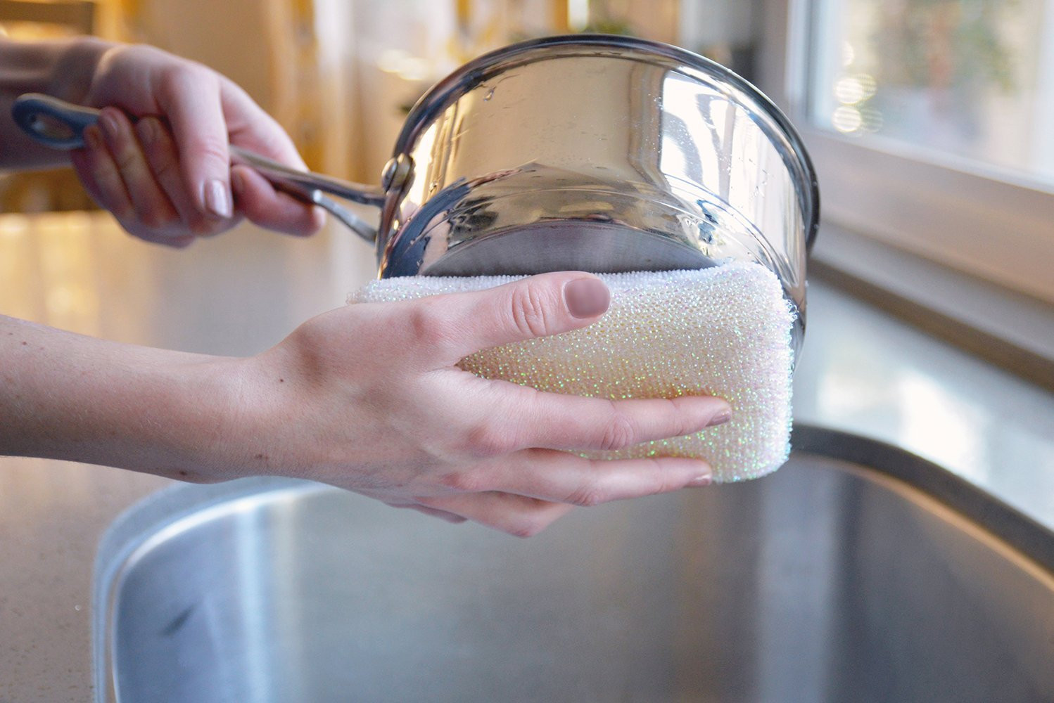 Sophisti-Clean Stainless Steel Multipurpose Cleaning Sponges, Dual-Sided Sponges, White, Pack of 4 GREAT FOR POLISHING: The luxurious microfiber side is great for drying, polishing, and cleaning. TOUGH ON GRIME: The unique lurex finish on one side is perfect for tough scrubbing. EXCELLENT ON NON-STICK: The dual-sided sponges are safe for use on non-stick and stainless steel surfaces. MULTI-PURPOSE: Use these sponges for washing dishes and cleaning counters in the kitchen as well as scrubbing in the bathroom, using in crafts and more. The set of four means you'll have plenty for different needs! EASY TO CLEAN: The sponges are machine washable. Never worry about how to clean your sponges again!