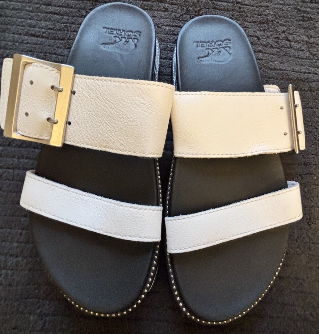 Sorel Women's Roaming Slide Sandal size 5 Excellent condition no damage or stains The Details Full grain leather upper Pigskin lining Molded rubber outsole Cushioned rubber midsole Oversized buckle closure Materials & Care Leather, Rubber Imported