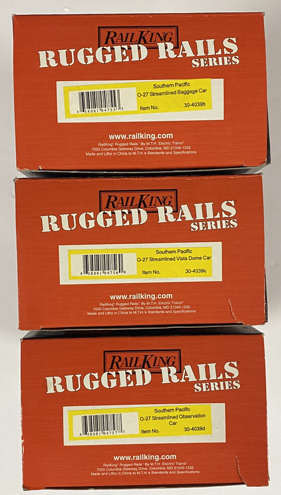 *EXTREMELY RARE* Southern Pacific Streamlined Cars Lionel Rail King 30-4039b,c,d. This set is brand new, only opened for pictures and to be tested. Tested and in working condition. INCREDIBLE details and lighting. Boxes are in great condition. Ships FULLY INSURED via UPS Ground US ONLY. If you have any further questions feel free to contact me. Thanks for your interest!
