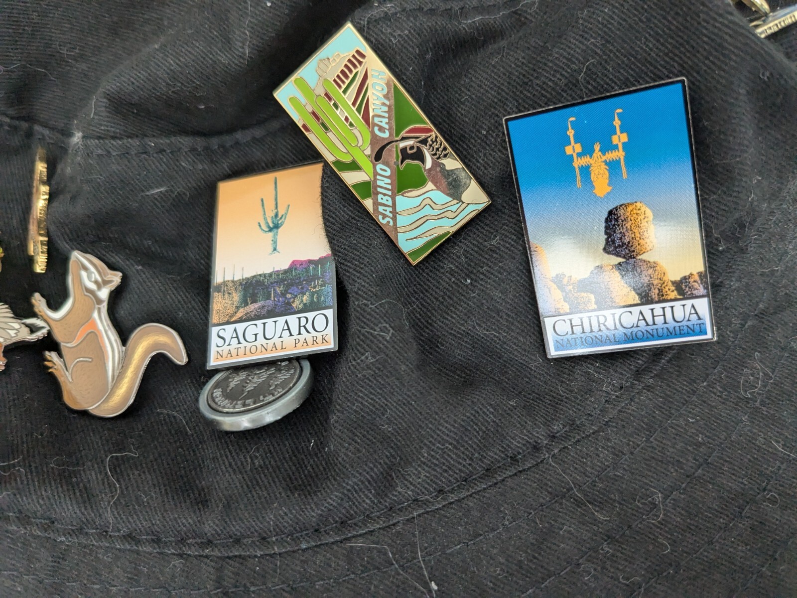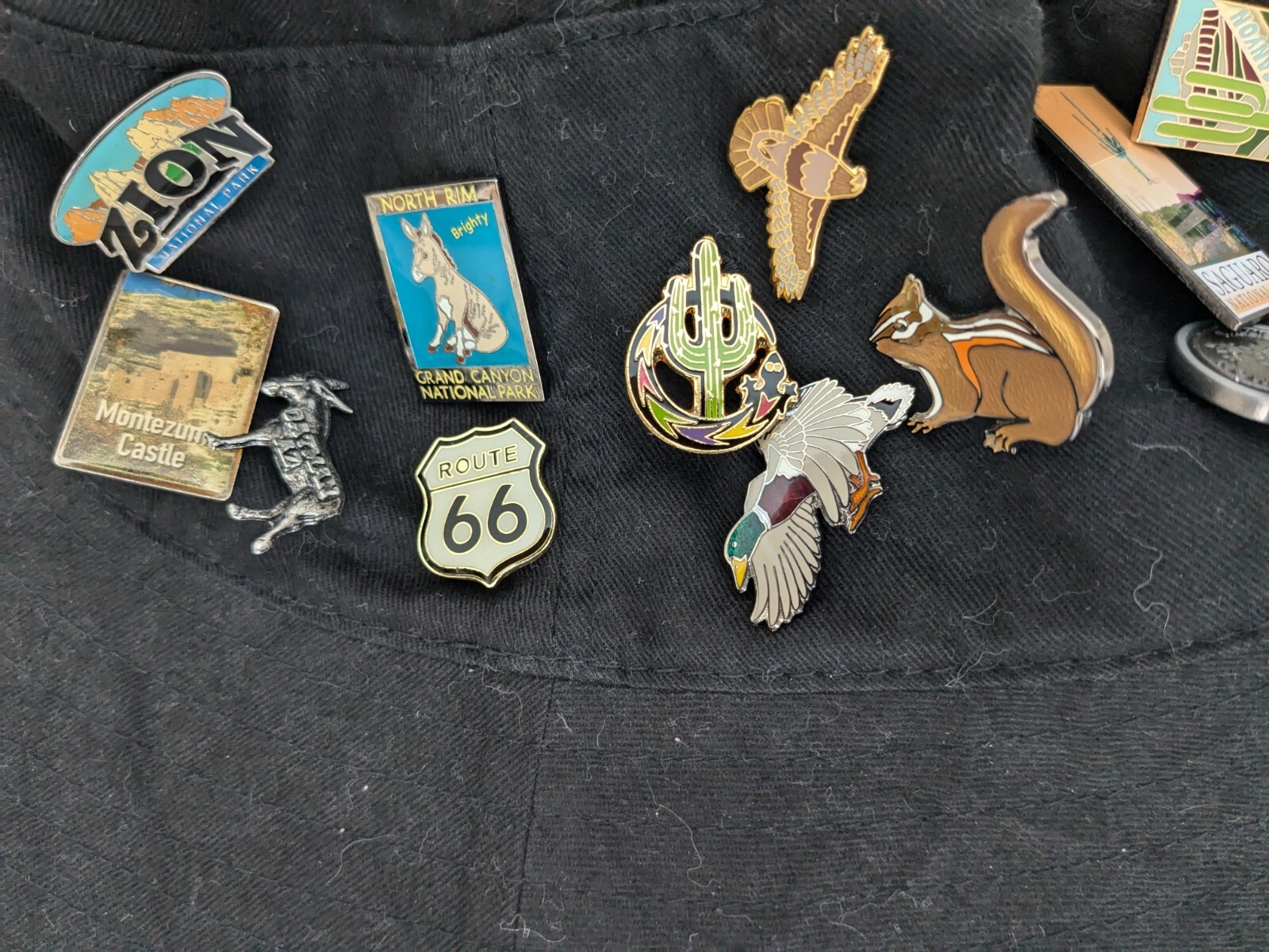 Hat is from the company from which the owner took a hot air balloon ride in about 2012. Pins are largely from Arizona but also include places like Zion National Park and Hoover Dam. Also included are several animals and birds prevalent in the southwest. Great item for any person who has visited this area or just has great interest in.