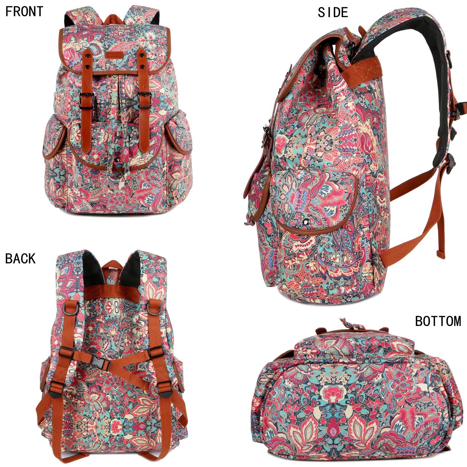 *PRACTICAL: This Large rucksack is ideal for daily use such as work, traveling, hiking, Mountaineering and Camping. *LARGE CAPACITY: 18"H*13"L*7"W / 46H*33L*18W cm. CAPACITY: 25L. Interior slot pocket for 15.6" laptop *STRUCTURE: Large main compartment for your daily essentials. Inner pockets include 2 slip pockets, 1 padded compartment for tablet or laptop. 1 front pocket, 2 side pockets *HIGH QUALITY MATERIAL: Soft Original Floral Printing and Red color Lining Polyester *STYLISH : Flap cover with 2 magnet buckles and drawstring closure at main compartment do secure your items *LIFETIME WARRANTY We stand behind our products and offer a 100% Lifetime Money Back Satisfaction Guarantee LARGE CAPACITY:18"H*13"L*7"W / 46H*33L*18W cm. CAPACITY:Interior slot pocket for 15.6" tablet or laptop PRACTICAL: This Large Rucksack is ideal for daily use such as work, traveling, hiking, Mountaineering and Camping. STYLISH : Flap cover with 2 magnet buckles and drawstring closure at main compartment do secure your items HIGH QUALITY MATERIAL: Soft Original Floral Printing and Red color Lining Polyester LIFETIME WARRANTY: We stand behind our products and offer a 100% Lifetime Money Back Satisfaction Guarantee SAVE MORE MONEY: FREE Toiletry Bag($12), Good Travel Partner!