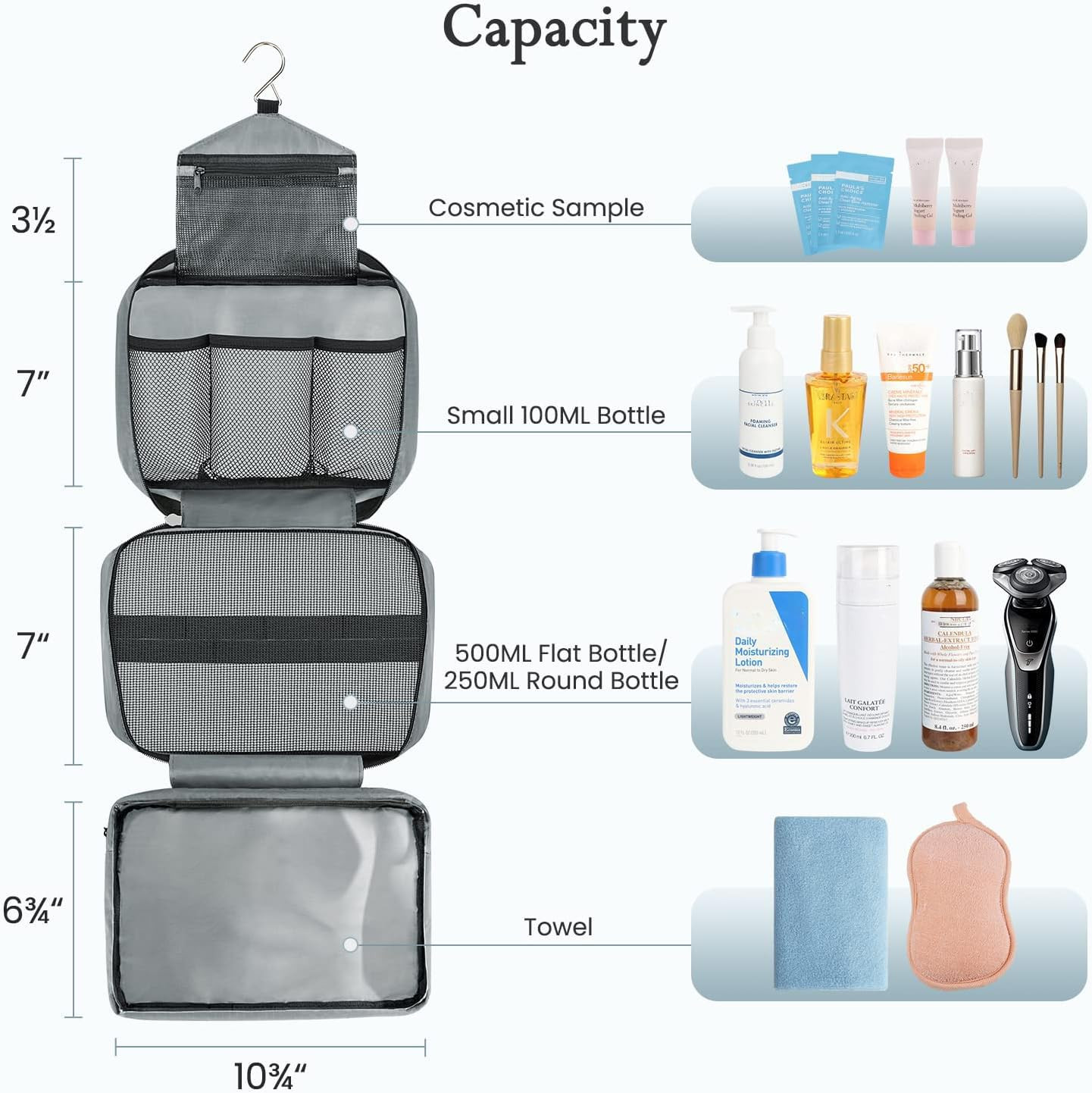 Compact Design With Large Capacity - 11.2"L x 4.87"W x 7.6"H with 6.4Ounces, upgraded large travel bag gives you enough space to pack all vacation accessories in one bag; This expandable case can hold 8 x 360ml bottle water with zipper closed and still slim enough to pack into your carry on travel case Multifuction And Hang For Easy Access - Our waterproof travel bathroom bag will not be more unpacked and mess up your countertop; Utilize the zip around design and the attached hanging hook to hang the shower bag on bathroom door, shower rod or towel rack for fast access to your hygiene products Multiple Compartments Organizer - travel organizer bag with the 4 different compartments: the ventilated pocket, elastic loop pocket, mesh pocket and clear plastic pocket to keep everything organized; Wet items can be held in the transparent see through pocket to keep other pockets dry Durable Material With Double Zipper - Travel organizer toiletries are made of the advanced leakproof Nylon can prevent liquid from leaking through the bag; Reinforced zipper is used to ensure durability and smooth opening; Rest assured knowing that all your bottles are in upright position and secure Easy-Grab Handle - You can take the toiletry bag anywhere with the portable and convenient grab handle; Great for overnight staying, a long journey, gym shower and outdoor activities