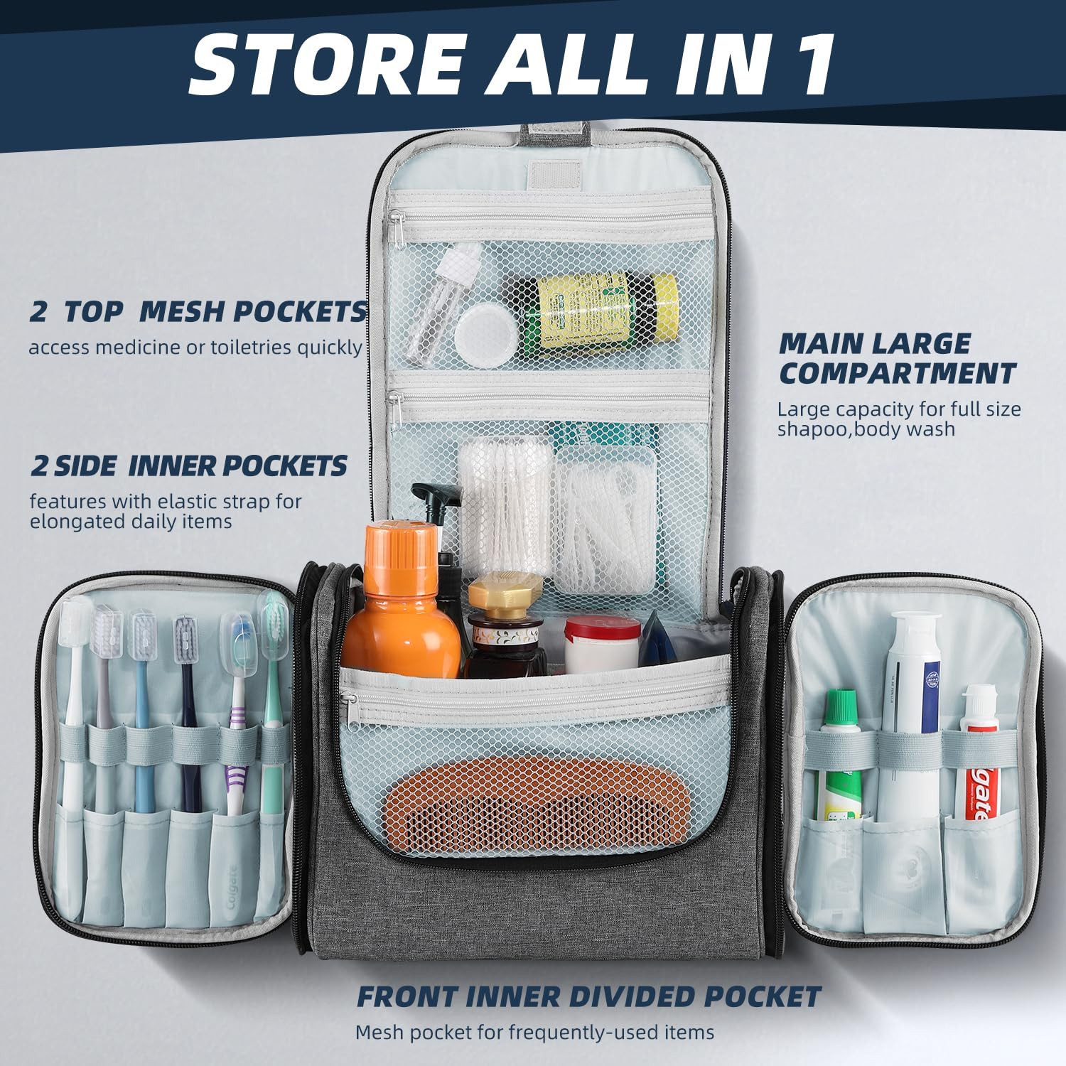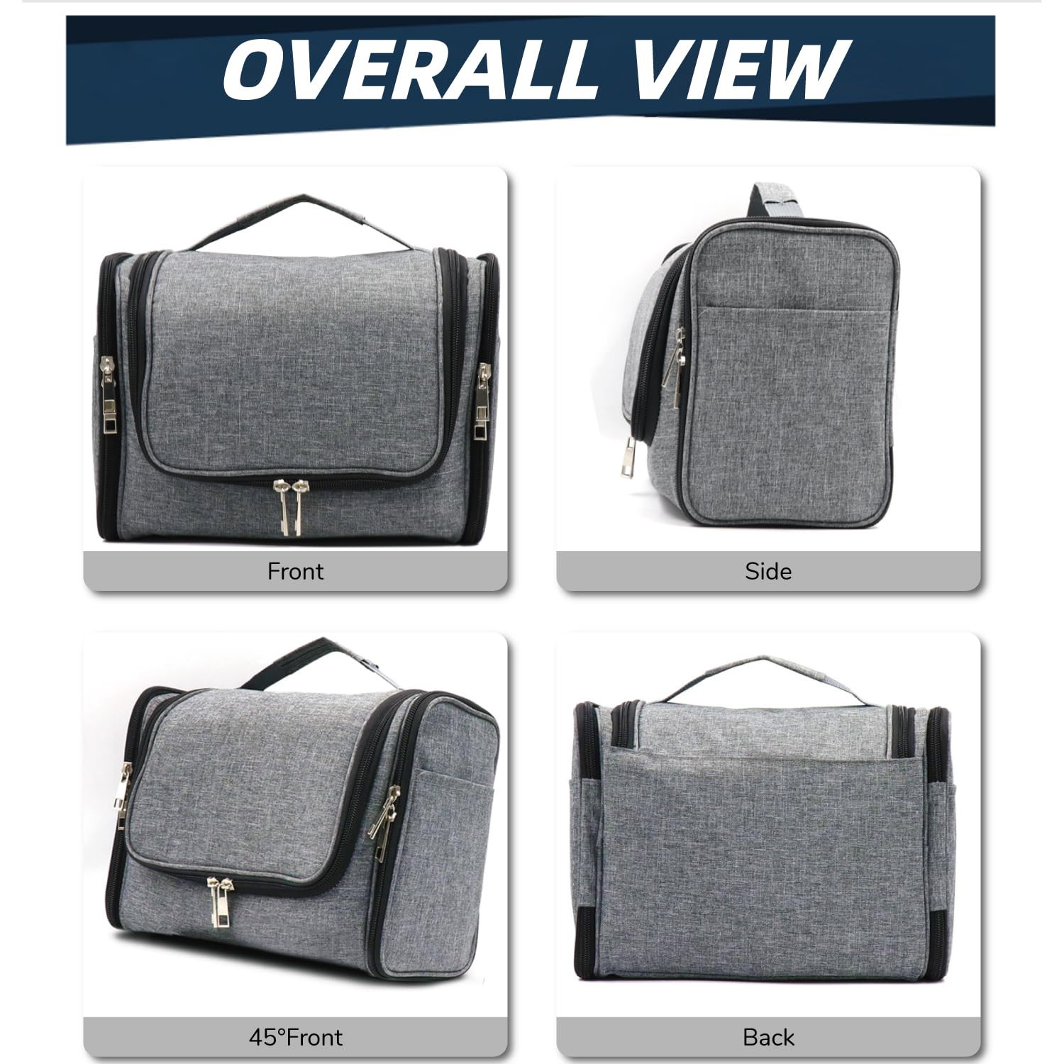 Large Capacity: large toiletry bag measures 11 x 6.2 x 8.8 inches (27.94 x 15.75 x 22.35 cm), and the X-Large size is 12.5 x 7.3 x 11 inches (31.75 x 18.54 x 27.94 cm). Whether for personal trips or family travel, you can easily pack all your toiletries into one bag, avoiding the hassle of carrying multiple smaller bags Soft and Lightweight Nylon: The large-size toiletry bag weighs only 12.35 oz (350g), while the X-Large size is 17.64 oz (500g), making it so lightweight that you’ll hardly notice the bag’s weight when traveling. Made from soft nylon, the material is durable, water-resistant, and scratch-resistant, ensuring long-lasting use and protection for your belongings Multiple Pockets and Compartments: The toiletry bag has more pockets and compartments than you might expect! It features 2 top mesh pockets ideal for small items like medicine and wet wipes. There is also a large main storage pocket for travel-size and normal-size toiletries, with internal compartments designed to keep liquid bottles upright. Additionally, the 2 side pockets are perfect for long, slim items such as makeup brushes, toothpaste, toothbrushes, and more Practical Hanging Hook: Our hanging toiletry bag features the HANGING function, the metal hook helps you hang the whole bag on the wall, especially in a narrow bathroom, camping tent, or RV. The hanging toiletry bag would save space and be convenient for accessing items while bathing Smooth Double Zipper: Far differing from other toiletry bags Dopp kit adopted aluminum alloy double zippers. The zipper is smooth and strong, so you can zip the bag easily with full items. When one zipper is broken the other is still working Strength Handle: The handle is durable and seamed tightly on the bag, the max holding weight is 30 lb. You can carry it easily on travel with full toiletries without worrying about the handle strip breaking. The X-Large size bag has an extra shoulder strip which is effective to carry Easy to Clean: Made from nylon fabric the toiletry bag is solid and water-resistant. The surface is easy to clean with a wet rag. Meanwhile, the inner mesh design makes the bag more breathable, it is faster drying than other toiletry bags Widely Used: The toiletry bag is highly versatile, perfect not only for travel but also for trips to the gym, camping, long-distance driving, or daily use at home. In addition to storing toiletries, it can serve as a makeup/cosmetic bag, hygiene kit, or medicine organizer, making it a multifunctional solution for various needs 10 Colors Available: There are 10 mainstream colors available including men's toiletry bag and women's toiletry bag. toiletry bag is suitable for keeping travel toiletries, makeup supplies, shaving supplies, medicine, etc Good Gift Choice: hanging toiletry bag is a good gift for family and friends. It is practical for keeping toiletries for women and men