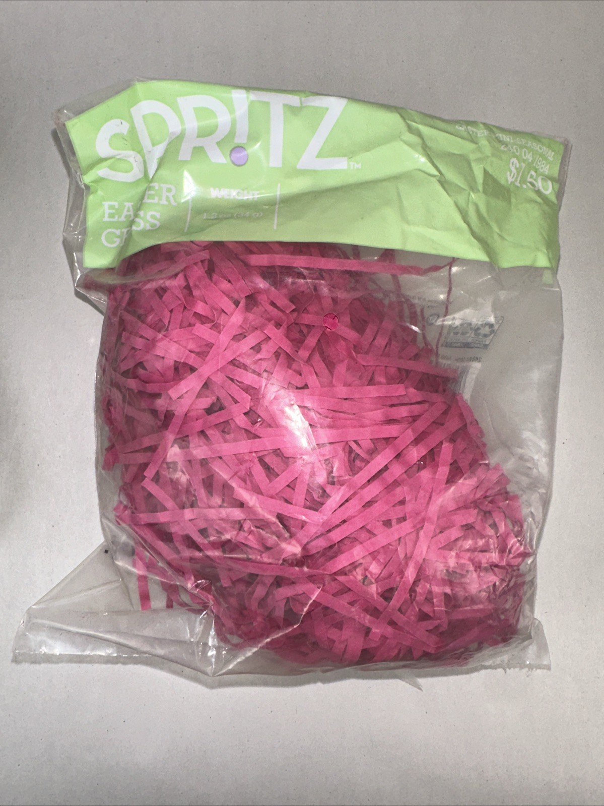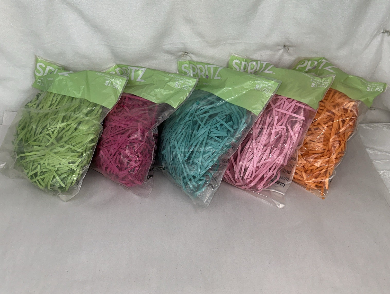 New, unopened.This product is a lot of 5 multicolored shredded paper Easter grass, perfect for gift packaging. The grass is pink and green, adding a festive touch to Easter gifts. It is ideal for creating gift baskets for Easter celebrations. The shredded paper adds a touch of whimsy and creates a festive atmosphere for gift-giving during the holiday. Perfect for Easter baskets or as a decorative element for gift presentations.