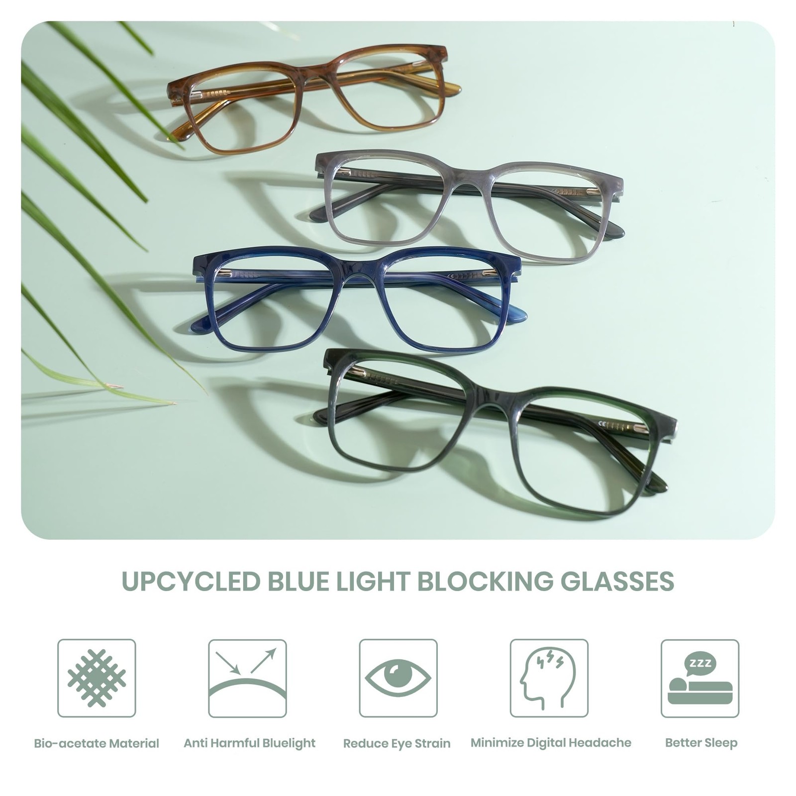 Upcycled Blue Light Glasses for Women or Men blue light glasses, made from upcycled bio-acetate materials, offer stylish options for a sustainable lifestyle that reduces environmental impact while providing reliable eye protection from harmful bluelight, PRODUCT INFORMATION FRAME MATERIAL: Bio-acetate Green Materials LENS MATERIAL: Polycarbonate / PC SHAPE: Classic Square/Round/Retangular/Cat-eye/Oversized Frame SIZES: Small-to-Medium, Medium, Medium-to-Large, Large COLORS: Black, White, Brown, Blue, Grey... STYLES: Trendy, Nerd Chic, Intellectual Style, Geek Chic, Casual, High-Intellect Look, Minimalist Ovals, Thick Black Frames, Oversized Square, Bayonetta Glasses, Soft Cat Eye, Bold Rectangular Glasses, Chic, Cool, Stylish, In style, Minimalist, Classic, Exotic... PACKAGE LIST -Upcycled Blue Light Blocking Glasses -Bluelight Blockers Test Card -Glasses Cloth -Triangular Box -Exquistie Package Case -Quality After-sales Service Whether you're a gamer, office worker, or a student, our blue light blocking glasses that stand the test of time, essential for anyone spending long hours in front of screens, helping to maintain clear vision and reduce the risk of eye fatigue For any questions about this sunglasses, please let us know~ We're here 24 hours a day for you. Green Anti-blue Blockers Technology: Our bold thick-framed blue light blocking glasses, made from upcycled molded plastic bio-materials, offer stylish options for a sustainable lifestyle that reduces carbon footprint while providing reliable eye protection from harmful bluelight Enhanced Eye Protection: Our blue light blocking glasses are designed to effectively filter out harmful bluelight from computer/gaming/screens/TV/phones, providing comfort and essential protection for your eyes during prolonged exposure to digital devices Reduce Eye-Strain & Better Sleep: Featuring advanced anti-blue blockers, these blue light glasses help reduce eye strain and fatigue, allowing you to work or enjoy leisure activities without discomfort, making them perfect for gamers, office workers, and students alike Stylish Bold Thicked Frame: Embrace a greener lifestyle with our thick-framed blue light blocking glasses. Build to last, this blue light glasses for woman or man with various face shapes, zero pressure to nose or ears, offering a comfortable fit for all-day wear without compromising on contemporary aesthetics Ideal for Digital Lifestyle: Whether you're a gamer, office worker, or a student, our blue light glasses anti-blue blockers that stand the test of time, essential for anyone spending long hours in front of screens, helping to maintain clear vision and reduce the risk of eye fatigue, , reducing waste and promoting a circular economy