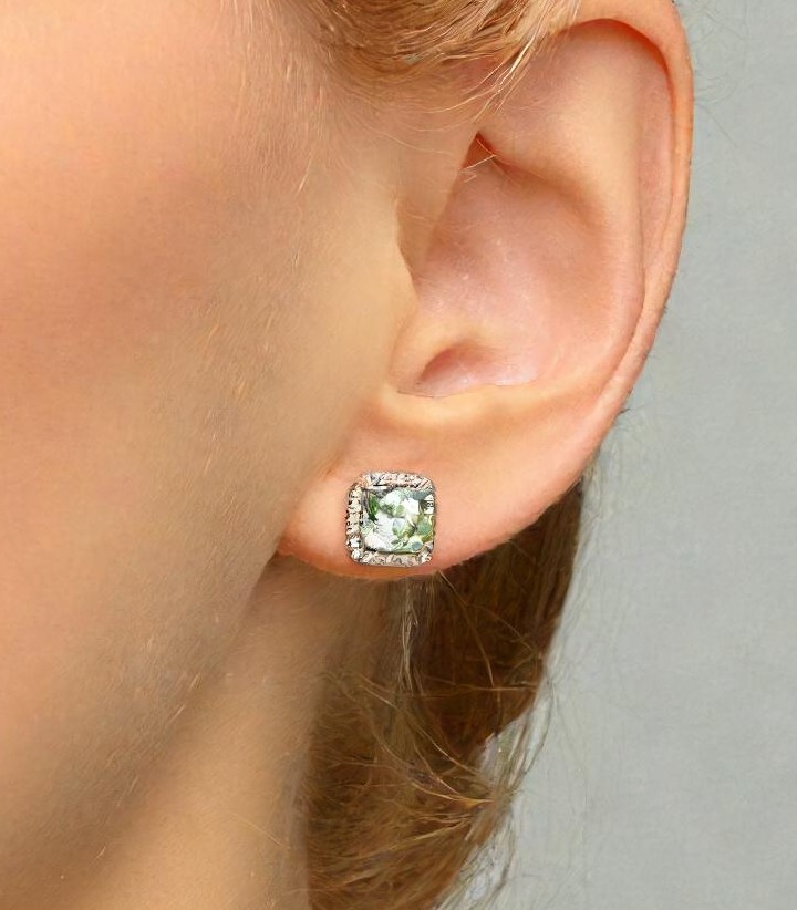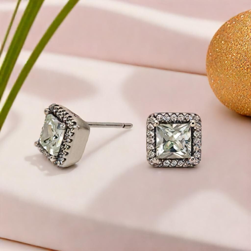 Make a statement with these square ear studs that offer the ideal amount of sparkle, combining timelessness and elegance. Featuring stunning Danube-cut cubic zirconia stones, each surrounded by a halo of smaller gems, these studs exude the charm of heirloom jewelry. Crafted from sterling silver, they reaffirm that the glamour of yesteryears is a style that transcends time. Whether you choose to make them your everyday signature or reserve them for special occasions, these studs are a reliable and sophisticated choice for accessorizing.