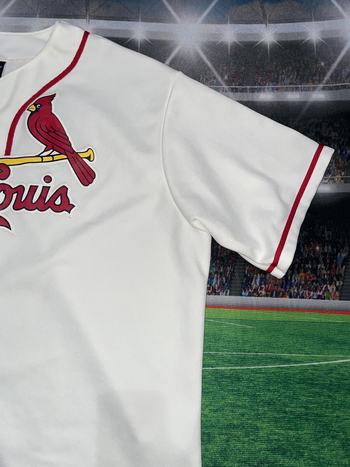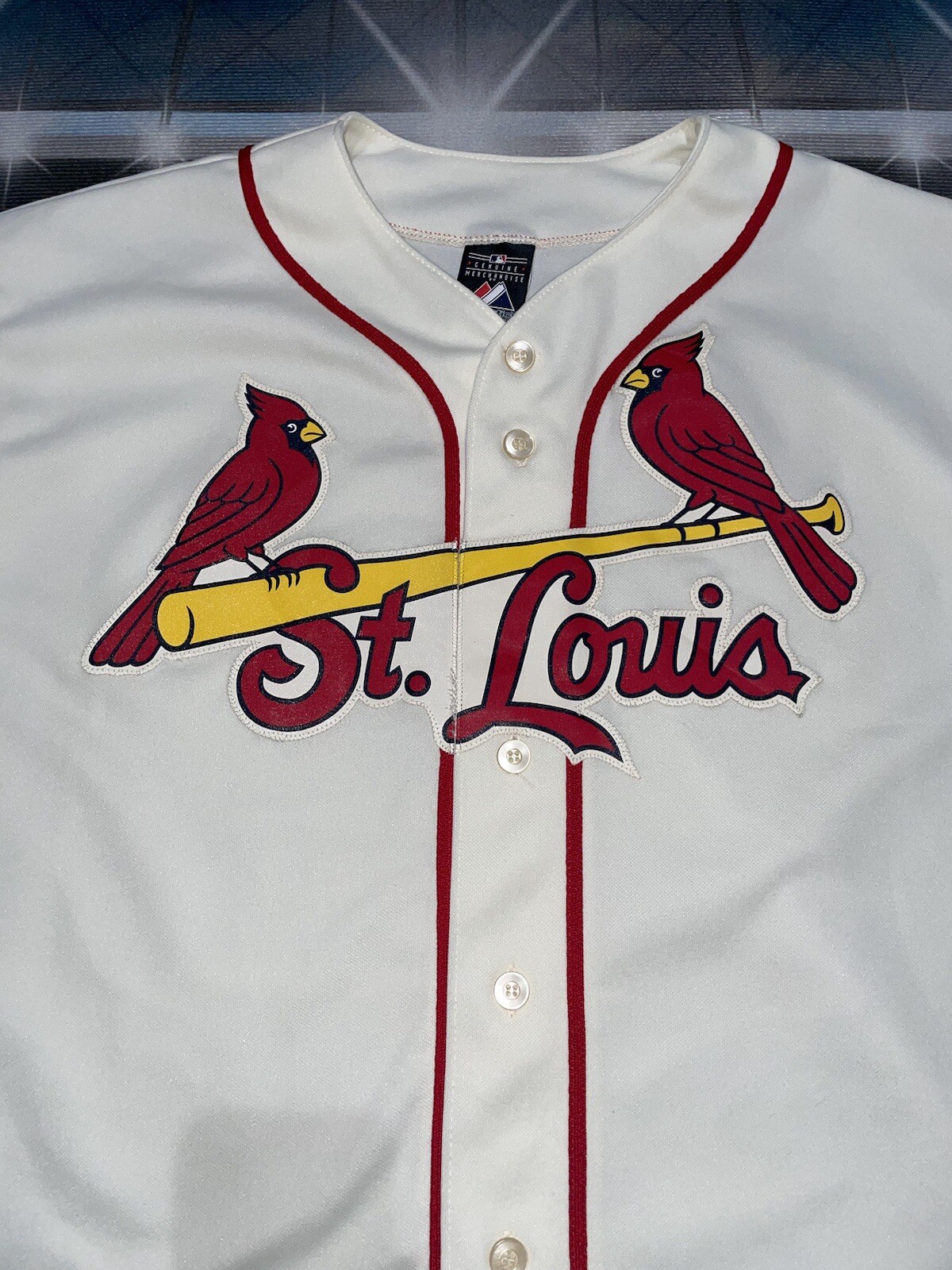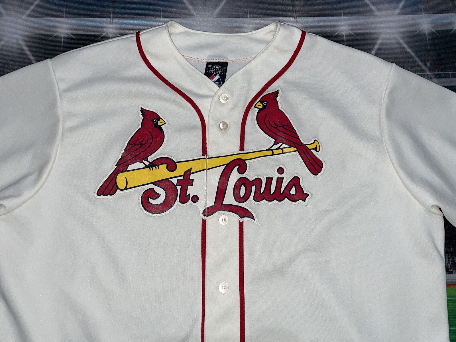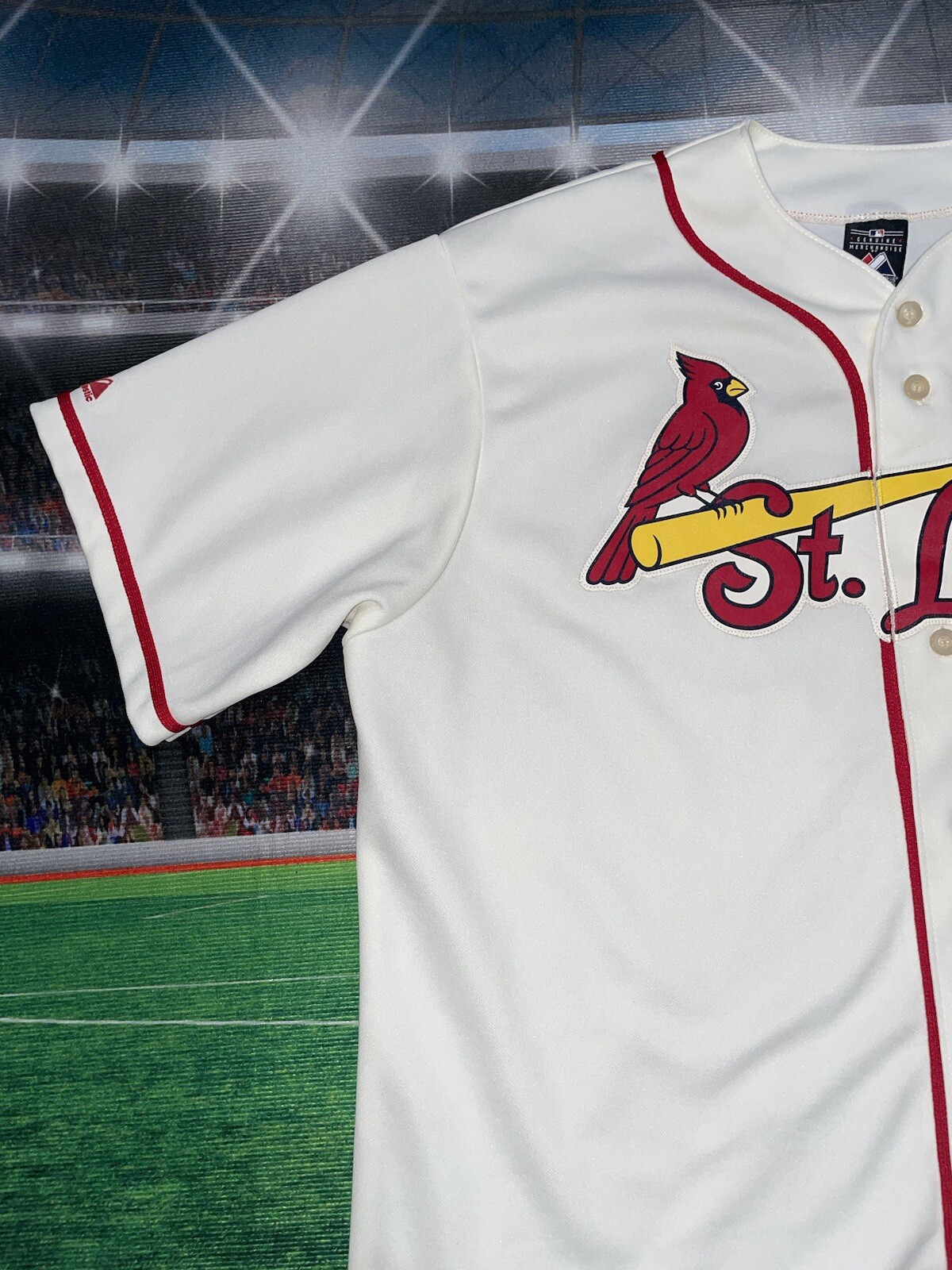 The product is a Majestic brand cream-colored jersey in size XL, officially licensed by the Major League Baseball (MLB) for the St. Louis Cardinals team. It is designed for men and is suitable for the regular season. The jersey is blank, making it versatile for fans to customize or wear as a classic piece of fan apparel. Perfect for showing support for the St. Louis Cardinals in a stylish and comfortable way.
