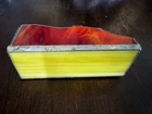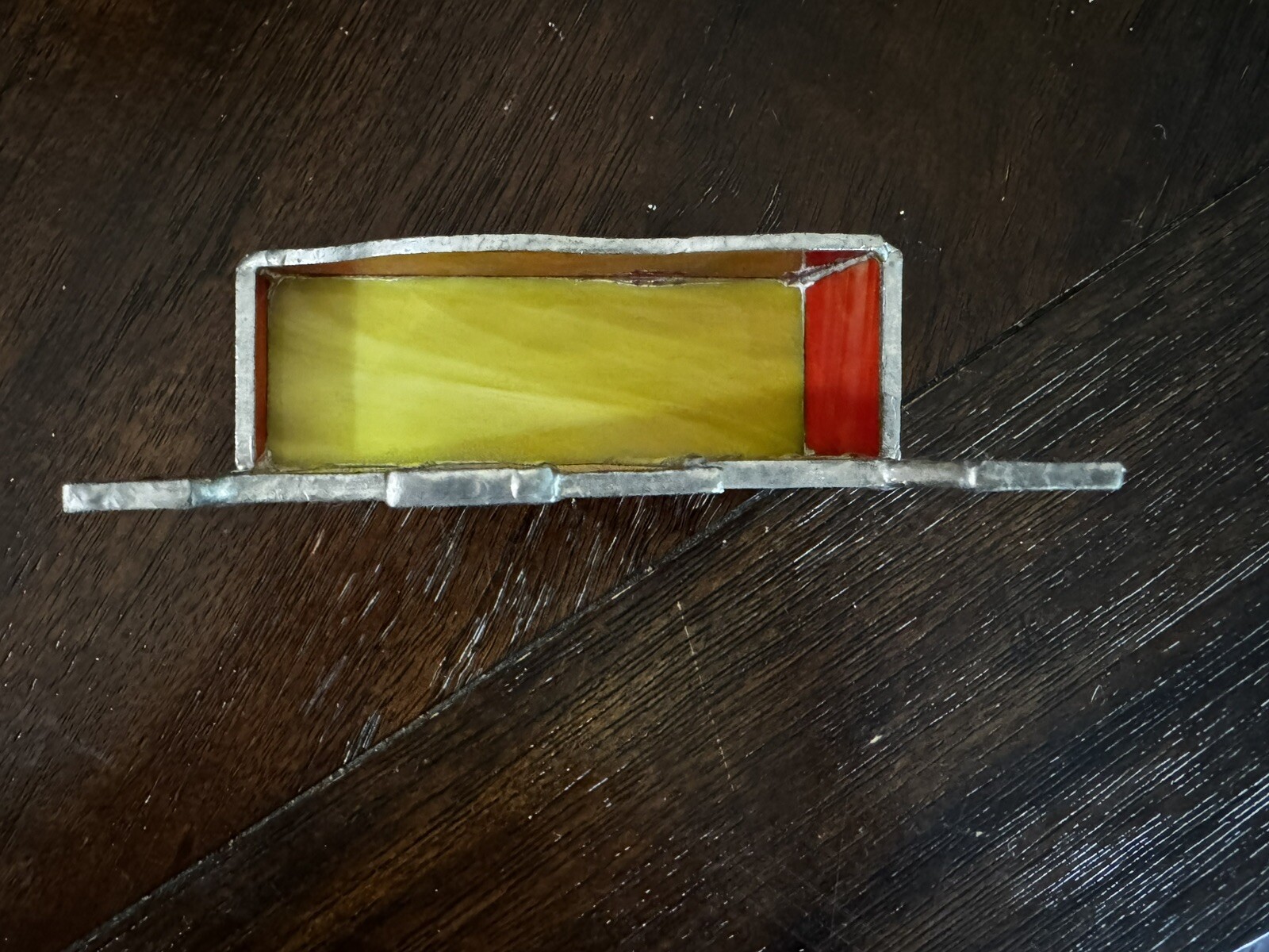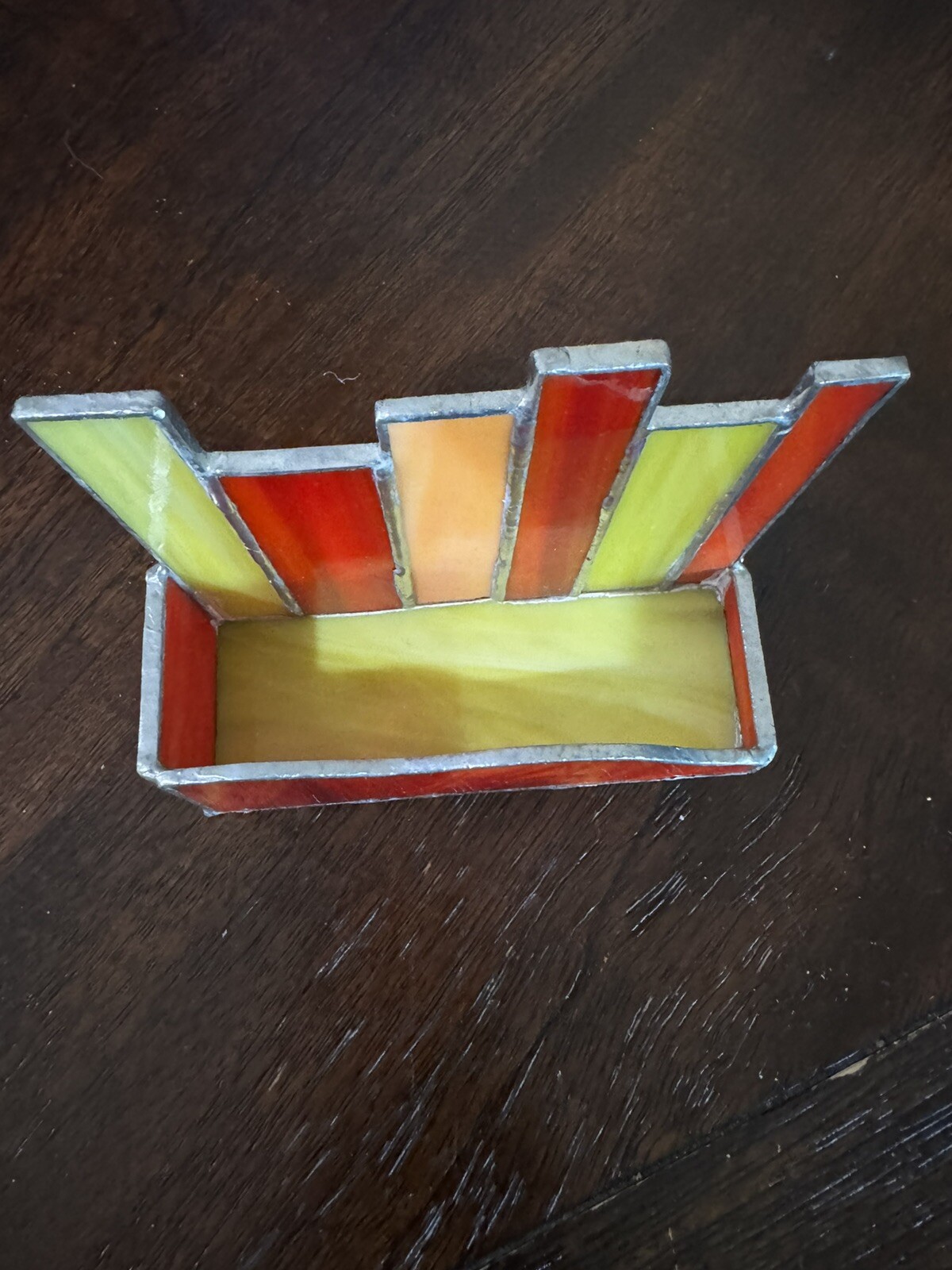 Beautiful and bright stained glass business holder. Purchased off of Etsy a few years ago, in perfect condition. Great addition to brighten up your desk. Measures 5 inches wide, by 4 1/2 half inches tall at the largest height and 2 inches depth. Stained glass.