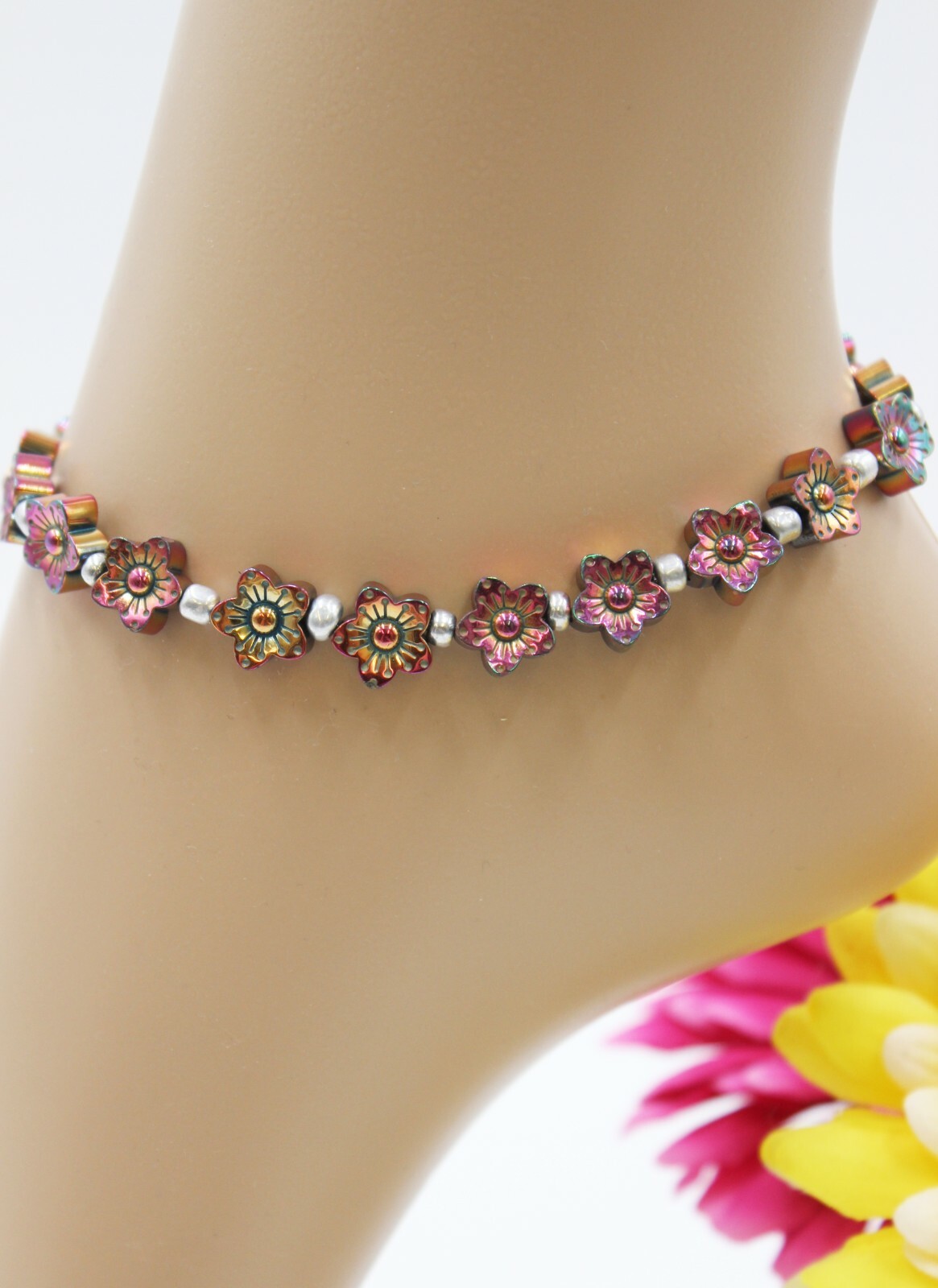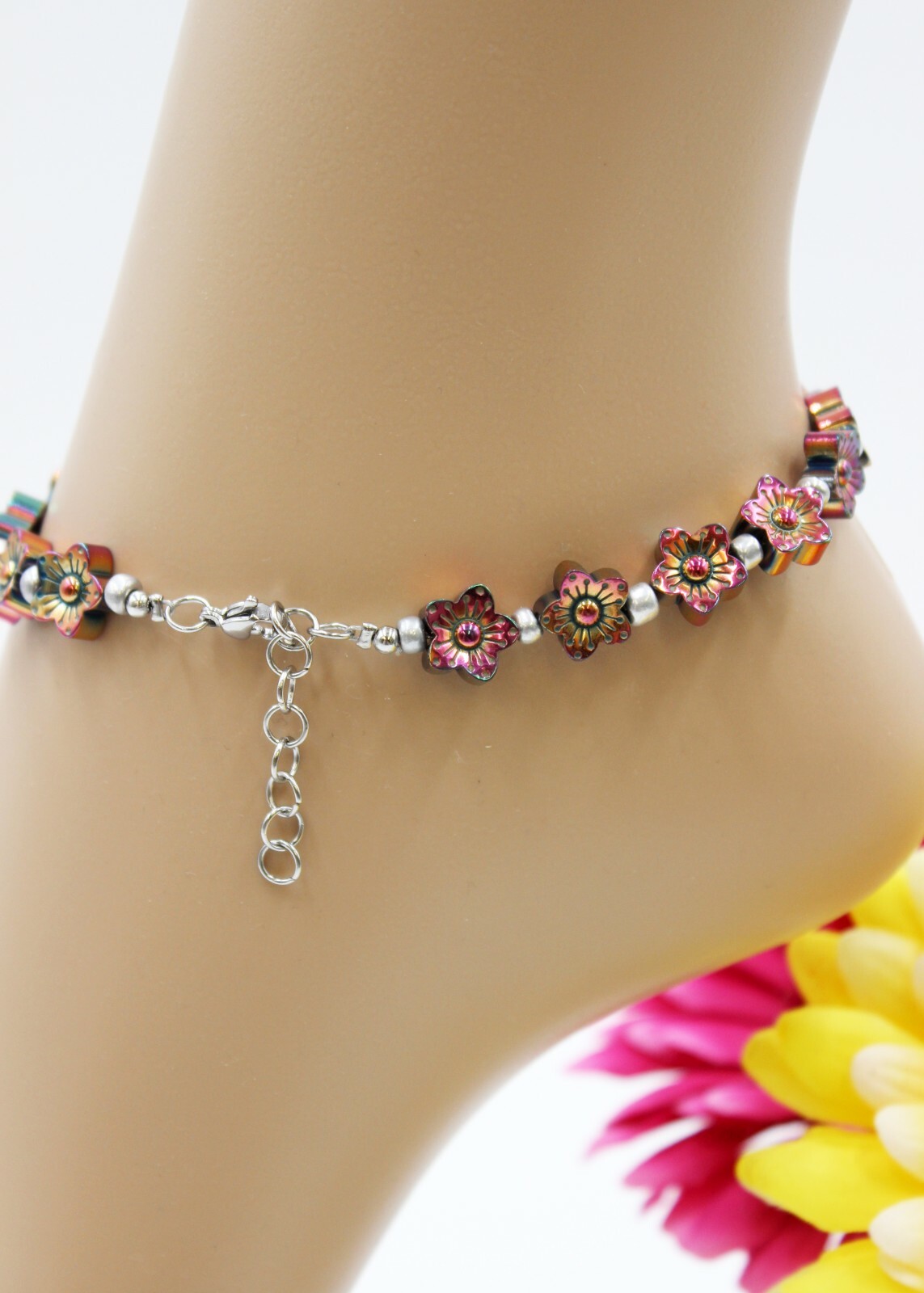 Love this anklet! The hematite flowers and silver beads add a delicate yet stylish touch—perfect for summer. The adjustable clasp ensures a comfy fit, and the stainless steel makes it safe for sensitive skin. Lightweight, elegant, and great quality—definitely a must-have accessory!