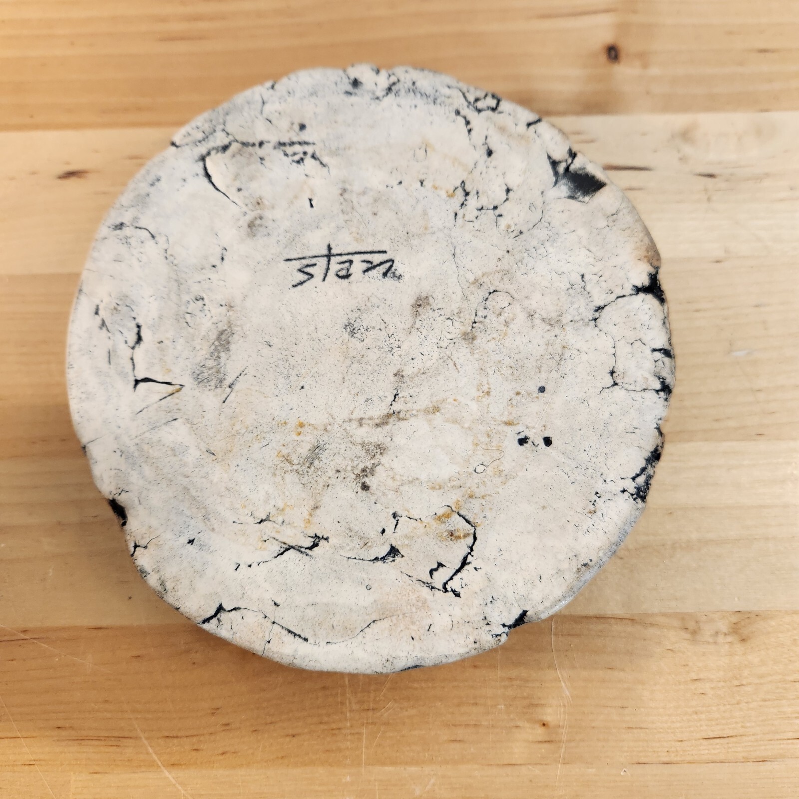 This dish has unique, natural ridges that make it one of a kind. A small fern was pressed into the center to leave a lasting, fossil-esque impression to further tie this piece of art back to its roots from the clay in Washington. While working as a logger, Stan Langtwait molded figures out of mud and clay. He made birds and animals and more. He then placed these shapes on tree stumps to dry and collected them at the end of the day. Starting in the 1950s, he created pottery known as "Shapes of Clay" at his factory in Graham, WA. After the eruption of Mount St. Helens in 1980, Stan incorporated ash from the mountain into his statues.